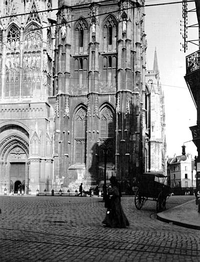 La cité canoniale, quartier accolée au nord de la cathédrale, comprend la cour des Libraires à l’est et la cour d’Albane au nord-ouest, ainsi que les bâtiments canoniaux qui la bordent. La cour des Libraires, délimitée par la cathédrale au sud et la rue Saint-Romain au nord, relie la rue Saint-Romain au portail nord du transept. En vue de ce portail, l’archevêque a cédé un terrain au chapitre, mentionné dans une charte du doyen Philippe d’Imbleville datée du Jeudi Saint 1281. La construction du portail impliqua la démolition de la chapelle Sainte-Marie, dont subsistent le portail intégré au cloître et l’abside dans la cour de la Maîtrise. Le portail des Libraires est attribué à Jean Davy.