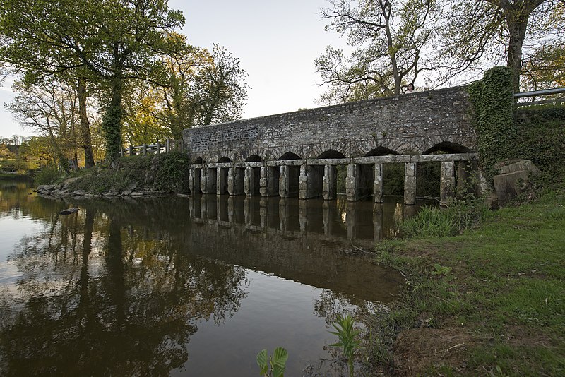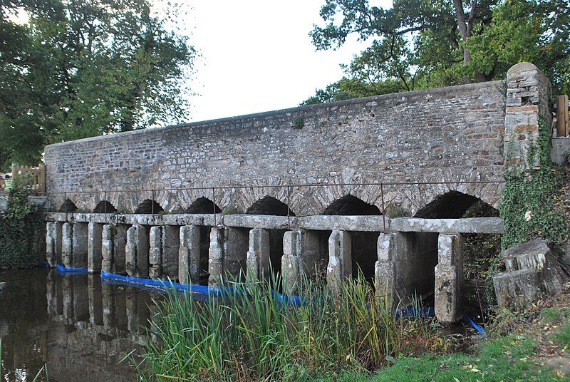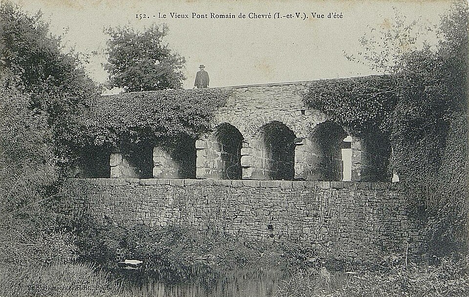 L’ensemble fortifié de la chapelle et du pont de Chevré constitue les vestiges d’un bourg castral des XIIe‑XIIIe siècles, situé au lieu‑dit Chevré sur la commune de La Bouëxière, au sud‑ouest de l’étang de Chevré, sur la route reliant Liffré et La Bouëxière à environ 1 900 mètres de cette dernière. Le pont, la chapelle et les ruines du donjon sont inscrits au titre des Monuments historiques depuis 1995. La motte, attribuée à la maison de Vitré et datée du XIIe siècle, porte les vestiges d’un donjon de pierre élevé au début du XIIIe siècle par André III de Vitré ; elle est entourée d’un large fossé. La motte mesure onze mètres de haut pour un diamètre de trente‑huit mètres ; le fossé qui l’entoure atteint environ seize mètres de largeur et cinq mètres de profondeur. Les sources divergent sur la forme et les dimensions du donjon : Paul Banéat le décrit comme un ouvrage de pierre élevé sur trois étages, haut d’environ dix‑huit mètres, tandis que Michel Brand’honneur le présente comme une tour circulaire d’un diamètre externe proche de quinze mètres et d’une hauteur moindre. Le donjon fut attaqué et incendié par les hommes du duc de Bretagne au début du XIIIe siècle, puis André III obtint l’autorisation de rétablir ses fortifications en 1237 à la suite d’une médiation royale ; les ruines servirent plus tard de carrière au XVIIIe siècle, d’où ne subsiste qu’un pan de mur. La chapelle castrale, liée à la motte, remonte probablement au dernier quart du XIIe siècle ; elle a conservé sa façade pignon et des portions de murs, mais a été remaniée aux XVIe et XVIIe siècles. Construite en grès et de style roman, la chapelle se compose d’une nef à chevet droit et présentait des ouvertures réduites, dont deux meurtrières sur la façade ouest, une sur la face nord et une au chevet est. De larges campagnes de restauration au XVIe siècle ont laissé une charpente et un monogramme en tuffeau daté de 1550, attribué à un membre de la famille des Montmorency‑Laval ; un lambris peint du chœur daté de 1643, représentant les quatre Évangélistes, était encore signalé au début du XXe siècle mais a aujourd’hui disparu. Deux plaques funéraires en faïence de Rennes provenant de la chapelle et conservées au musée archéologique de Rennes mentionnent Laurent Lemarchant, seigneur de la Touche (décédé le 7 décembre 1679) et Péronelle Angélique de la Hurerie (décédée en avril 1681). Le pont dit « roman », en réalité daté du XIIIe siècle et placé sur un tracé antique, mesure quinze mètres de long sur 4,40 mètres de large ; il est constitué de sept arches en arc brisé voûtées en claveaux et blocage de grès, reposant sur des piles composées de trois ou quatre assises de gros blocs de granite. Des traces de scellement dans les dalles du radier laissent supposer le remploi de matériaux provenant d’un édifice antérieur. Côté ouest, le pont enjambe le déversoir de l’étang à l’endroit où la Veuvre reprend son cours ; il est adossé côté est à une ancienne pêcherie formée de sept pilastres en granit, équipés de coulisses pour le passage de vannes lorsqu’elle était en service. Le village de Chevré, siège d’une châtellenie exerçant la haute justice, s’est développé très tôt autour de la fortification et de l’étang ; au XIIIe siècle s’y tenait un important marché hebdomadaire le mardi. L’habitat actuel comprend plusieurs logis de la Renaissance et du XVIIe siècle, ainsi que des constructions remarquables non protégées au titre des monuments historiques, telles que la maison dite « du Sénéchal », d’origine XVe siècle remaniée aux XVIe et XXe siècles, et le manoir de la Colinière, profondément transformé mais conservant une gerbière datée de 1629 ; un ancien auditoire et sa prison, signalés autrefois à la sortie du village, ont été démolis au début du XXe siècle.