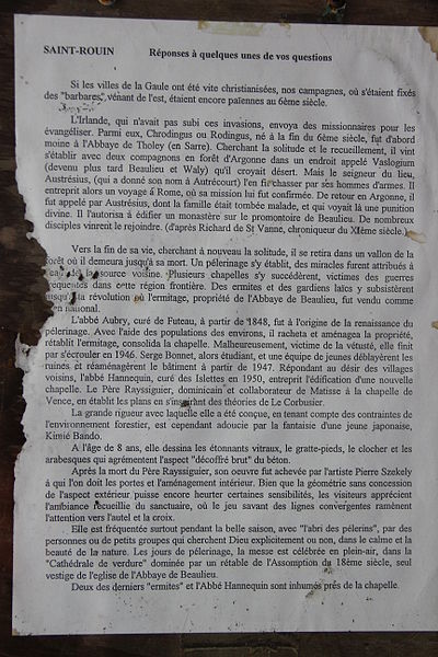 La chapelle de Saint-Rouin se situe à Beaulieu-en-Argonne (Meuse), au nord-ouest du village, au cœur de la forêt d'Argonne. Elle a été reconstruite de 1954 à 1961 à l'emplacement d'un oratoire du XVIIe siècle et de l'ancien ermitage où vécut Saint-Rouin, fondateur de l'abbaye de Beaulieu-sur-Argonne. L'édifice, conçu comme un autel central, a été réalisé par le père Louis-Bertrand (L.-B.) Rayssiguier, architecte du couvent du Saulchoir, disciple de Le Corbusier et co-auteur de la chapelle de Vence. Il a été consacré le 22 mai 1961. Le gros œuvre en béton brut de décoffrage a été confié à l'entreprise Berthold de Dun-sur-Meuse. De plan trapézoïdal, le bâtiment présente un volume cubique porté sur pilotis et percé de baies au tracé géométrique; la couverture en terrasse est dominée par un campanile. Au pied du campanile se dresse une croix en aluminium haute de sept mètres. Les vitraux au plomb, réalisés en 1959 d'après des dessins de Kimié Bando — alors âgée de dix ans et fille du peintre japonais Toshio Bando — se déclinent en panneaux circulaires, triangulaires et carrés. L'aménagement intérieur a été réalisé par le sculpteur Pierre Székely, qui a conçu l'autel, la porte, la croix, le confessionnal, le sol et le bénitier. Un retable du XVIIe siècle, situé dans l'enclos, a été classé en 1972. La chapelle a été inscrite au titre des monuments historiques par arrêté du 20 novembre 1998.