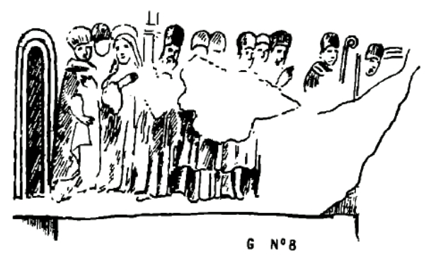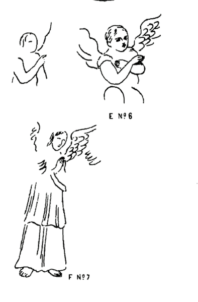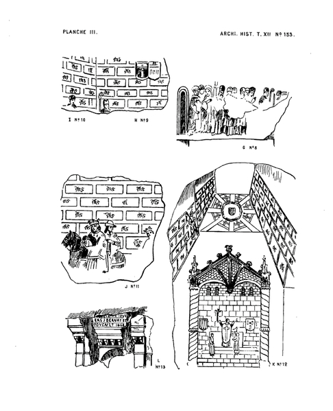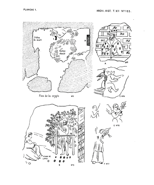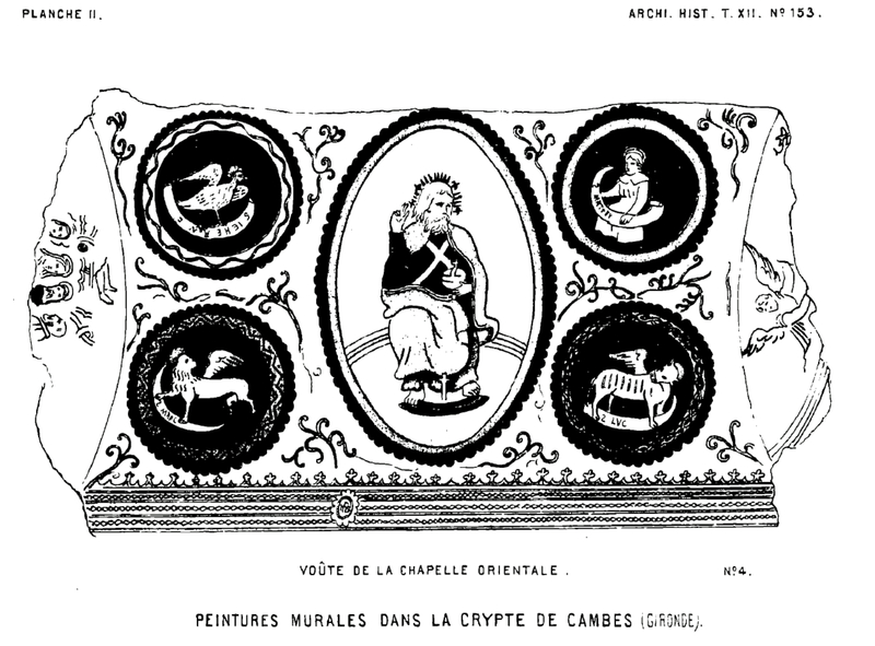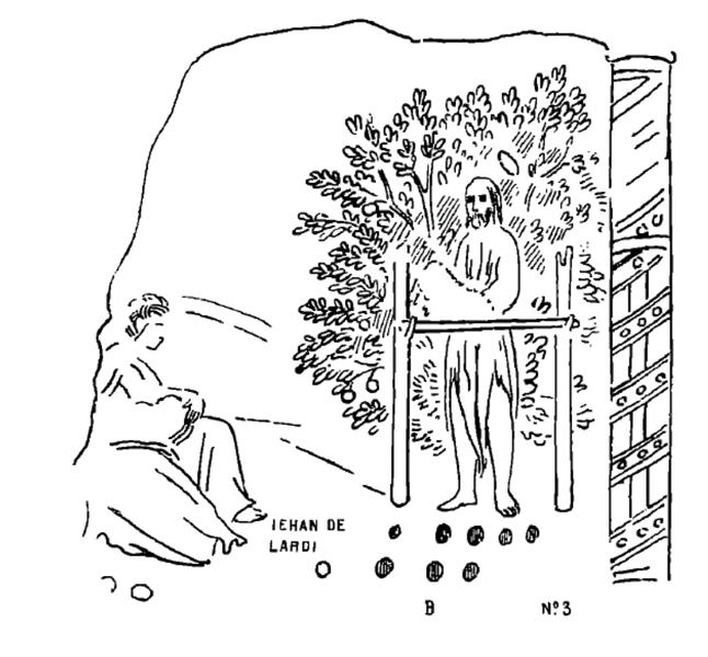 D'autres peintures occupent les murs selon un plan figé par les lettres A à L. À droite (A) est représenté un personnage barbu en vêtement bleu semé de fleurs de lis, rappelant les portraits de François Ier ; à côté (B) apparaît une figure nimbée d'un homme se présentant à une femme assise, peut‑être l'apparition de Jésus à Marie de Magdala sous la figure d'un jardinier ; on lit en dessous l'inscription JEHAN DE LARDI, probablement le nom d'un donateur. Près de ce groupe se remarque un ange (C). Des fragments d'anges (E et F) ont été rejetés par un éboulement hors de leur emplacement d'origine. Au‑dessus d'une maçonnerie sont peints une suite d'évêques et de religieux en draperies rouges et bleues (G). Sur le mur nord, au‑dessus d'un autel enfoui, figurent plusieurs assises de maçonnerie dont chaque pierre porte le monogramme IHS et deux écussons accolés indiscernables (H et I). Du même côté, trois têtes de morts sont associées à trois personnages à cheval, dont l'un porte une robe bleue garnie d'hermine, motif proche du Dit des trois morts et des trois vifs (J).