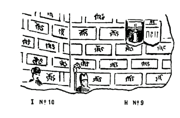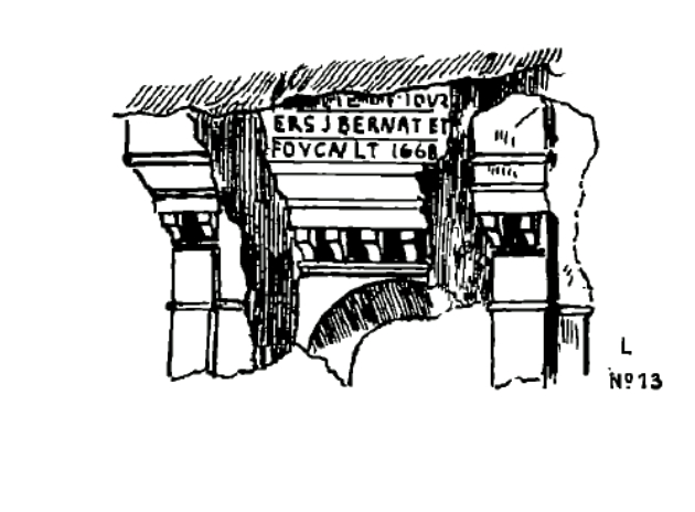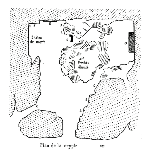L'étroit couloir d'entrée orienté au sud‑ouest est décoré de peintures bien conservées montrant à gauche un intérieur d'église du XVIe siècle où un prêtre, aidé de deux acolytes, célèbre la messe ; l'autel y est flanqué d'écussons dont l'un porte d'azur à trois tours d'argent avec une quintefeuille ou une molette en abîme (K). Dans un retrait du mur du couloir figure un pèlerin avec bourdon et coquilles, probablement le portrait du seigneur de Fouilloux. Un portique ou tombeau porte une inscription dont on ne distingue que les derniers mots BERNAT ET FOUCAULT et la date 1668 ; un fragment de statue, sans doute de sainte Catherine, provient de l'ancien décor au‑dessus de la porte (L). Le soubassement de la crypte est décoré de lignes de maçonnerie avec le monogramme IHS sur chaque pierre.