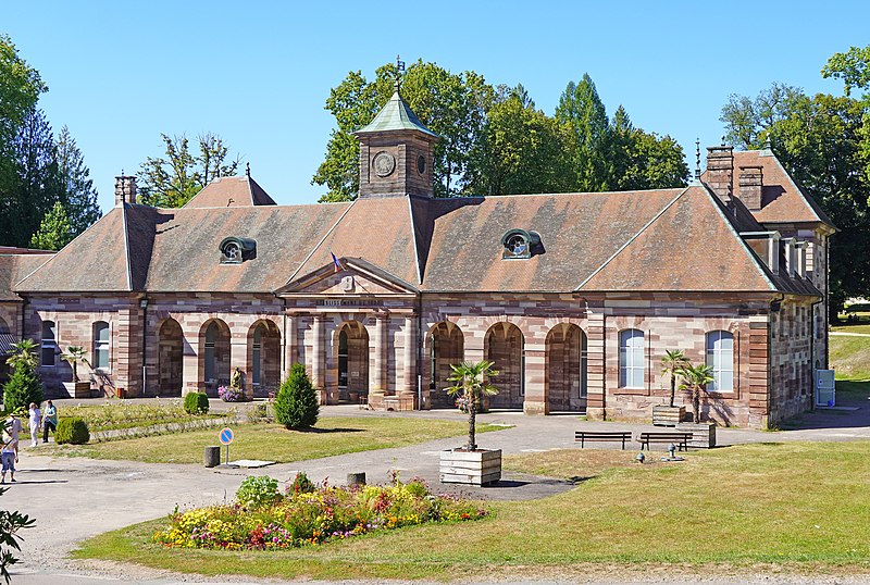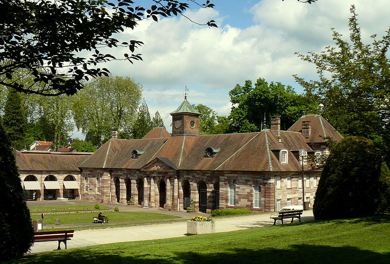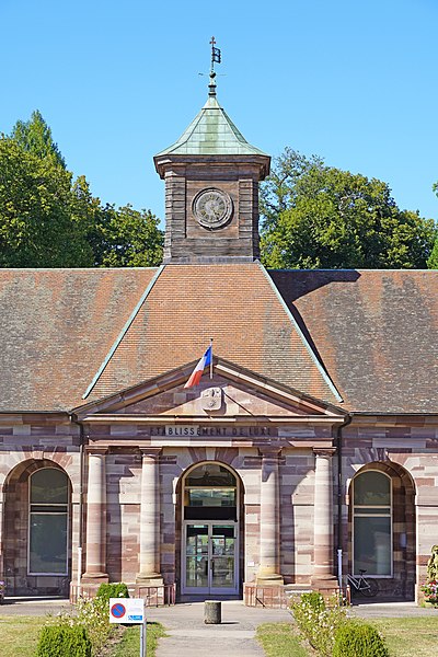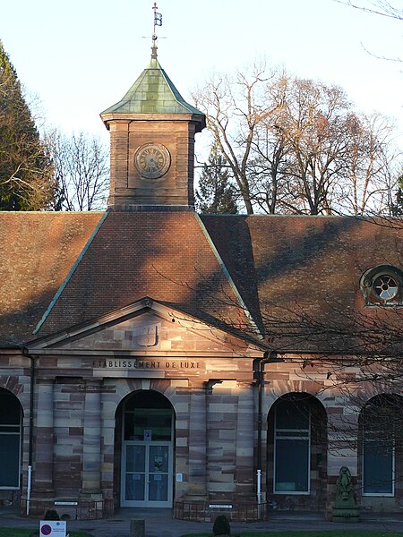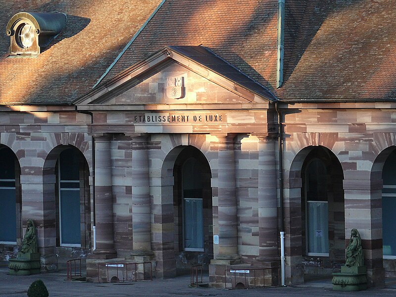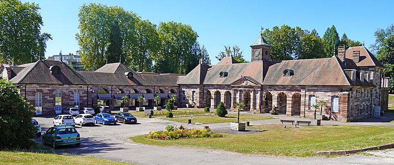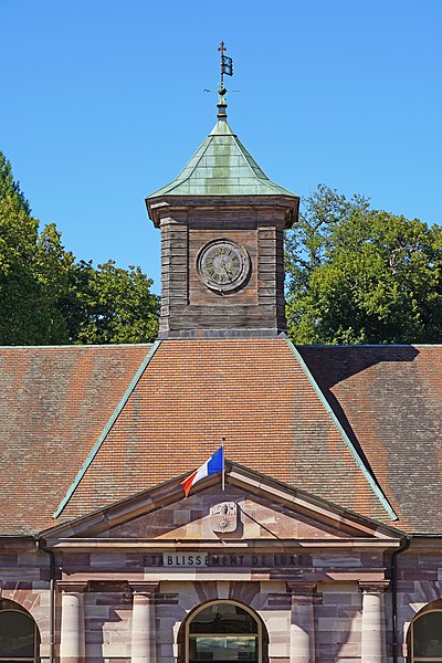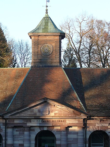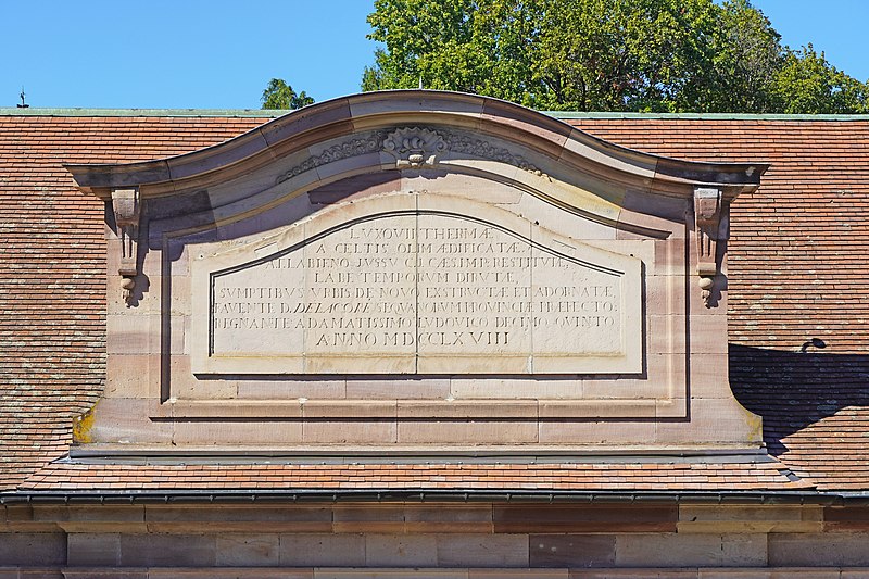 L'établissement thermal de Luxeuil-les-Bains, situé dans la commune éponyme en Haute-Saône, est géré par la Chaîne Thermale du Soleil. Les eaux, issues de deux forages nommés Dr Pierrat et Soleil, sont hyperthermales (50 °C et 60 °C) et se caractérisent par un profil chloruré sodique, bicarbonaté, sulfaté, siliceux et une richesse en oligo-éléments. Les cures sont principalement prescrites pour des affections de la phlébologie, gynécologiques et rhumatismales; les thermes et leurs eaux bénéficient d'une renommée nationale. L'exploitation des sources remonte à l'époque de la conquête romaine ; une tradition, toutefois contestée, attribue au général Labienus des travaux de remise en état des thermes. Les sources furent ensuite perdues lors des grandes invasions qui entraînèrent la désaffection des bains antiques. Les bâtiments actuels trouvent leur origine dans des reconstructions commencées au milieu du XVIIIe siècle ; l'établissement, d'architecture classique en grès rose des Vosges, a été inauguré en 1768. Entre 1765 et 1769 furent édifiés deux bâtiments sur les sources et bassins anciens d'après les plans de Jean Querret, puis, de 1775 à 1786, ces deux corps furent réunis par une galerie marchande conçue par les ingénieurs Bertrand et Lingée. Sous le Second Empire la station prit de l'ampleur : la ville céda la concession à l'État en 1853, des agrandissements furent réalisés — en 1855 pour le grand bain au nord selon le projet de l'architecte Monnier, puis en 1858 par un bâtiment semi‑circulaire dit bain ferrugineux impérial — et Napoléon III séjourna sur place en 1856 avec l'impératrice Eugénie, ce qui contribua à la relancer. Un parc régulier, créé au XVIIIe siècle et agrandi sous le Second Empire, fut transformé en parc paysager par l'horticulteur Auguste Napoléon Baumann ; il contenait alors dix‑huit sources captées, dont la Fontaine d'Hygie, déclarée d'intérêt public en 1858 et commercialisée. Au début du XXe siècle la station connut un fort prestige mondain ; des artistes et personnalités comme Sacha Guitry ou Yvonne Printemps fréquentèrent le lieu et de nombreux grands hôtels et villas furent construits. La municipalité récupéra les thermes en 1936 ; entre 1937 et 1939 des transformations importantes et un agrandissement au nord furent réalisés sur le projet de Robert Danis et exécutés par l'architecte Paul Giroud, tandis qu'une piscine thermale moderne fut construite en 1938-1939. Après une période hésitante, l'activité thermale a connu un renouveau au XXe siècle : le nombre de curistes a atteint 2 000 en 1954, puis 3 000 dix ans plus tard, et la population de la ville augmente encore sensiblement pendant la saison estivale. L'édifice bénéficie de protections au titre des monuments historiques, avec des classements en 1862 et 1942 et une inscription en 2011.