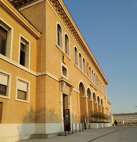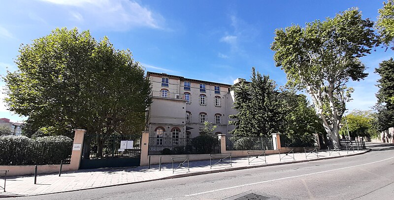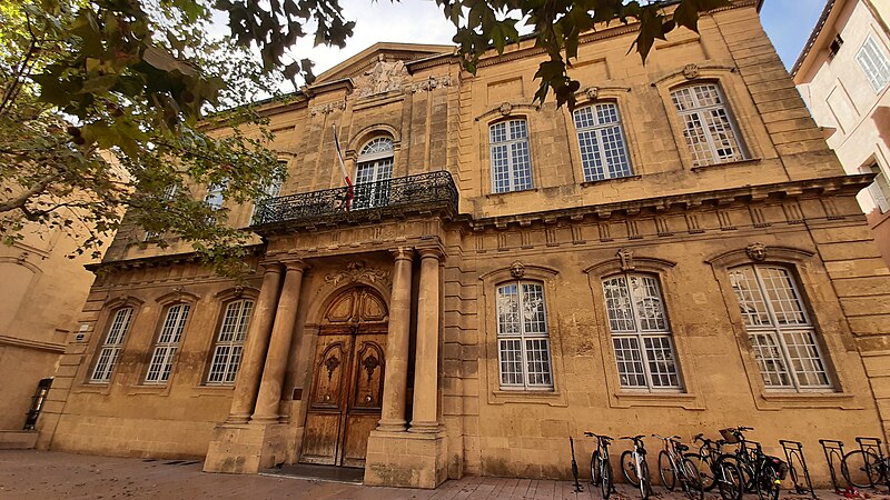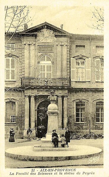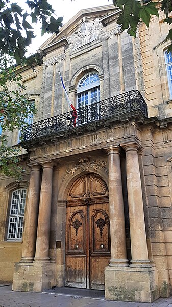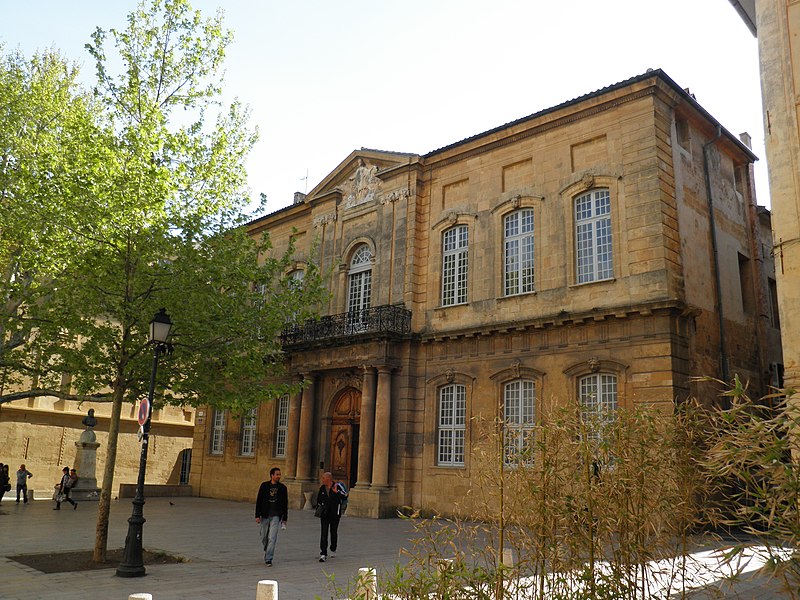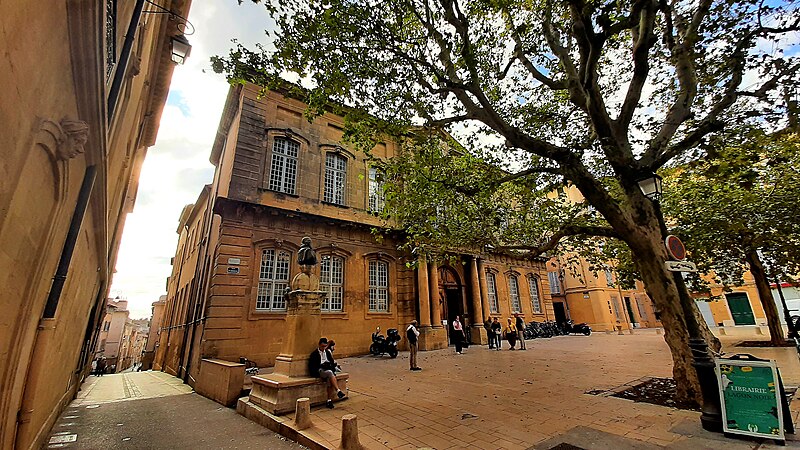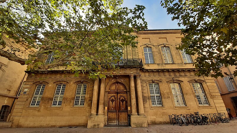 Le bâtiment principal, conçu par Fernand Pouillon, mêle références à la Renaissance italienne et aux formes des années 1930 ; l'architecte qualifia toutefois par la suite l'ouvrage d'"imitation monstrueuse de la villa Médicis à Rome". De 1955 à 1966 il abrita à la fois la faculté de droit et celle de lettres, situation attestée par les frontons sculptés des deux portes portant les inscriptions "faculté lettres" et "faculté droit". Parmi les vestiges de cette cohabitation figurent la mosaïque La Source (1953) de Ram Rischmann, dans le patio, qui représente les poètes allant puiser l'inspiration à la source Hippocrene au pied du Mont Hélicon fendu par Pégase. Le hall porte le nom de "Salle des pas perdus" et l'amphithéâtre David, au premier étage, présente deux grands bas-reliefs réalisés par le sculpteur aixois Séraphin Gilly.