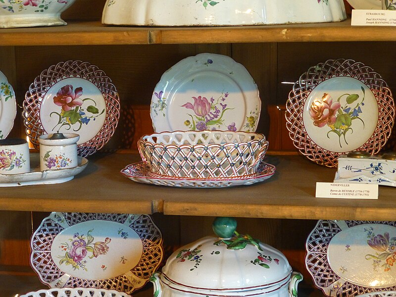 La faïencerie de Niderviller, fondée en 1735 en Moselle, est l'une des plus anciennes manufactures de Lorraine et l'une des trois dernières encore en activité parmi la trentaine créée au XVIIIe siècle. Installée sur un site riche en argile et bois, elle a tiré parti de sa proximité avec l'Allemagne pour associer savoir‑faire saxon et influences artistiques françaises, ce qui a valu à certaines de ses productions des comparaisons avec la Manufacture de Sèvres. La première phase de production utilisa la technique du grand feu et des décors inspirés de la faïence de Rouen ; après un incendie au milieu du siècle, la manufacture fut reconstruite et introduisit le petit feu, augmentant la finesse des décors floraux naturalistes et des ornements rocaille. Sous la direction de Jean‑Louis Beyerlé, la manufacture recruta des artisans d'Alsace et de Saxe et chercha à rivaliser avec les grandes manufactures de l'époque, ce qui provoqua des tensions avec les autorités et la manufacture de Sèvres en raison de la production de porcelaine dure. La manufacture développa des décors variés — bouquets influencés par Jean‑Baptiste Monnoyer, motifs d'origine allemande dits chatironnés, imitations de veines de bois — ainsi que des figurines et des séries plus populaires, parfois inspirées des modèles de la production royale.