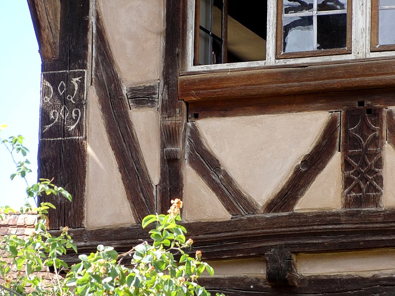 Le logis, implanté perpendiculairement à la rue et en retrait derrière un jardinet et un mur, porte sur un poteau cornier le millésime 1599. Entièrement en pan de bois sur un soubassement maçonné crépi, il présente un étage en léger encorbellement sur trois côtés, un colombage à poteaux avec goussets et liens pleins en chevrons, et un pignon-loggia vers la rue sous une toiture en demi-croupe. La chambre d'angle de l'étage est éclairée par deux fenêtres aux chambranles saillants et sculptés de motifs géométriques en relief. Le perron d'entrée, côté cour, est desservi par un escalier en grès et protégé par un auvent ; la balustrade en bois date du XVIIIe siècle. Deux fanions en tôle, datés de 1607 ou 1609, figuraient autrefois sur le faîtage. L'arrière du rez-de-chaussée, maçonné vers 1920, a été remplacé par une façade à pan de bois dans le style du début du XVIe siècle ; diverses parties très dégradées (toiture, éléments de la balustrade du porche, certaines poutres, supports de fenêtre, sablière arrière) ont été refaites lors d'une rénovation menée en 2012-2013.