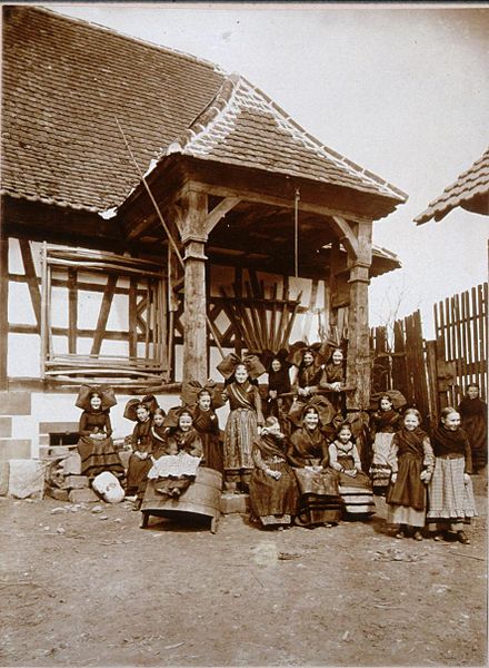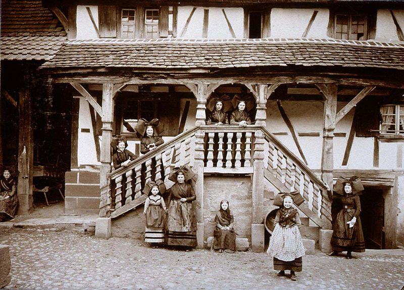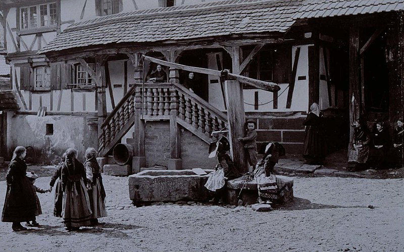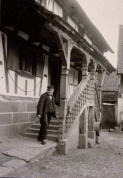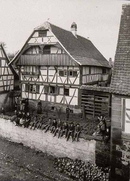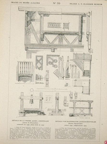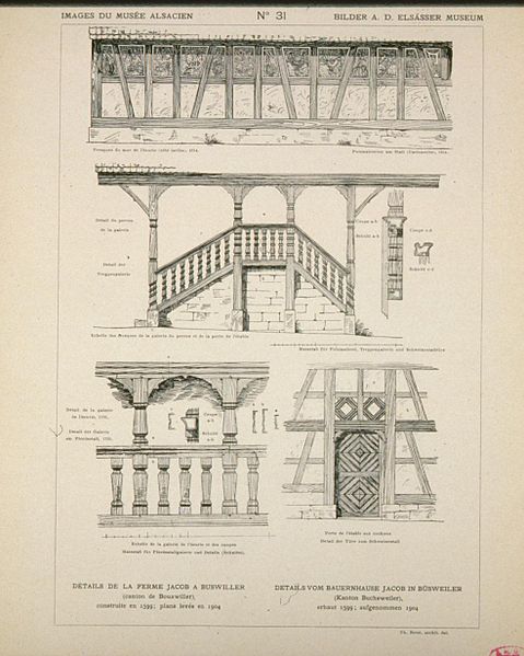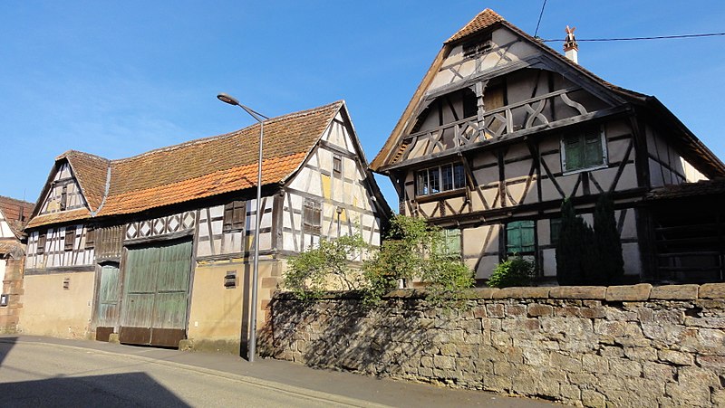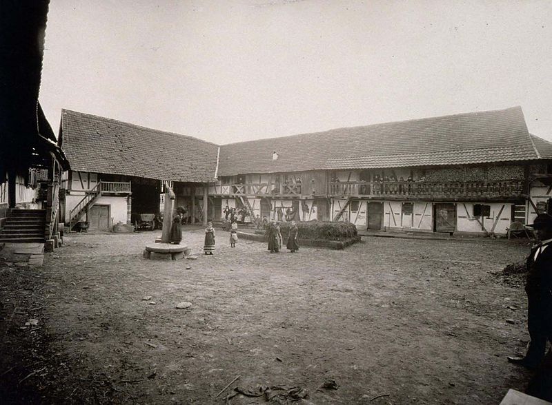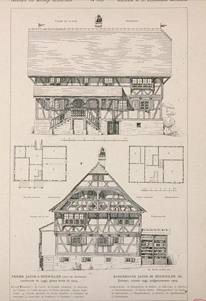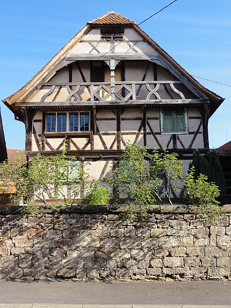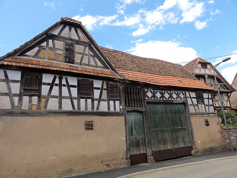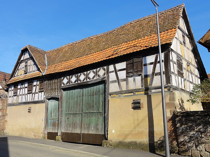 La grange, reconstruite en 1836 pour Iohannes Jacob et Anna Rueff d'après des inscriptions sur une traverse et sur la porte du cellier, occupe le fond de la cour parallèlement à la rue. Ses pignons présentent des décorations grattées dans le crépi (Kratzputz) avec des motifs floraux tels que la tulipe, symboles liés à la fécondité ; le cellier, à une extrémité, s'ouvre par une porte en plein cintre précédée d'un escalier abrité sous un toit à croupe reposant sur des poteaux formant un porche. La cour est fermée par un corps de passage construit en 1804 dont le mur gouttereau donne sur la rue ; ce bâtiment en colombage combine un espace ouvert avec porte piétonne et porte charretière ornée de losanges et une partie fermée en maçonnerie et colombage qui abritait une distillerie et une buanderie au rez-de-chaussée. Le puits, situé devant le logis et la buanderie-distillerie, est couvert. Le pignon du logis a été restauré à l'identique par des bénévoles. La ferme est aujourd'hui plus ou moins à l'abandon.