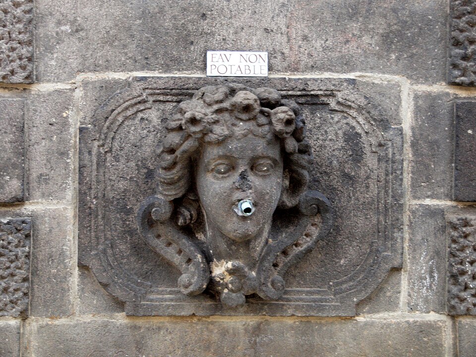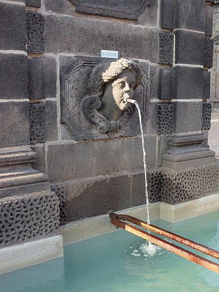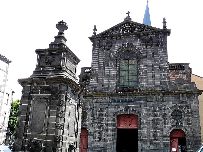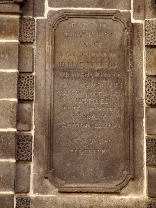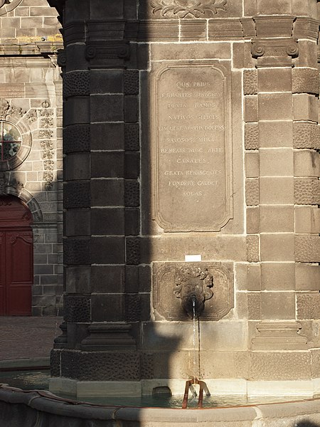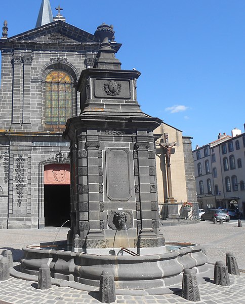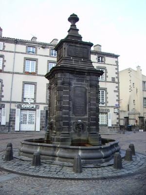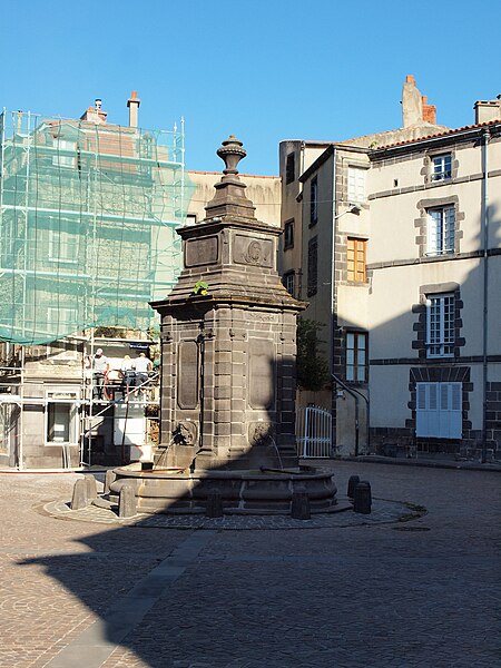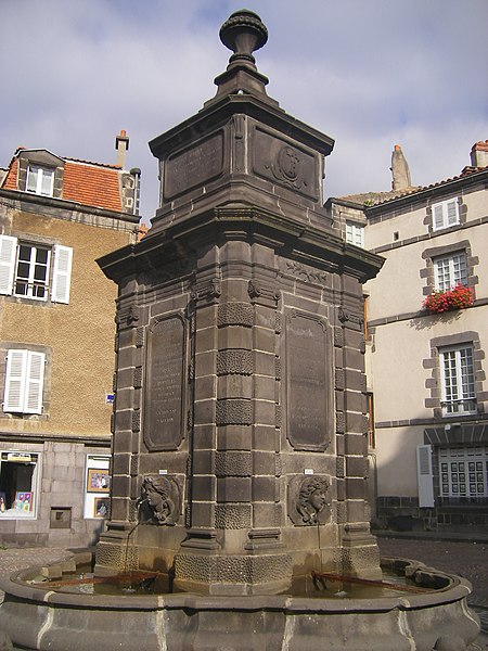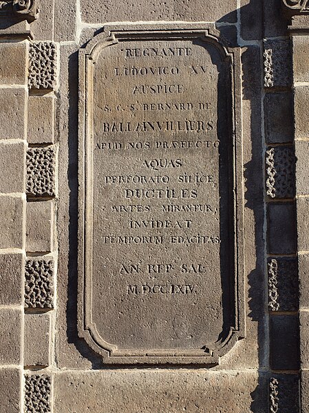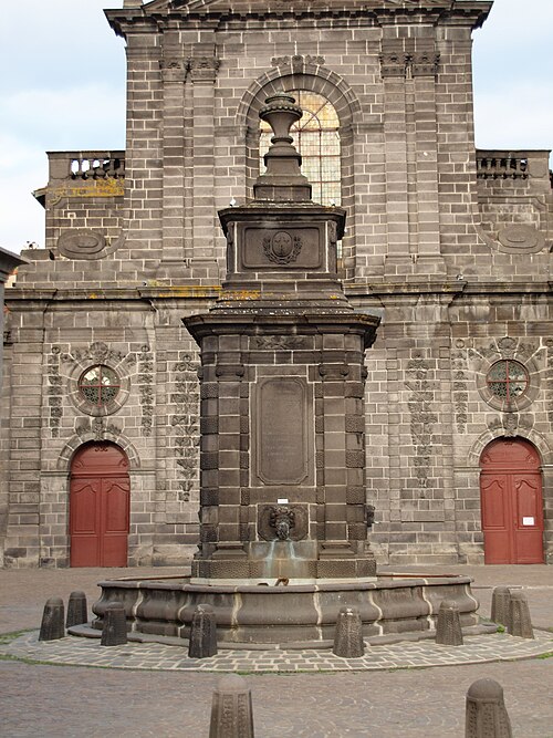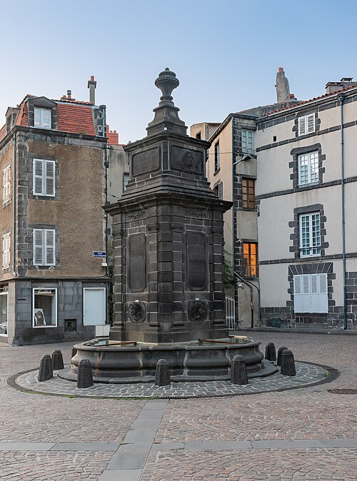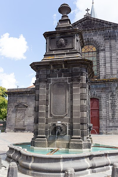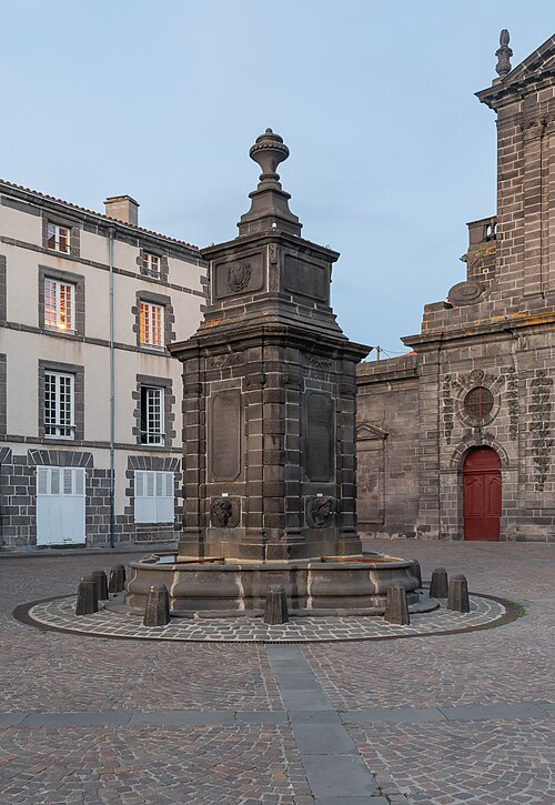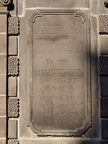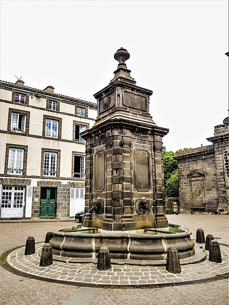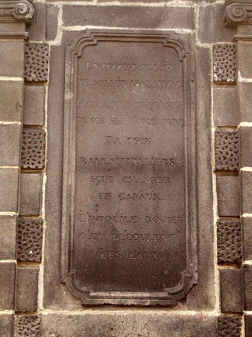 La fontaine Balainvilliers, située au centre de Riom sur la place de la Fédération devant la basilique Saint‑Amable, a été élevée en 1764. Elle a été réalisée à l'initiative de l'intendant Bernard de Ballainvilliers et placée au milieu du parvis, sur un emplacement tout juste dégagé du cimetière. La construction a été conduite par le fontainier Philibert Chaper, sous la direction de l'architecte Claude‑François Legay, et sous le contrôle du consul Vissac ; une inscription sur la face sud en rappelle l'exécution. L'ouvrage se présente comme un massif de plan carré, orné sur chacune de ses faces de pilastres ioniques et encadrant de longues inscriptions en latin ou en français. Le couronnement de la fontaine est caractéristique de l'époque. En 1796, le père mariste Jean Bonnet recensait 62 fontaines à Riom dans son étude sur les fontaines riomoises. La fontaine Balainvilliers a été inscrite au titre des monuments historiques en 1927. Les principaux travaux et études la concernant figurent notamment dans le Bulletin historique et scientifique de l'Auvergne et dans l'ouvrage de François Werner consacré à Riom.