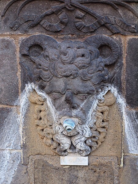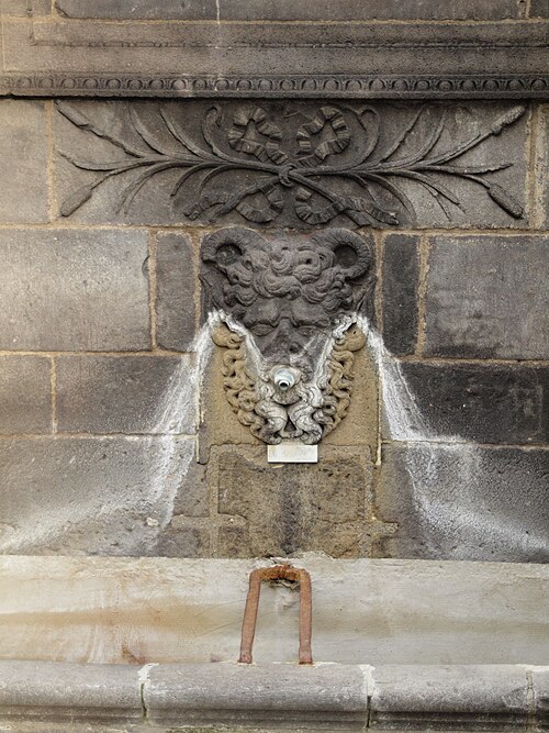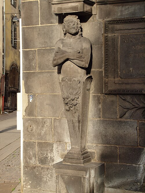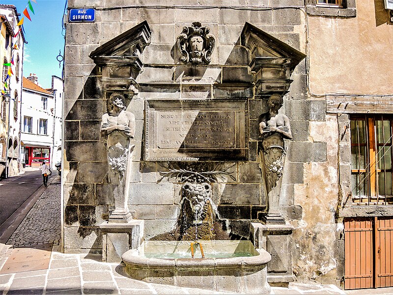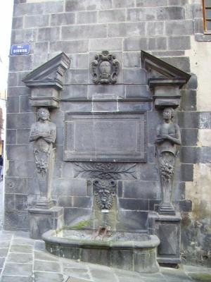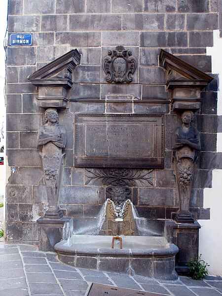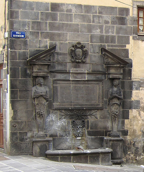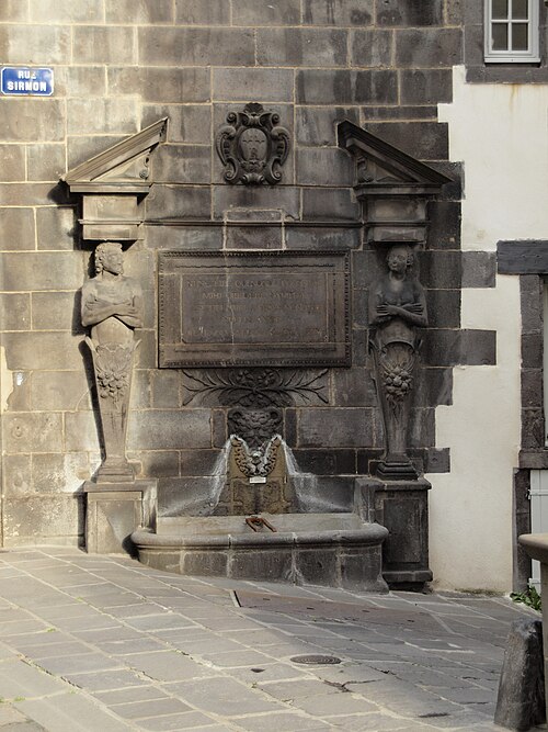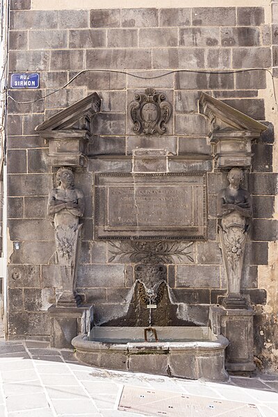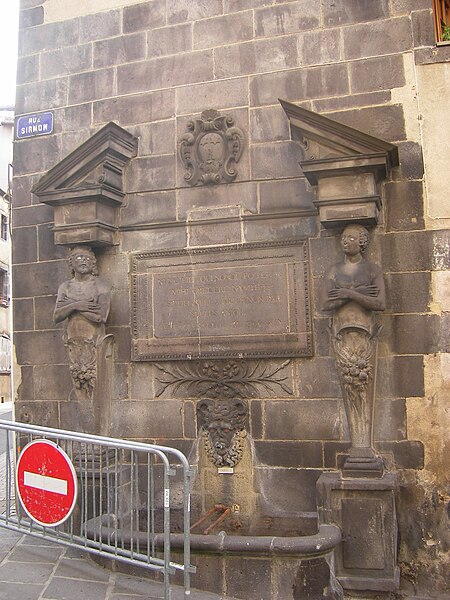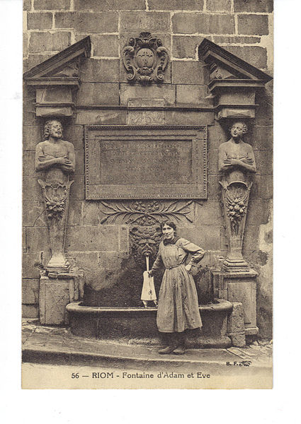 La fontaine dite d'Adam et Ève se trouve dans le centre-ville de Riom, rue Sirmon, et est plaquée contre le mur d'une maison à l'angle de la rue Gomot. Elle est réalisée en pierre de Volvic et date du milieu du XVIIe siècle selon l'analyse stylistique de ses éléments sculptés. Sa composition met en scène deux cariatides formant pilastres : l'une représente le torse d'un homme nu, l'autre celui d'une femme nue, tous deux les bras croisés sur la poitrine. Chacune des figures sort d'une gaine ornée d'une guirlande de fruits et repose sur un socle ; elles supportent une partie d'entablement avec amorce de fronton. Entre leurs socles se trouve la margelle et le bassin de la fontaine. Au-dessus du bassin, un mascaron d'où jaillit l'eau sert de fontaine ; le trop-plein s'écoule par les oreilles du mascaron. Plus haut se lisent, par ordre d'élévation, deux branches croisées liées par un ruban, un cadre rectangulaire entourant une inscription gravée sur une plaque de marbre noir, puis un cartouche aux armes de Riom figurées avec deux étoiles. Une inscription précise que la fontaine a été reprise en 1714. Le nom populaire « fontaine d'Adam et Ève » vient du couple sculpté, mais il est inexact car les torses portent un nombril. L'ouvrage relève du style de la Seconde Renaissance, d'inspiration italienne, bien qu'il ait été réalisé au XVIIe siècle. L'histoire de l'alimentation en eau de Riom éclaire la création de cette fontaine : en 1277 l'abbé de Mozac, Pierre de la Ferté Chauderon, concéda aux consuls de Riom le droit d'exploitation de la source de Dragonescha à Saint-Genès-l'Enfant pour l'alimentation de la ville, contre 140 livres tournois. Selon Matthieu Perona, la découverte d'éléments de canalisation en terre cuite atteste d'importants travaux d'adduction à la fin du XIIIe siècle. La source était probablement proche de la pisciculture de Saint-Genès, où se trouve une petite maison en pierre de Volvic, la chapelle des eaux, dont le tympan porte le blason de Riom et la date 1654. En 1644, le circuit d'alimentation des fontaines de la ville fut réaménagé, vraisemblablement à la suite de la grande peste de 1631, et la ville ne comptait alors que quatre fontaines ; les conduites de l'aqueduc reliant la source de Dragonescha furent remplacées par des canalisations en pierre de Volvic. La construction de la fontaine intervient au milieu du XVIIe siècle après ces travaux ; son édification a été attribuée au sculpteur Jean Languille ou à son fils Guillaume. Elle a fait l'objet d'une restauration en 1714. Le père mariste Jean Bonnet dénombra 62 fontaines à Riom dans son étude de 1796. La fontaine d'Adam et Ève a été classée au titre des monuments historiques le 15 novembre 1913. Une inscription latine encadrée sur plaque de marbre noir a suscité diverses interprétations ; le père Bonnet y a vu l'annonce de l'arrivée d'une eau pure et potable venue de Saint-Genès-l'Enfant après les épisodes de peste. Bibliographie citée : François Werner, « La fontaine d'Adam et Ève », Riom, Chamalières, Éditions Canope, 1990, p. 135-136.