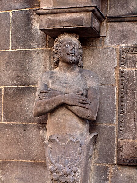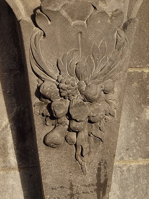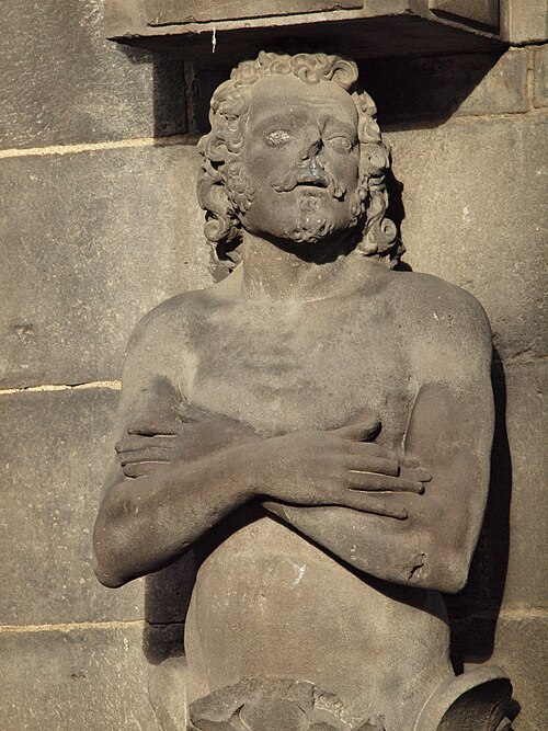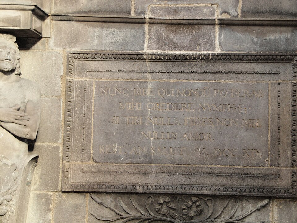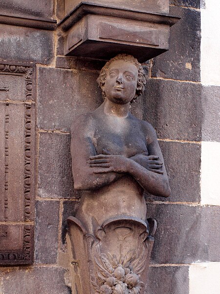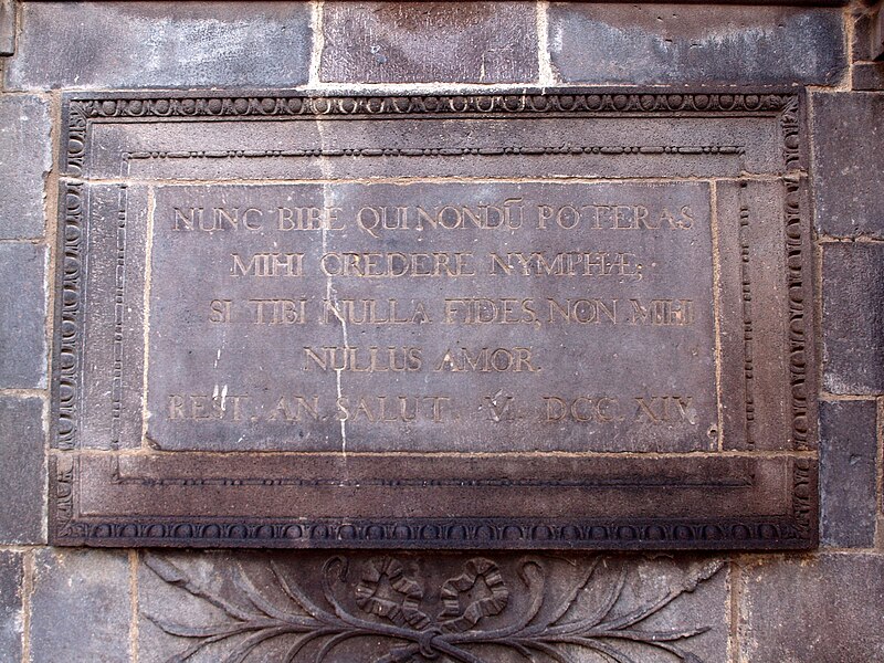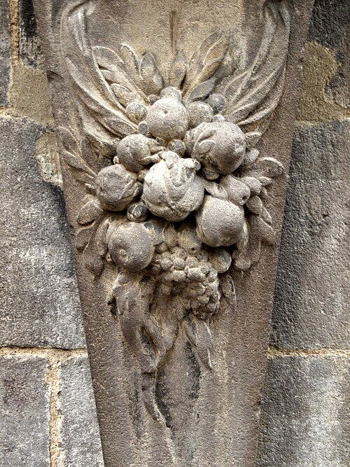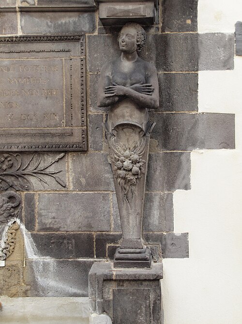 La fontaine dite d'Adam et Ève se trouve dans le centre-ville de Riom, rue Sirmon, et est plaquée contre le mur d'une maison à l'angle de la rue Gomot. Elle est réalisée en pierre de Volvic et date du milieu du XVIIe siècle selon l'analyse stylistique de ses éléments sculptés. Sa composition met en scène deux cariatides formant pilastres : l'une représente le torse d'un homme nu, l'autre celui d'une femme nue, tous deux les bras croisés sur la poitrine. Chacune des figures sort d'une gaine ornée d'une guirlande de fruits et repose sur un socle ; elles supportent une partie d'entablement avec amorce de fronton. Entre leurs socles se trouve la margelle et le bassin de la fontaine. Au-dessus du bassin, un mascaron d'où jaillit l'eau sert de fontaine ; le trop-plein s'écoule par les oreilles du mascaron. Plus haut se lisent, par ordre d'élévation, deux branches croisées liées par un ruban, un cadre rectangulaire entourant une inscription gravée sur une plaque de marbre noir, puis un cartouche aux armes de Riom figurées avec deux étoiles. Une inscription précise que la fontaine a été reprise en 1714. Le nom populaire « fontaine d'Adam et Ève » vient du couple sculpté, mais il est inexact car les torses portent un nombril. L'ouvrage relève du style de la Seconde Renaissance, d'inspiration italienne, bien qu'il ait été réalisé au XVIIe siècle. L'histoire de l'alimentation en eau de Riom éclaire la création de cette fontaine : en 1277 l'abbé de Mozac, Pierre de la Ferté Chauderon, concéda aux consuls de Riom le droit d'exploitation de la source de Dragonescha à Saint-Genès-l'Enfant pour l'alimentation de la ville, contre 140 livres tournois. Selon Matthieu Perona, la découverte d'éléments de canalisation en terre cuite atteste d'importants travaux d'adduction à la fin du XIIIe siècle. La source était probablement proche de la pisciculture de Saint-Genès, où se trouve une petite maison en pierre de Volvic, la chapelle des eaux, dont le tympan porte le blason de Riom et la date 1654. En 1644, le circuit d'alimentation des fontaines de la ville fut réaménagé, vraisemblablement à la suite de la grande peste de 1631, et la ville ne comptait alors que quatre fontaines ; les conduites de l'aqueduc reliant la source de Dragonescha furent remplacées par des canalisations en pierre de Volvic. La construction de la fontaine intervient au milieu du XVIIe siècle après ces travaux ; son édification a été attribuée au sculpteur Jean Languille ou à son fils Guillaume. Elle a fait l'objet d'une restauration en 1714. Le père mariste Jean Bonnet dénombra 62 fontaines à Riom dans son étude de 1796. La fontaine d'Adam et Ève a été classée au titre des monuments historiques le 15 novembre 1913. Une inscription latine encadrée sur plaque de marbre noir a suscité diverses interprétations ; le père Bonnet y a vu l'annonce de l'arrivée d'une eau pure et potable venue de Saint-Genès-l'Enfant après les épisodes de peste. Bibliographie citée : François Werner, « La fontaine d'Adam et Ève », Riom, Chamalières, Éditions Canope, 1990, p. 135-136.