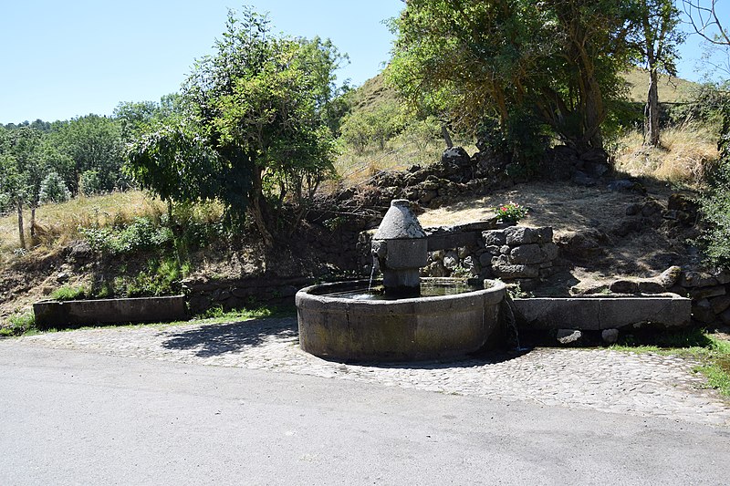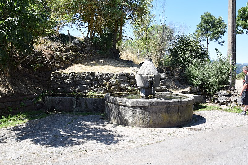 La fontaine d'Albepierre-Bredons est située dans le bourg de Bredons, sur la commune d'Albepierre-Bredons (Cantal, Auvergne-Rhône-Alpes). De plan circulaire et de style indéterminé, elle est dominée au centre par une colonne de section rectangulaire qui porte une vasque en pierre. Sur un côté, un fragment de pierre encastré présente un griffon sculpté en forme de masque humain; à l'opposé, une gouttière de pierre recouverte d'une dalle conduit l'eau de la montagne et pénètre dans la vasque par un évidement analogue à celui qui contient le griffon. Cette disposition laisse supposer qu'autrefois la vasque pouvait comporter deux griffons opposés. Sa forme et la sculpture du griffon rattachent l'ouvrage à la tradition romane. La fontaine est sans doute liée à l'église monastique de Bredons : après l'incendie du monastère au XVIIIe siècle, les matériaux ont été réutilisés par les habitants et la fontaine a vraisemblablement été ramenée à son emplacement actuel. Elle est inscrite au titre des monuments historiques par arrêté du 30 juin 1987.