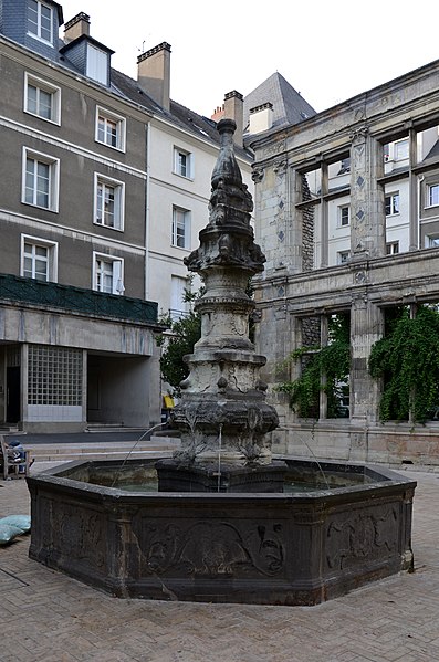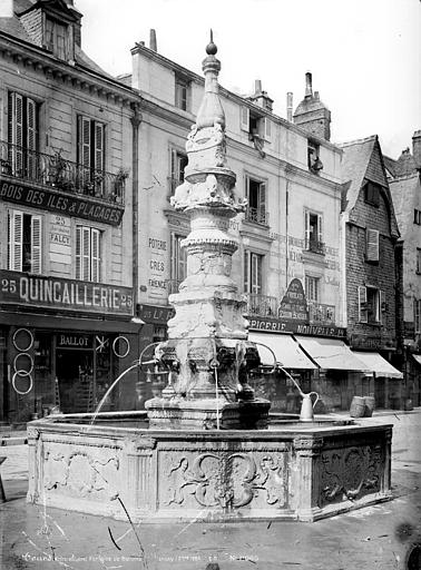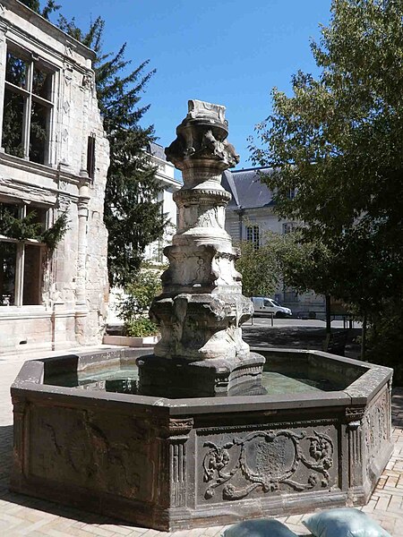Située au centre du jardin de Beaune-Semblançay, la fontaine est une œuvre du XVIe siècle, toujours fonctionnelle et classée au titre des monuments historiques depuis le 12 juillet 1886. Après les destructions du quartier nord, les vestiges de l'hôtel de Beaune-Semblançay ont fait l'objet de projets de valorisation dès décembre 1940 ; l'idée d'un jardin, reprise par Camille Lefèvre et Jean Dorian puis approfondie par Pierre Patout, a conduit à l'aménagement d'un square face à la Chambre de commerce. Le service des Monuments historiques a protégé la chapelle en août 1941 et classé en octobre 1947 un pan d'élévation de l'ancienne galerie ; un transfert des vestiges au château du Plessis a été envisagé en 1950 puis abandonné, de même que des plans proposés par Bernard Vitry pour un bâtiment administratif. À partir de juin 1954, Pierre Patout et Pierre Labadie reprennent les études pour organiser l'îlot G autour d'un « jardin de Beaune-Semblançay », dénomination proposée par le conseil municipal en juin 1956, et la fontaine, rapatriée depuis la place du Grand-Marché, est installée au centre de la composition en juillet 1957 après des travaux entrepris à la fin de 1956. Le jardin a été réaménagé en 2005 par l'architecte-paysagiste Philippe Herlin et enrichi d'une œuvre de l'artiste Cécile Pitois.