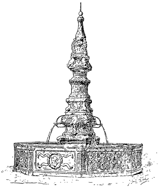 Le bassin de la fontaine est en pierre de Volvic et a été financé par la municipalité ; la pyramide qui le surmonte, haute de 4,20 m, est formée de quatre blocs de marbre que Jacques de Beaune fit venir de Gênes à ses frais. La pyramide porte les monogrammes de Louis XII et d'Anne de Bretagne ainsi que les blasons de France et de la ville de Tours, dont les fleurs de lys ont été détruites, probablement à la Révolution, et le blason de la famille de Beaune ; elle était autrefois couronnée d'une terrasse fleurie supportant une couronne et un crucifix.
