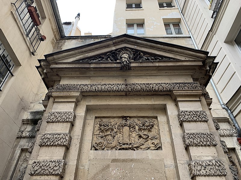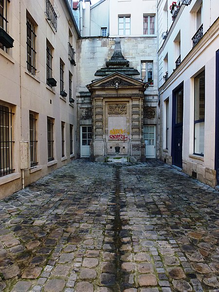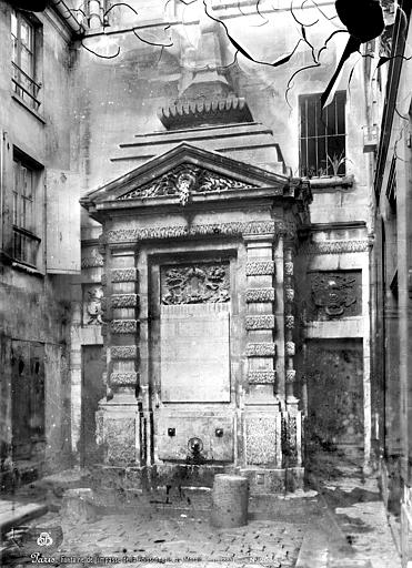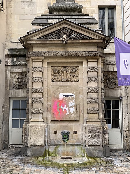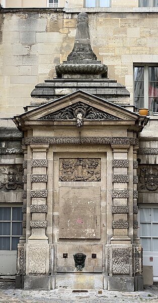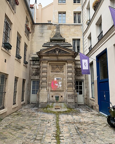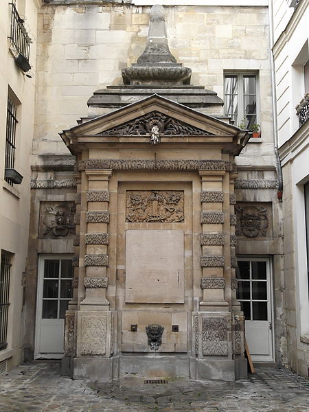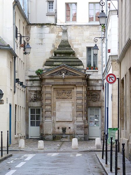 La fontaine de Jarente, parfois appelée fontaine de la Poissonnerie ou fontaine d'Ormesson, se situe au fond de l'impasse de la Poissonnerie, une petite voie d'une quinzaine de mètres qui s'ouvre sur la rue de Jarente dans le 4e arrondissement de Paris. Elle est inscrite au titre des monuments historiques par arrêté du 17 juin 1925. Construite en 1783, elle fait partie du plan d'ensemble conçu lors de la rénovation du quartier après la destruction, en 1773-1774, du prieuré Sainte-Catherine-du-Val-des-Écoliers, qui occupait la plus grande partie de l'îlot délimité aujourd'hui par les rues de Turenne, de Sévigné, des Francs-Bourgeois et Saint-Antoine. À cette occasion furent ouvertes de nouvelles voies, dont les rues de Jarente, d'Ormesson, Necker et Caron, ainsi qu'une place destinée au marché Sainte-Catherine ; l'impasse de la Poissonnerie, fréquentée par les marchands de poissons, nécessitait un point d'eau, d'où l'édification de la fontaine sur les plans de monsieur Caron, maître général des bâtiments du roi. Adossée au fond de l'impasse, la fontaine forme un massif encadré par deux pilastres et surmonté d'un fronton triangulaire ; son fronton comporte une bouche d'eau qui déverse un flot gelé. Le décor en bas-relief central représente un faisceau de licteur, des dauphins et des cornes d'abondance. De chaque côté, en retrait, deux portes surmontées de rosaces donnent accès au bâtiment arrière. Au-dessus du fronton, une composition architecturale en pyramide moulurée, engagée dans le mur, prolonge l'ensemble et porte l'élévation à environ sept mètres. Près du sol, un filet d'eau jaillit d'un mascaron de bronze figurant une tête de satyre. L'appareillage général est décoré dans le style dit « à congélation », observable notamment sur les pilastres et le linteau.