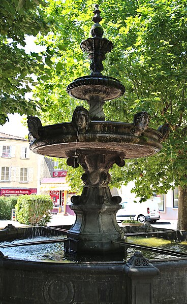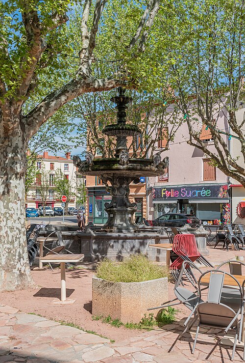 La fontaine a été construite entre mars 1857 et septembre 1858 dans le cadre d'une campagne d'aménagement urbain sous le Second Empire. Elle a été réalisée par le sculpteur Pierre Béraud d'après le projet de l'architecte clermontois H. Taché, lequel a également conçu d'autres fontaines pour la ville de Billom. Conçue pour l'ancienne place du Cibony, aujourd'hui place Alfred Thomas, elle remplaçait une fontaine plus ancienne transférée dans le quartier du Chaffour. L'ouvrage repose sur une superposition de vasques disposées en pyramide; à l'exception du bassin, son vocabulaire décoratif emprunte à l'antiquité romaine. Il est traité dans un style éclectique propre à la seconde moitié du XIXe siècle, peu représenté dans le Puy-de-Dôme. Au XXe siècle, après la destruction de la halle, la fontaine a été déplacée de quelques mètres pour être installée à l'emplacement de celle-ci.