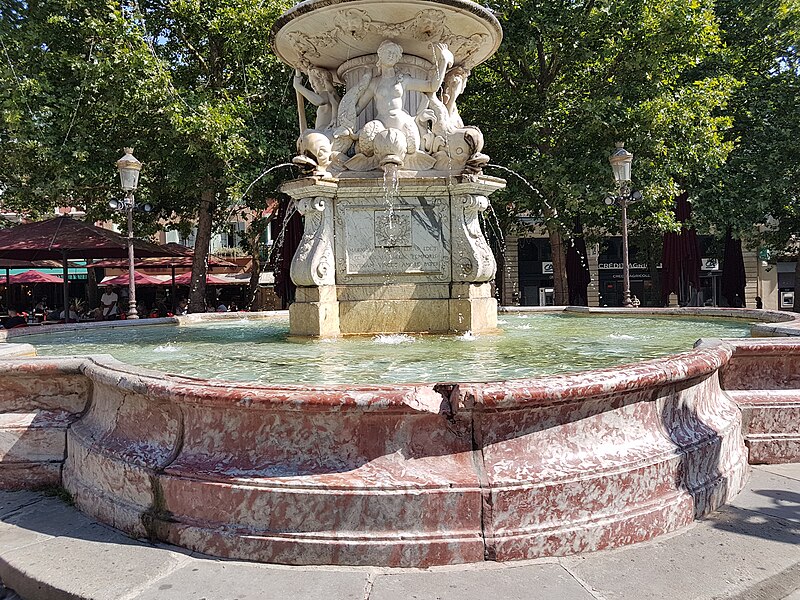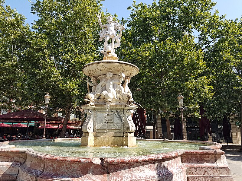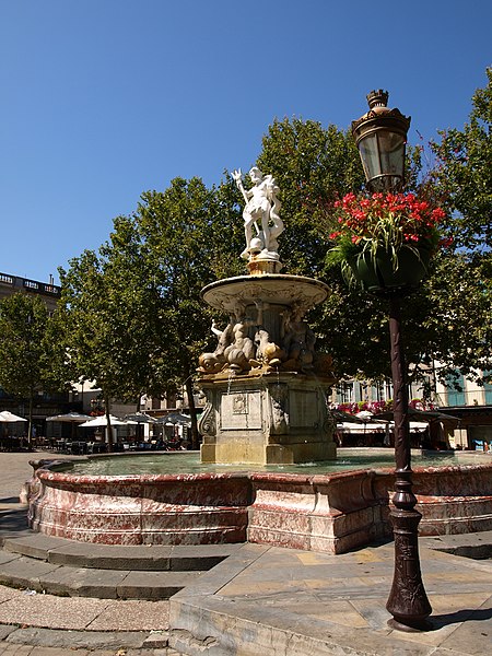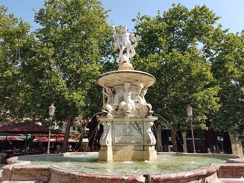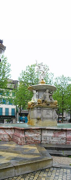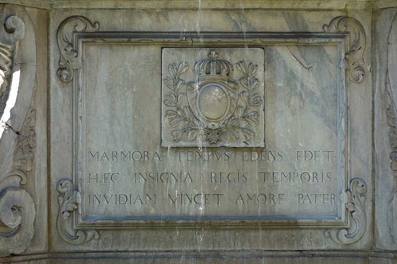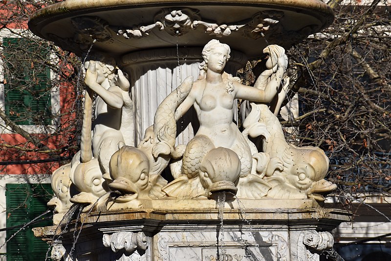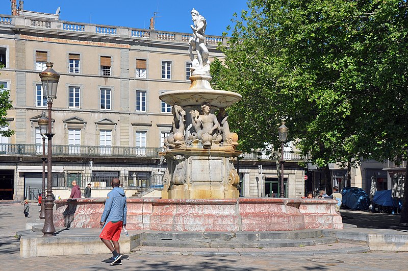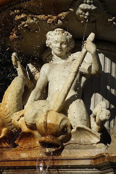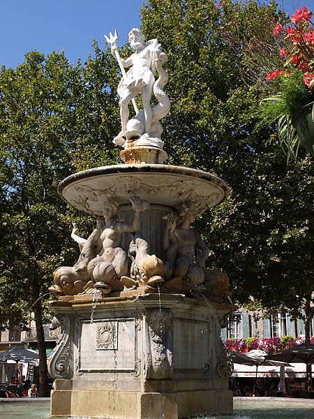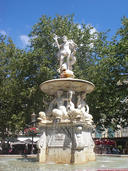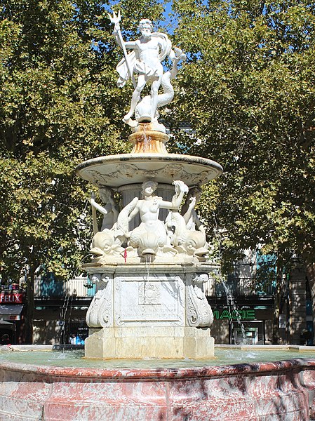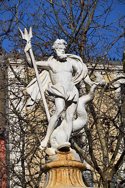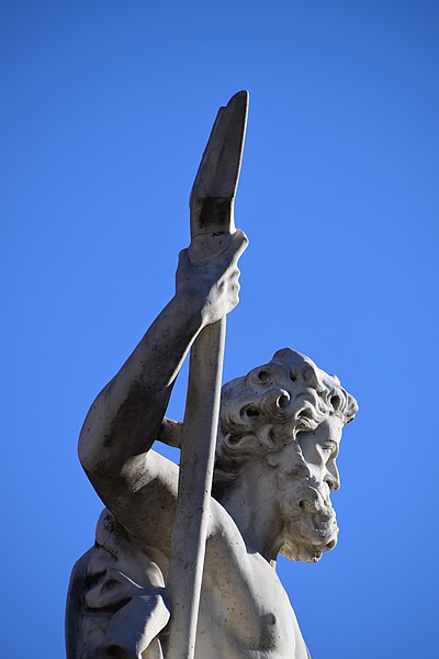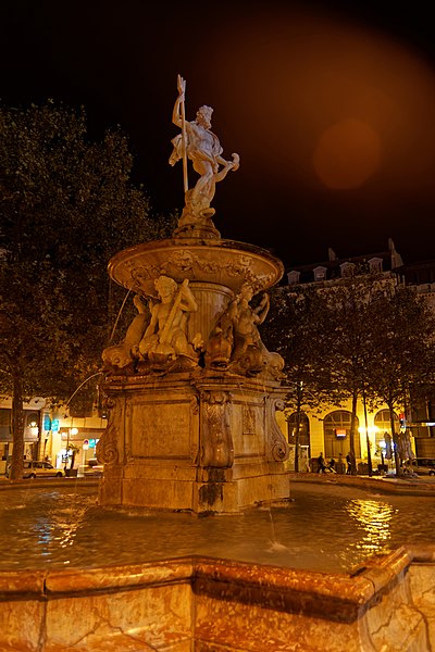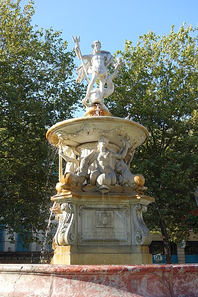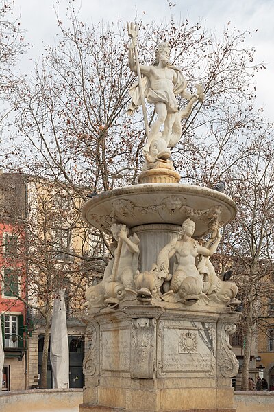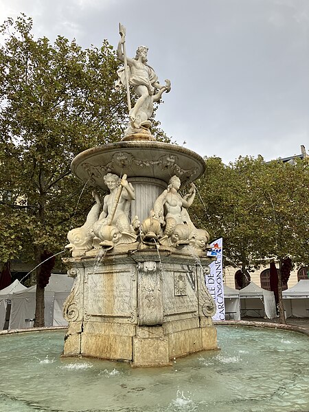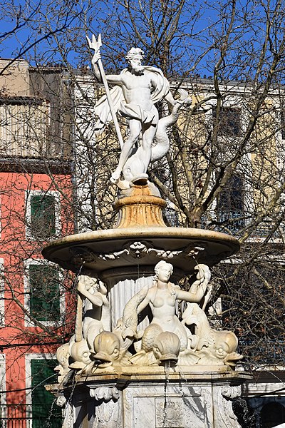 Fontaine achevée en 1770, œuvre des sculpteurs italiens Barata père et fils. Elle s'élève au centre d'un bassin en marbre incarnat. La base principale forme un socle carré orné d'inscriptions sur ses faces et d'enroulements aux angles. Au-dessus prennent place deux tritons et deux naïades qui semblent commander des dauphins dont les naseaux projettent de nombreux jets d'eau. Ces figures mythologiques supportent une vasque décorée de mascarons et de guirlandes; au centre se dresse une statue de Neptune, posée sur un piédouche d'où jaillit une source abondante se répartissant en cascades autour du monument.