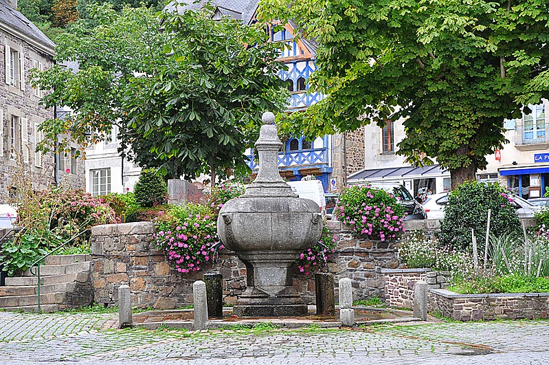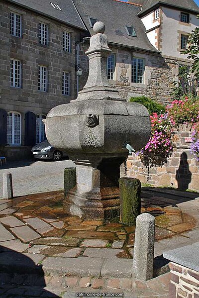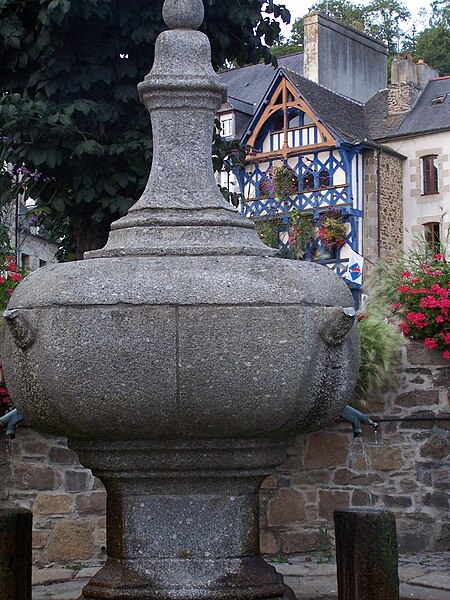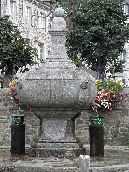 Érigée en granit, la fontaine repose sur un octogone élevé d'une marche. Quatre angles saillants sont pourvus d'une borne polygonale. L'ouvrage est taillé dans un bloc à pans coupés et coiffé d'un socle polygonal orné de plinthes et de moulures. Au‑dessus, des profils concaves, ponctués de deux renflements moulurés, supportent une boule sommitale. L'eau s'écoule de cette boule et tombe de chaque côté sur des pierres qui la reçoivent.