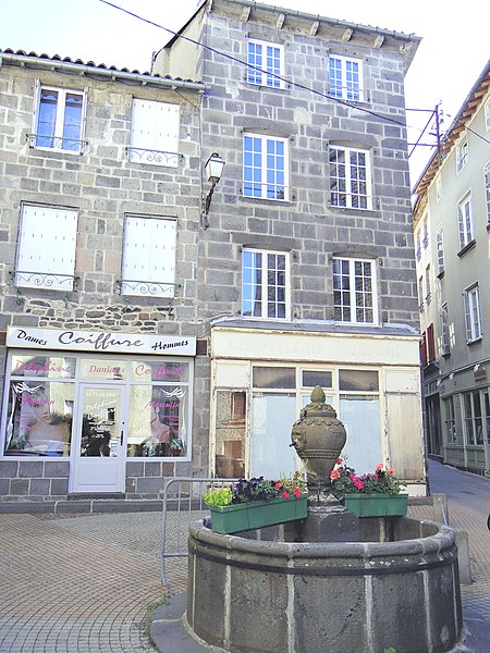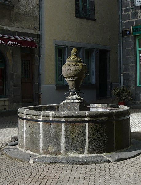 La fontaine, située à l'angle des rues des Lacs et Marchande à Saint‑Flour (Cantal), est une construction circulaire édifiée en 1790. Son déversoir est constitué d'un motif ornemental en pierre sculptée représentant un vase posé sur un socle. L'eau s'écoule de la bouche d'un masque creusé sur la partie renflée. La fontaine est inscrite au titre des monuments historiques par arrêté du 14 octobre 1946. Des documents et des images sont consultables dans la base Mérimée et sur Wikimedia Commons, ainsi que sur les portails consacrés au Cantal, aux monuments historiques et aux bassins et fontaines. Voir aussi la liste des monuments historiques de Saint‑Flour et les fontaines protégées au titre des monuments historiques en Auvergne‑Rhône‑Alpes.