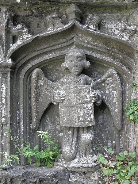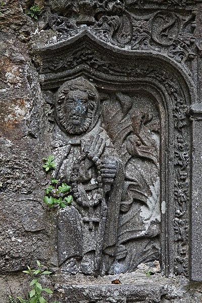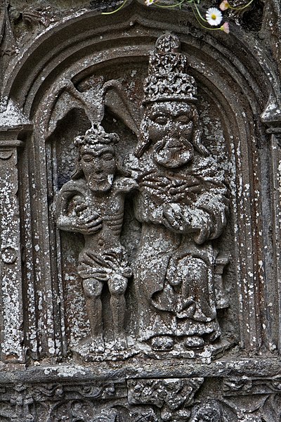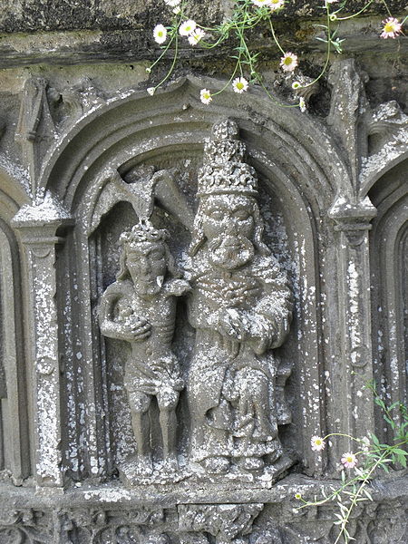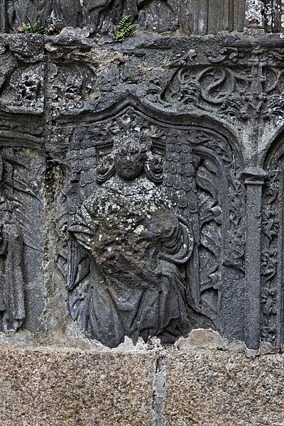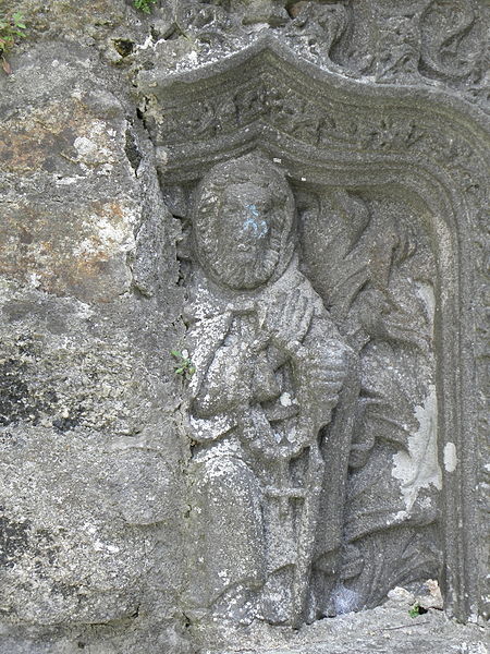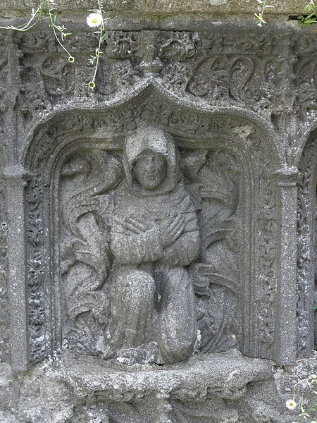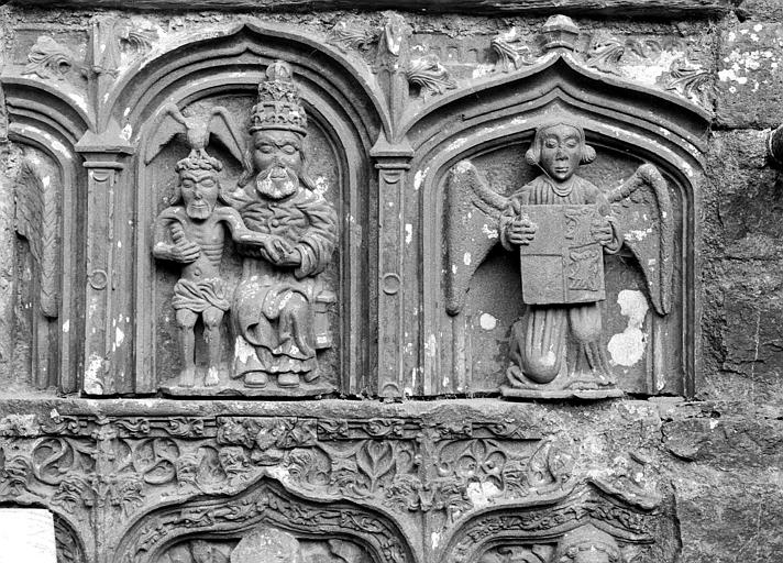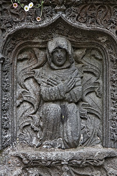 La fontaine alimente un lavoir public accessible par un escalier dont le mur de soutènement présente une double rangée d'arcatures encadrant des bas-reliefs. L'un montre la Sainte Trinité entourée de deux anges tenant un écusson, tandis que d'autres figurent des moines et des nonnes en prière.