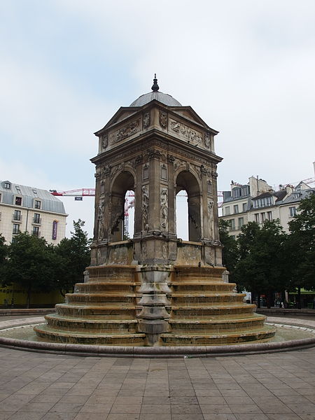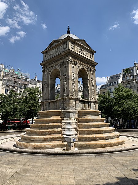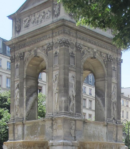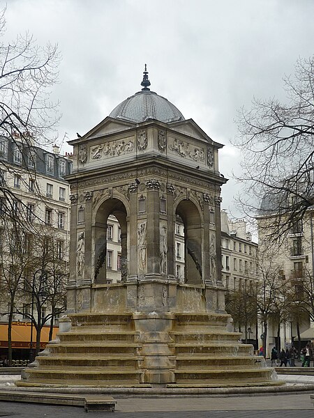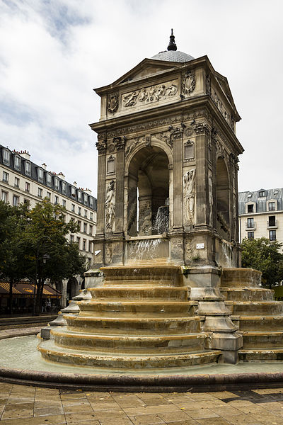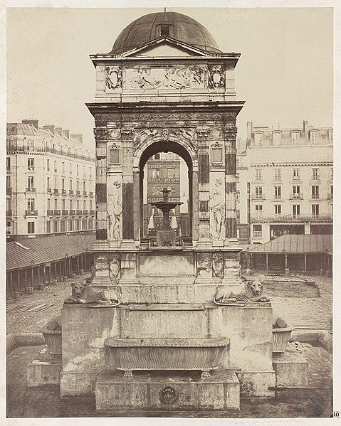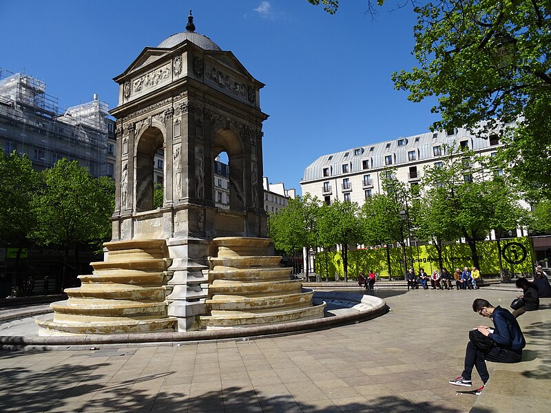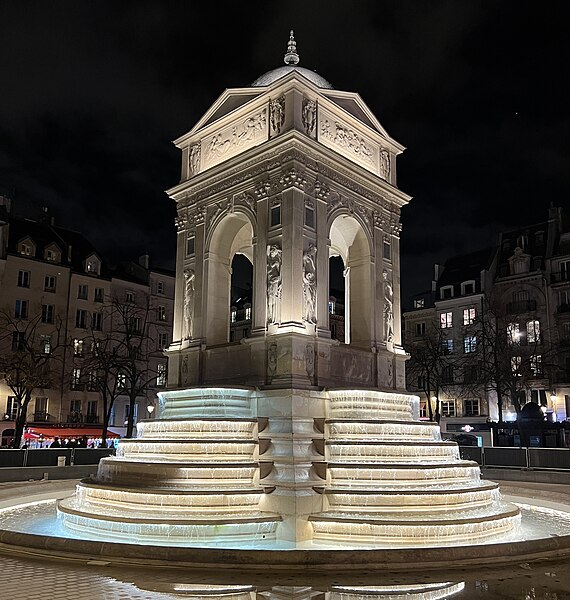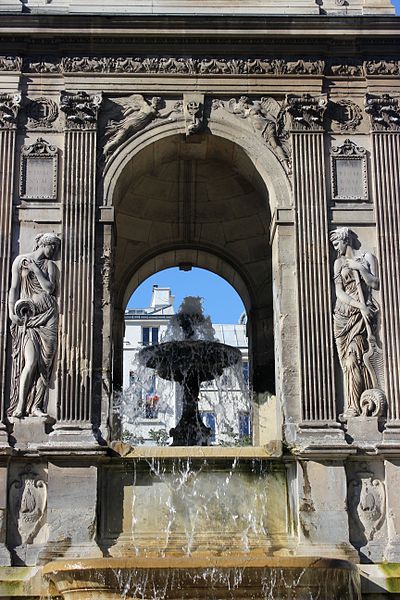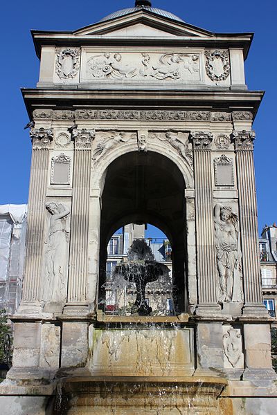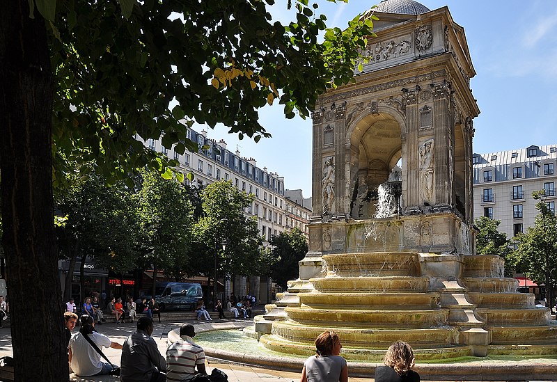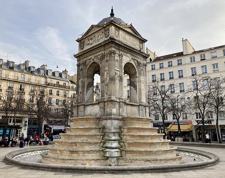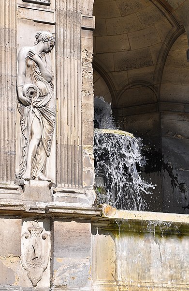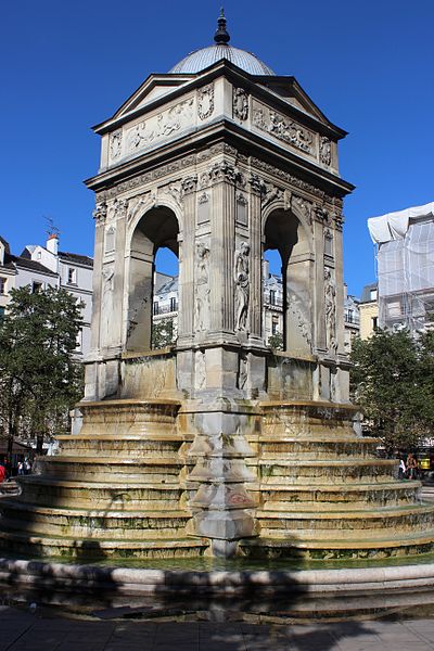 La Fontaine des Innocents, d'abord appelée fontaine des Nymphes, se situe dans le 1er arrondissement de Paris, sur la place Joachim-du-Bellay, dans le quartier des Halles ; elle est de style Renaissance et est classée monument historique depuis 1862. Le site est desservi par les stations de métro Les Halles et Châtelet. Une première fontaine, adossée à l'église des Saints-Innocents à l'angle de la rue Saint-Denis et de la rue aux Fers (actuelle rue Berger), est établie vers 1260 et alimentée par une conduite apportant les eaux des sources du Pré-Saint-Gervais. En 1548, au même emplacement, Pierre Lescot conçoit une loggia décorée par Jean Goujon, composée alors d'une structure rectangulaire à trois arcades ornées de cinq naïades, de pilastres d'ordre corinthien, d'une frise et d'un attique à fronton triangulaire ; l'ensemble laissait l'eau s'écouler par de petits mascarons. Cette fontaine célébrait originellement l'entrée des souverains dans Paris au retour du sacre de Reims, dont plusieurs entrées royales sont mentionnées dans les sources. À la fin du XVIIIe siècle, la fermeture et le déplacement des cimetières entraînent la démolition de l'église des Saints-Innocents en 1785 et la transformation de l'espace en marché ; la fontaine est alors démontée et réédifiée au centre de la nouvelle place sous la direction de l'ingénieur Six et des architectes Poyet, Legrand et Molinos. Pour lui donner la forme d'un tétrapyle, une quatrième face est sculptée en 1788 par Augustin Pajou, qui réalise trois naïades pour compléter les cinq de Goujon, tandis que d'autres ornements sont confiés à Lhuillier, Mézières et Daujon ; des lions ornent les angles et le soubassement est remplacé par des bassins superposés recueillant l'eau d'une vasque en bronze placée au centre du pavillon. Les trois bas-reliefs du soubassement, menacés par l'écoulement, sont démontés et déposés au musée du Louvre, et l'édifice est coiffé d'une petite coupole en feuilles de métal imitant des écailles de poisson. Lors de l'aménagement d'un square en 1856, puis du nouvel aménagement du jardin en 1860, la fontaine est encore déplacée et recentrée sur un soubassement pyramidal à six bassins étagés sur chaque face, reposant au milieu d'un bassin circulaire ; cette transformation est réalisée par l'architecte Gabriel Davioud. La place Joachim-du-Bellay actuelle conserve, dans les grandes lignes, les dimensions du square disparu lors des réaménagements des Halles au XXe siècle. De juillet 2019 à l'achèvement des travaux, la nécessité d'une restauration était reconnue ; les travaux, estimés à 5 millions d'euros, s'appuient sur un protocole établi par un comité scientifique et ont débuté en juin 2023 pour s'achever par la remise en eau le 27 juin 2024. Asséchée depuis 2017 en raison d'un tassement inégal des fondations qui détournait majoritairement les débits vers l'ouest, la fontaine souffrait aussi de la pollution, des intempéries et de la corrosion du système hydraulique ; le local technique souterrain a été entièrement réaménagé avec la pose d'un variateur de débit et de puissance et le remplacement du traitement au chlore par une désinfection aux ultraviolets, et une nouvelle mise en lumière indirecte et chaude par LED a été installée. Les cinq nymphes de Jean Goujon ont été déposées et remplacées par des copies en résine chargée en poudre de pierre ; les originaux ont été exposés au musée Carnavalet jusqu'au 25 août 2024 et leur destination finale n'est pas encore arrêtée, elles pourraient rejoindre les bas-reliefs conservés au musée du Louvre. Sur le plan sculptural, l'œuvre de Jean Goujon associe pilastres jumelés d'ordre corinthien, arcades surmontées d'attiques et frontons et naïades voilées en bas-relief, les attiques étant ornés de scènes mythologiques liées aux sources et fontaines. Les bas-reliefs du soubassement du XVIe siècle, représentant nymphes accompagnées de Tritons et de petits génies parmi des créatures mythologiques, constituent l'un des premiers exemples de représentation mythologique dans l'espace public en France. Pajou a respecté la même ordonnance pour la quatrième face et a pris pour modèle la statue de la Paix de Goujon ; il a sculpté les bas-reliefs de la face méridionale et ceux du panneau gauche de l'arcade occidentale.