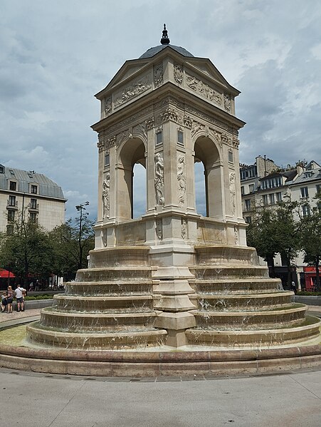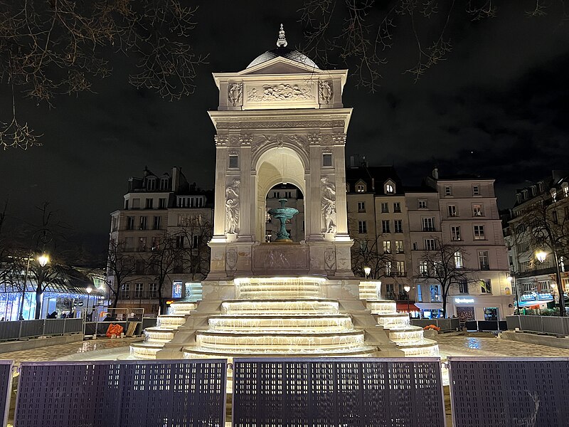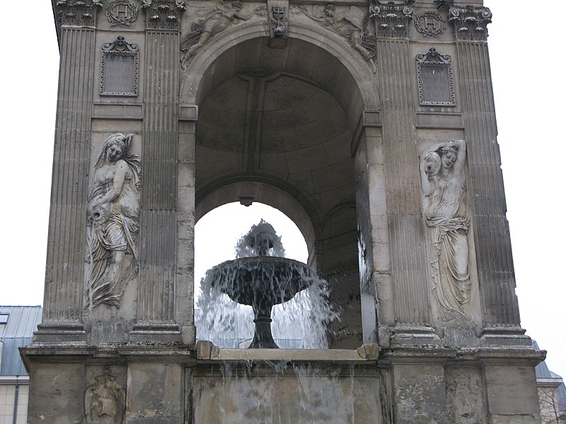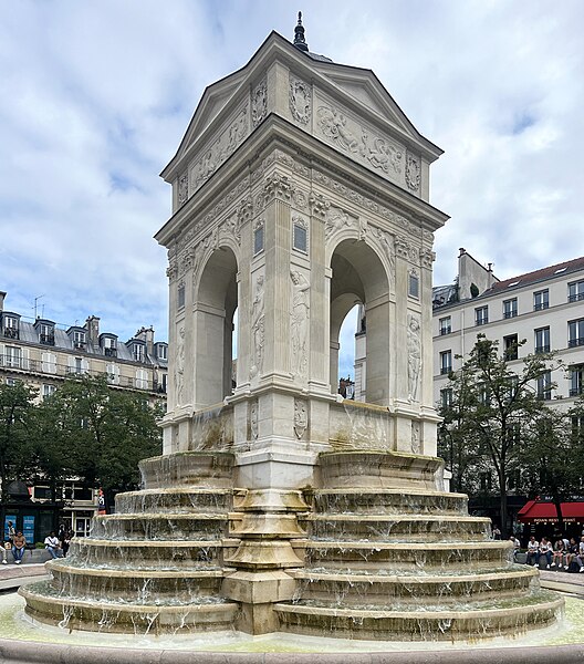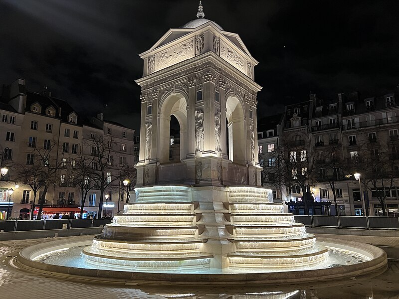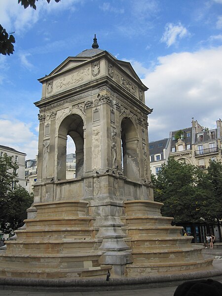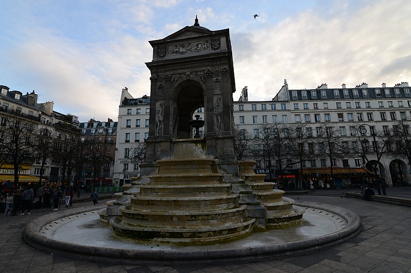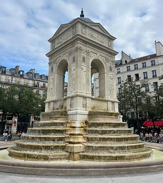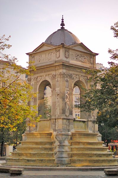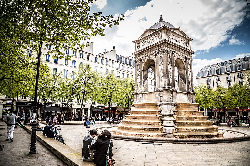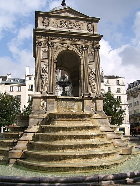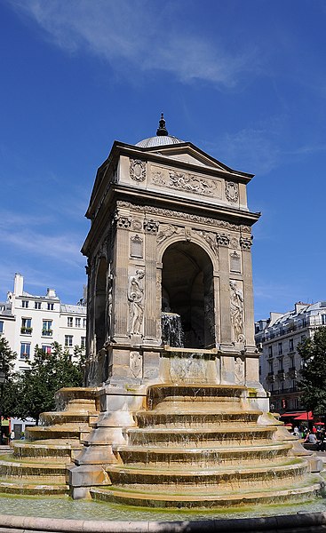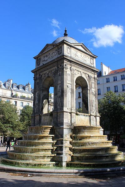 La Fontaine des Innocents, d'abord appelée fontaine des Nymphes, se situe dans le 1er arrondissement de Paris, sur la place Joachim-du-Bellay, dans le quartier des Halles ; elle est de style Renaissance et est classée monument historique depuis 1862. Le site est desservi par les stations de métro Les Halles et Châtelet. Une première fontaine, adossée à l'église des Saints-Innocents à l'angle de la rue Saint-Denis et de la rue aux Fers (actuelle rue Berger), est établie vers 1260 et alimentée par une conduite apportant les eaux des sources du Pré-Saint-Gervais. En 1548, au même emplacement, Pierre Lescot conçoit une loggia décorée par Jean Goujon, composée alors d'une structure rectangulaire à trois arcades ornées de cinq naïades, de pilastres d'ordre corinthien, d'une frise et d'un attique à fronton triangulaire ; l'ensemble laissait l'eau s'écouler par de petits mascarons. Cette fontaine célébrait originellement l'entrée des souverains dans Paris au retour du sacre de Reims, dont plusieurs entrées royales sont mentionnées dans les sources. À la fin du XVIIIe siècle, la fermeture et le déplacement des cimetières entraînent la démolition de l'église des Saints-Innocents en 1785 et la transformation de l'espace en marché ; la fontaine est alors démontée et réédifiée au centre de la nouvelle place sous la direction de l'ingénieur Six et des architectes Poyet, Legrand et Molinos. Pour lui donner la forme d'un tétrapyle, une quatrième face est sculptée en 1788 par Augustin Pajou, qui réalise trois naïades pour compléter les cinq de Goujon, tandis que d'autres ornements sont confiés à Lhuillier, Mézières et Daujon ; des lions ornent les angles et le soubassement est remplacé par des bassins superposés recueillant l'eau d'une vasque en bronze placée au centre du pavillon. Les trois bas-reliefs du soubassement, menacés par l'écoulement, sont démontés et déposés au musée du Louvre, et l'édifice est coiffé d'une petite coupole en feuilles de métal imitant des écailles de poisson. Lors de l'aménagement d'un square en 1856, puis du nouvel aménagement du jardin en 1860, la fontaine est encore déplacée et recentrée sur un soubassement pyramidal à six bassins étagés sur chaque face, reposant au milieu d'un bassin circulaire ; cette transformation est réalisée par l'architecte Gabriel Davioud. La place Joachim-du-Bellay actuelle conserve, dans les grandes lignes, les dimensions du square disparu lors des réaménagements des Halles au XXe siècle. De juillet 2019 à l'achèvement des travaux, la nécessité d'une restauration était reconnue ; les travaux, estimés à 5 millions d'euros, s'appuient sur un protocole établi par un comité scientifique et ont débuté en juin 2023 pour s'achever par la remise en eau le 27 juin 2024. Asséchée depuis 2017 en raison d'un tassement inégal des fondations qui détournait majoritairement les débits vers l'ouest, la fontaine souffrait aussi de la pollution, des intempéries et de la corrosion du système hydraulique ; le local technique souterrain a été entièrement réaménagé avec la pose d'un variateur de débit et de puissance et le remplacement du traitement au chlore par une désinfection aux ultraviolets, et une nouvelle mise en lumière indirecte et chaude par LED a été installée. Les cinq nymphes de Jean Goujon ont été déposées et remplacées par des copies en résine chargée en poudre de pierre ; les originaux ont été exposés au musée Carnavalet jusqu'au 25 août 2024 et leur destination finale n'est pas encore arrêtée, elles pourraient rejoindre les bas-reliefs conservés au musée du Louvre. Sur le plan sculptural, l'œuvre de Jean Goujon associe pilastres jumelés d'ordre corinthien, arcades surmontées d'attiques et frontons et naïades voilées en bas-relief, les attiques étant ornés de scènes mythologiques liées aux sources et fontaines. Les bas-reliefs du soubassement du XVIe siècle, représentant nymphes accompagnées de Tritons et de petits génies parmi des créatures mythologiques, constituent l'un des premiers exemples de représentation mythologique dans l'espace public en France. Pajou a respecté la même ordonnance pour la quatrième face et a pris pour modèle la statue de la Paix de Goujon ; il a sculpté les bas-reliefs de la face méridionale et ceux du panneau gauche de l'arcade occidentale.