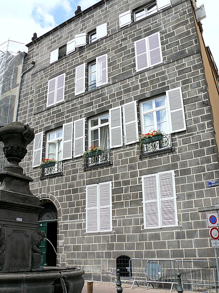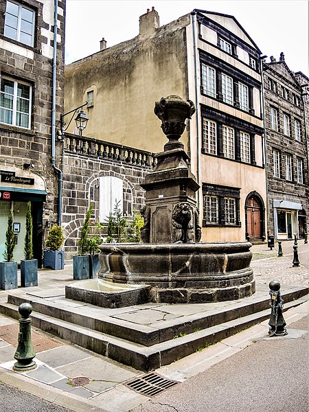 La fontaine des Lions se situe dans le centre-ville de Riom, rue de l'Horloge. Élevée en 1614, elle est décrite par certaines sources comme réalisée en pierre de Volvic, tandis que d'autres la qualifient de trachy-andésite. L'ouvrage se compose d'un bassin circulaire au profil galbé, bordé de deux larges tores, et d'un corps central de plan triangulaire. À partir du niveau de l'eau, chaque face centrale présente un panneau rectangulaire mouluré, découpé en arc de cercle aux angles. Dans chacun de ces angles s'engage une statue de lion crachant l'eau dans le bassin ; les trois lions sont accroupis, les pattes antérieures posées sur les postérieures repliées, le corps dressé et la tête entourée d'une crinière. Au-dessus des faces se trouve un entablement souligné d'un bandeau et d'un filet, surmonté d'une corniche en saillie ; sur le piédestal ainsi formé repose un socle qui porte une urne monumentale en couronnement. Cette urne, ajout de style rocaille au milieu du XVIIIe siècle, a remplacé une croix monumentale déplacée dans le cimetière voisin. La fontaine était à l'origine située à l'intersection des rues de l'Horloge et de la Charité, mais certains avancent que sa position primitive se trouvait entre la place des Taules et la porte Layat. Selon Jacques Audigier et Édouard Everat, en 1614 elle semblait remplacer la fontaine médiévale dite de Gardelle. L'édifice a été transporté et reconstitué à son emplacement actuel, vraisemblablement en réduction, et il a subi une restauration en novembre 1752 par M. Lenormand, d'après Antoine Messeix. La Révolution entraîna une destruction partielle de la fontaine. Après avoir été installée sur la place Malouet, elle a retrouvé en 1986 sa place d'origine rue de l'Horloge. Inscrite aux monuments historiques depuis 1971, elle figure parmi les six fontaines de la ville classées ou inscrites au titre des monuments historiques.