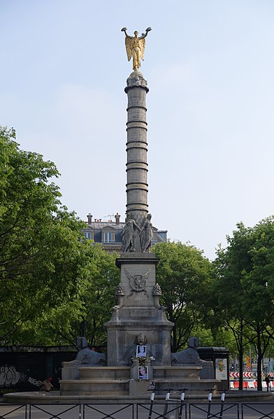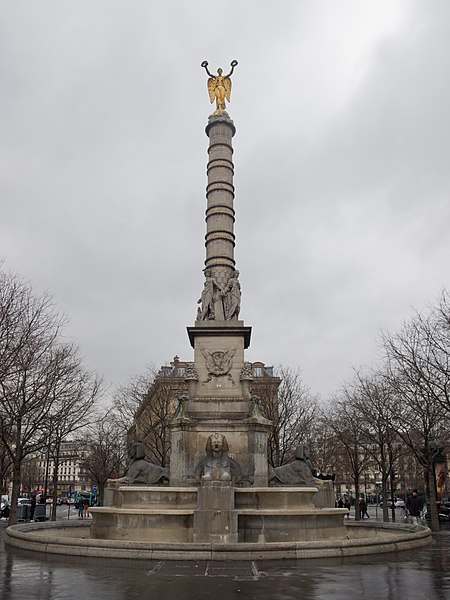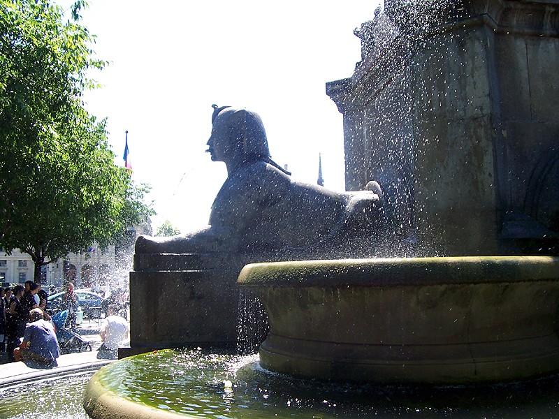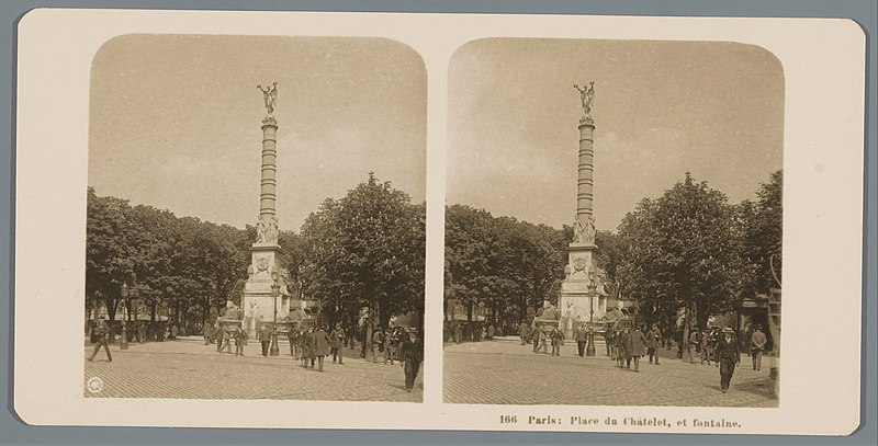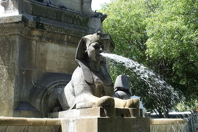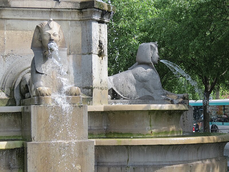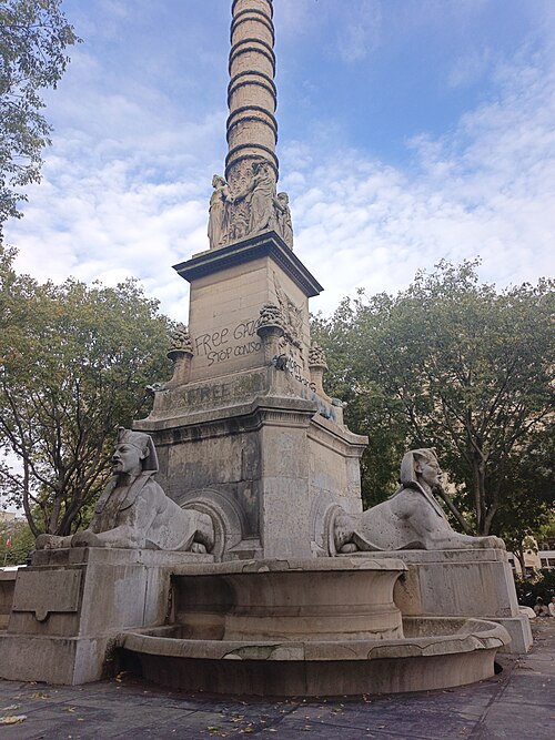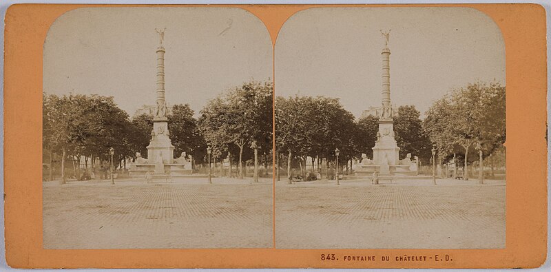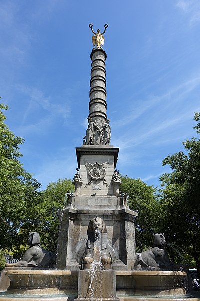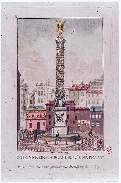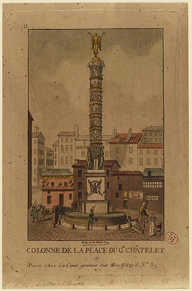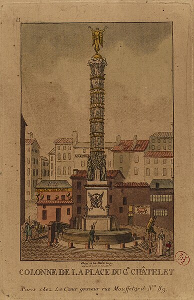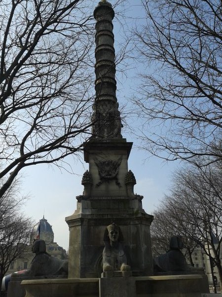 La Fontaine du Palmier, également appelée fontaine du Châtelet ou fontaine de la Victoire, est un monument parisien situé place du Châtelet, entre le théâtre du Châtelet et le théâtre de la Ville dans le 1er arrondissement. Le site est desservi par la station de métro Châtelet. La fontaine a été commandée en 1806 par Napoléon Ier à Emmanuel Crétet, ministre de l'Intérieur, pour commémorer ses victoires et pour fournir de l'eau potable gratuite aux Parisiens. Le projet, dirigé par l'ingénieur François-Jean Bralle, fut achevé en 1808. Elle prend la forme d'une colonne dont le sommet est orné de feuilles de palmier, d'où son nom, et dont le fût porte la liste des victoires de Napoléon en Italie, en Égypte et dans d'autres pays (Lodi, Arcole, Rivoli, Pyramides, Mont Thabor, Marengo, Austerlitz, Ulm, Iena, Eylau, Dantzig, Friedland). Y sont gravés notamment les noms des batailles de Lodi, des Pyramides, de Marengo, d'Ulm et le siège de Dantzick en Pologne. La colonne est surmontée d'une Victoire en bronze doré, œuvre de Louis‑Simon Boizot, appelée La Renommée ou La Victoire de Boizot ; la statue actuelle est une copie installée en 1898, l'original étant conservé dans la cour de la Victoire du musée Carnavalet depuis 1950. La base porte quatre statues allégoriques — la Vigilance, la Justice, la Force et la Prudence — également dues à Boizot. Sous le Second Empire, la place du Châtelet fut transformée et agrandie, et en 1858 le monument fut déplacé de douze mètres vers l'ouest pour être replacé au centre de la nouvelle place. À cette occasion, Gabriel Davioud fit ajouter un bassin inférieur entouré de quatre sphinx sculptés par Henri‑Alfred Jacquemart, qui crachent des jets d'eau. La fontaine du Palmier est inscrite au titre des monuments historiques depuis le 5 février 1925.