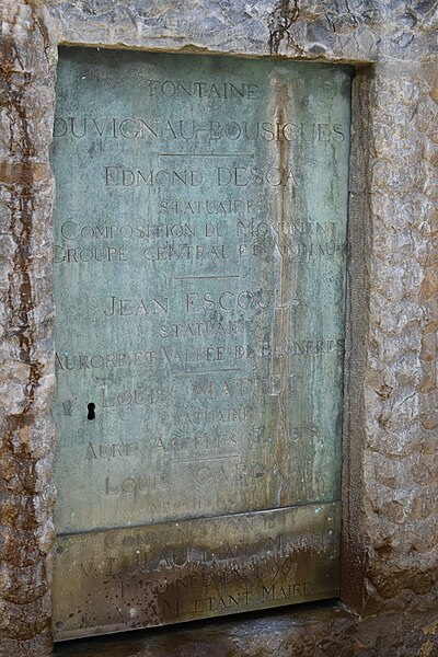 La fontaine Duvignau-Bousigues, dite « des Quatre-Vallées », se trouve place Marcadieu à Tarbes, à l'est de la halle métallique, posée sur un emmarchement de granite reposant sur un soubassement de marbre gris clair. De plan carré aux angles tréflés et animé de légères courbes, le monument présente une silhouette pyramidale haute de 14 mètres. Sa lecture se fait de haut en bas : elle évoque les sources pyrénéennes qui donnent naissance aux Nestes et irriguent les vallées s'ouvrant sur la plaine de Tarbes. Au sommet, le groupe en bronze sculpté par Jean Escoula représente L'Aurore, figurée en jeune nymphe prête à jeter des fleurs, accompagnée d'un isard bondissant. Sous ce groupe, une pyramide rocheuse en pierre calcaire, sculptée par Edmond Desca, porte des figures d'hommes et de femmes nus symbolisant les torrents de l'Adour, de l'Arros, de la Neste, du Bastan, du Gave et de l'Échez. La pile centrale supporte également, sur ses faces, trois animaux en bronze — aigle, ours et loup — réalisés par Desca. Deux bassins circulaires en marbre gris, de diamètres croissants, se succèdent sous la pile ; le premier, ourlé de concrétions, reçoit l'eau des jarres et laisse tomber son trop-plein dans le bassin inférieur. Commandée en mars 1893 à la suite d'un legs de Mme Duvignau — héritière de son frère Bouzigues, maire de Tarbes — la fontaine a été achevée en mars 1896 sous le mandat du maire F. Adam. L'architecte Louis Caddau en a assuré la conception et le dessin ; la réalisation a réuni plusieurs sculpteurs : Edmond Desca pour la composition du monument (enrochements et bassins), Jean Escoula pour L'Aurore et la vallée de Bagnères, et Louis Mathet pour les statues des vallées de l'Aure, d'Argelès et de Tarbes. Une étude en plâtre de la partie des « Torrents », récompensée par une médaille d'or à l'Exposition universelle de 1900, est conservée au musée Salies. Sur la même place se trouve une autre fontaine, en partie commandée à la même époque, nommée « les Sources de l'Amour ». La fontaine Duvignau-Bousigues a été inscrite au titre des Monuments historiques par arrêté du 14 septembre 2023. Aux quatre points cardinaux du monument figurent quatre groupes sculptés qui symbolisent la plaine de Tarbes (avec le cheval et le canon), la vallée de Bagnères (avec la lyre), la vallée d'Aure (avec le mouton et le bœuf) et la vallée d'Argelès (avec le bouquetin des hautes montagnes).