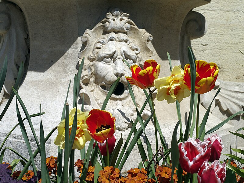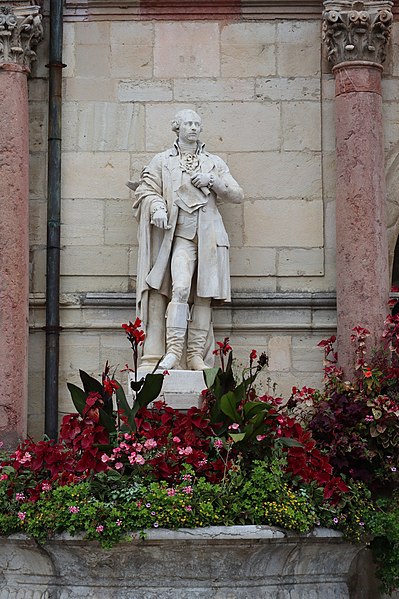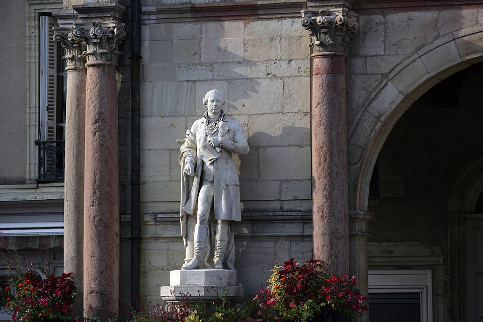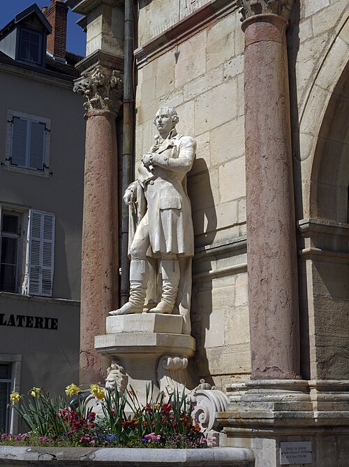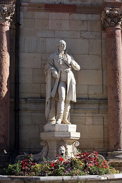 Les fontaines dites François Devosge et Romé-de-l'Isle ont été construites entre 1857 et 1860 selon le projet de Christophe Colard, dans le cadre des travaux d'adduction d'eau engagés après les épidémies de choléra de 1849 et 1854. Chacune se compose d'un bassin de plan semi-octogonal, d'un dé orné de volutes d'où jaillissait l'eau, et d'une statue en pied réalisée par Constant Grandgirard : François Devosge, dessinateur (à gauche), et Jean-Baptiste Romé de l'Isle, naturaliste (à droite). L'une des fontaines a été édifiée contre la partie gauche de l'hôtel de ville en remplacement d'une autre construite en 1751. Le décor et la statue représentant François Devosge — dessinateur et fondateur d'une école de dessin à Dijon — ont été réalisés par le sculpteur graylois Constant Grandgirard d'après un marché conclu avec la ville en 1856. Le socle de cette statue porte la signature de l'auteur, le nom du personnage et sa date de naissance, 25 janvier 1732.