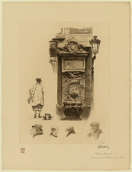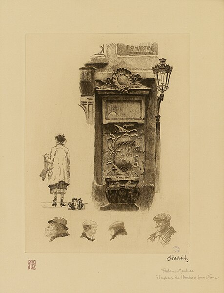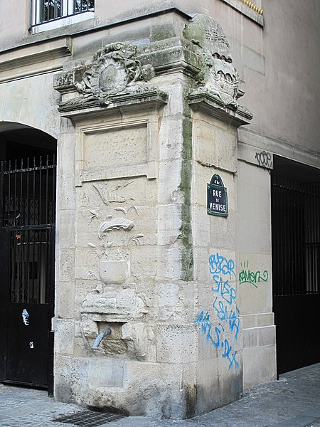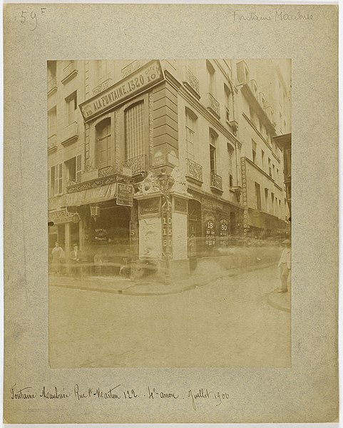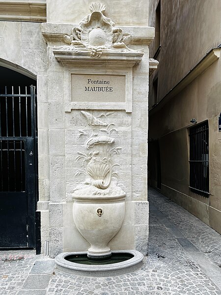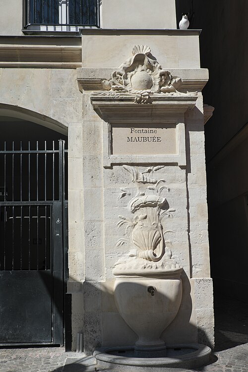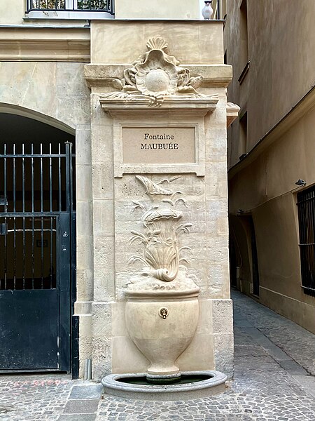 La fontaine Maubuée, située dans le 4e arrondissement de Paris, est l'une des plus anciennes fontaines parisiennes. Elle est mentionnée dans les lettres patentes du 9 octobre 1392 par lesquelles Charles VI tenta de mettre fin aux concessions particulières sur les eaux de Paris. Le nom Maubuée, littéralement « mauvaise buée » ou « mauvaise lessive », aurait été lié à la mauvaise qualité de l'eau provenant des sources de Belleville. La Commission du Vieux Paris attribue toutefois une autre origine au nom, celle d'Hugues Maubué, qui fit au XIIIe siècle une fondation au prieuré Saint-Martin-des-Champs dans la censive où se situe la rue de la fontaine-Maubuée. Une première fontaine existait dès la fin du XIVe siècle à l'angle de la rue Saint-Martin et de la rue Simon-le-Franc, attenante à une maison appartenant à la ville. Elle était destinée à alimenter certaines concessions particulières à partir de l'aqueduc de Belleville et, à partir de 1673, reçut une partie de l'eau de la pompe du pont Notre-Dame. La fontaine actuelle a été reconstruite en 1733 par Jean Beausire et son fils Jean-Baptiste Augustin Beausire à l'angle de la rue Saint-Martin et de la rue Maubuée. La façade principale porte un bas-relief du XVIIIe siècle représentant un vase de style rocaille entouré de roseaux et de plantes aquatiques, surmonté d'un cartouche rectangulaire prévu pour une inscription qui n'a jamais été gravée, lui-même placé sous un larmier mouluré orné d'un écusson ovale aujourd'hui dépourvu d'inscription. La face latérale présente un panneau sans décor mais est également surmontée d'un larmier mouluré orné de la nef de la ville de Paris figurée par un navire à trois mâts et deux ponts percés de sabords. La fontaine fut démontée en 1930 lors de la destruction de l'îlot insalubre n°1, emplacement aujourd'hui occupé par le Centre Georges-Pompidou, et déposée derrière l'église Saint-Julien-le-Pauvre. Elle a été remontée en 1977, à l'occasion des travaux du plateau Beaubourg, à son emplacement actuel, à l'angle de la rue Saint-Martin et de la rue de Venise. Aujourd'hui, l'eau n'y coule plus. La fontaine Maubuée est aussi évoquée dans la littérature : François Villon la chante en 1461 dans son Testament (« A Maubué sa gorge arrouse »). Bibliographie et sources comprennent notamment Les Fontaines de Paris : L'eau pour le plaisir (Marie-Hélène Levadé, 2006), Paris et ses fontaines : De la Renaissance à nos jours (dir. Dominique Massounie et al., 1995), l'article « Une histoire d'eau : la fontaine Maubuée » de Christian Riondet-Genevier dans Paris historique n°144, l'ouvrage de Ruth Fiori et plusieurs portails consacrés aux bassins, fontaines et monuments historiques.