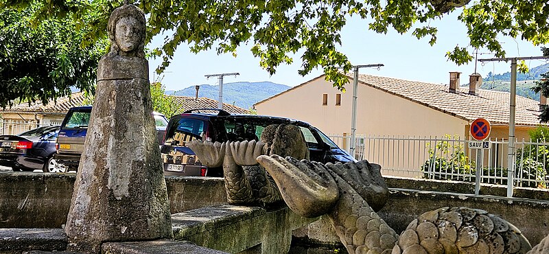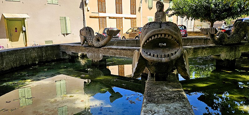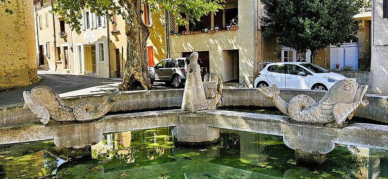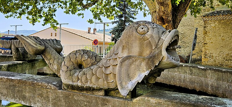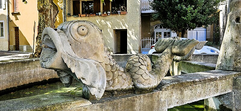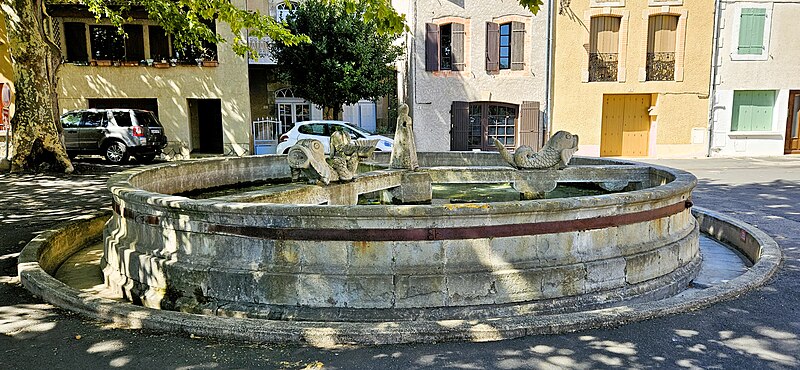 La fontaine monumentale de Montazels, dans l'Aude, a été réalisée par trois artisans locaux entre 1751 et 1784. La vasque porte la date de 1839, qui correspond à une réparation. Par la suite, divers aménagements et travaux ont été effectués : en 1855 un bassin a été construit à la source, en 1862 la conduite a été réparée, en 1876 la conduite, encore à ciel ouvert, a été modifiée, en 1879 un projet de captation de trois sources situées à 1,5 km à l'ouest du village a été lancé car la première source était devenue insuffisante, et en 1883 des tuyaux en fonte ont remplacé les canalisations de maçonnerie. L'édifice a été inscrit au titre des monuments historiques en 1951. La grande vasque circulaire est divisée en trois secteurs par des bras de pierre rayonnant d'une pyramide centrale. Vers le milieu de chaque bras se trouve un support en pierre taillé en forme d'esse, surmonté d'un dauphin de pierre. Les dauphins, représentés la tête levée, le corps couvert d'écailles et la queue lovée avec l'extrémité redressée, laissaient à l'origine jaillir l'eau de leur gueule ; aujourd'hui l'eau sort de tuyaux métalliques qui y sont fixés.