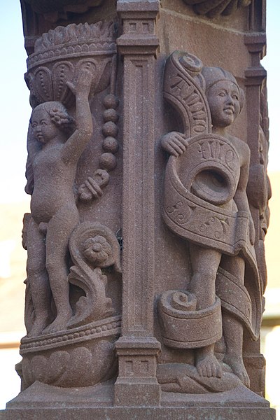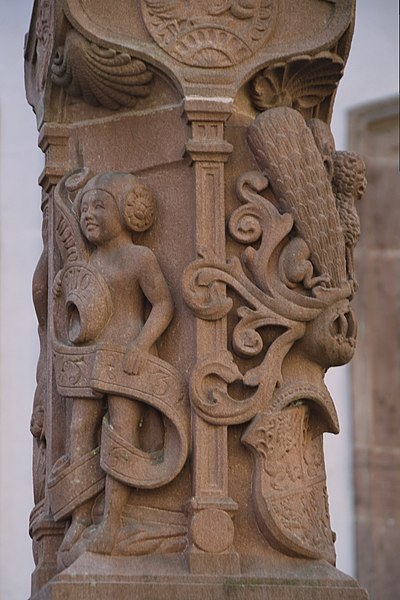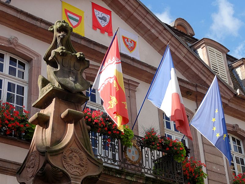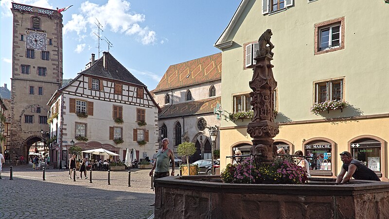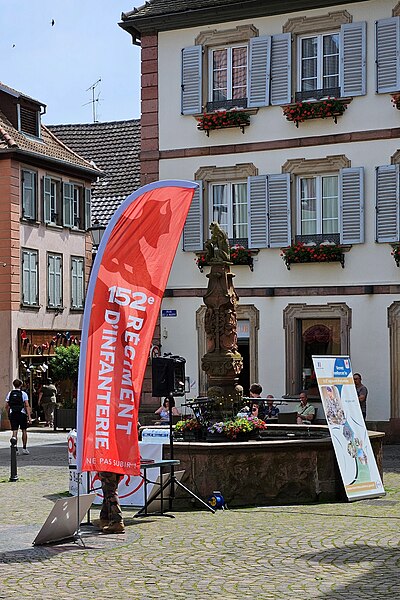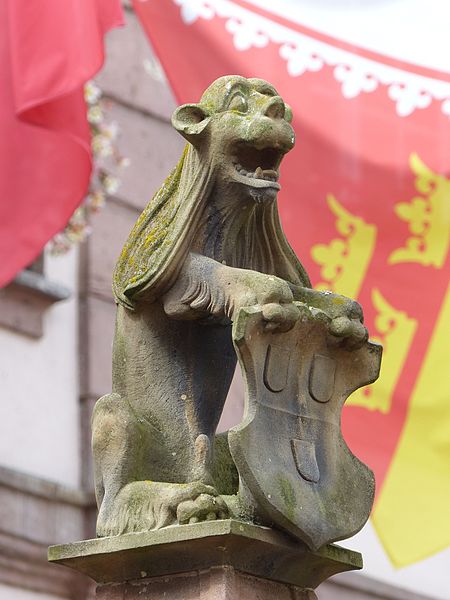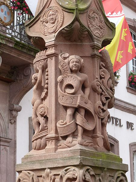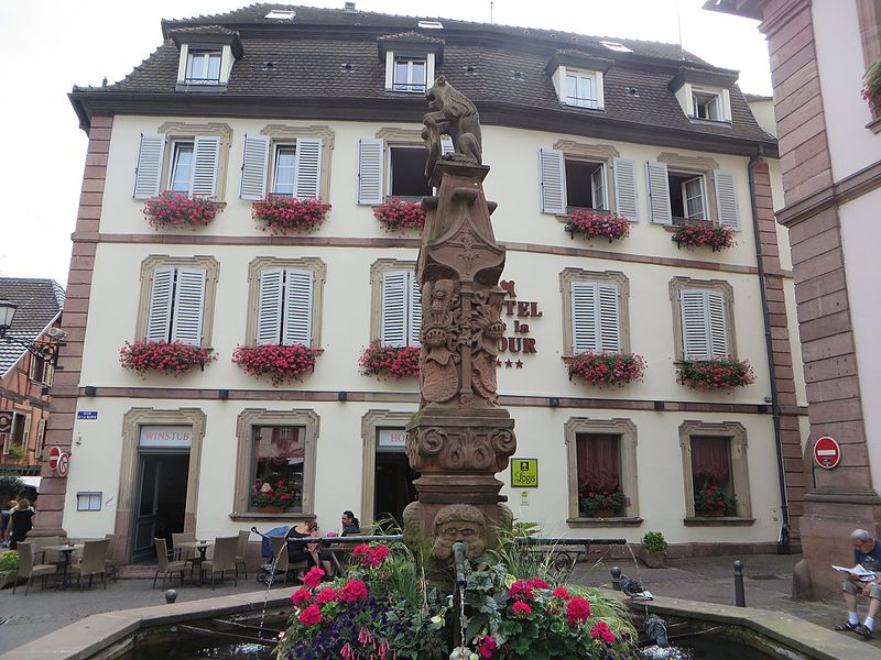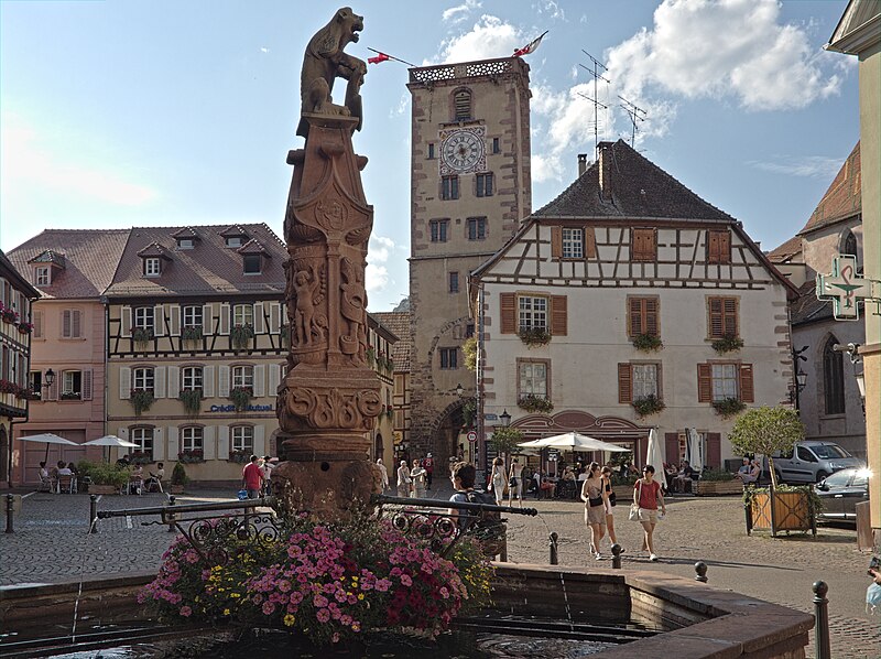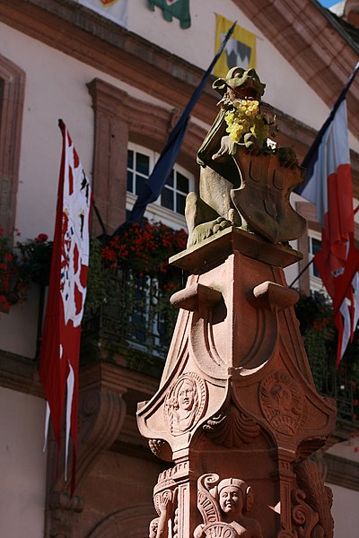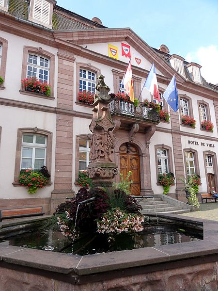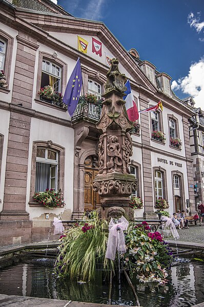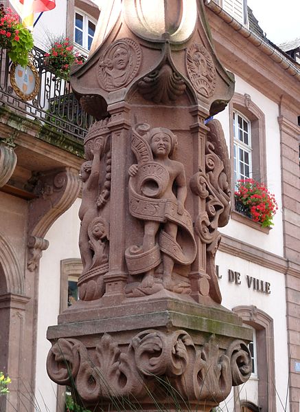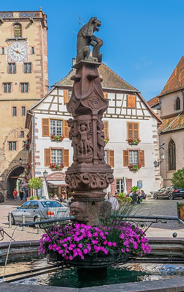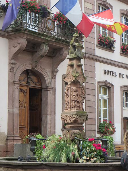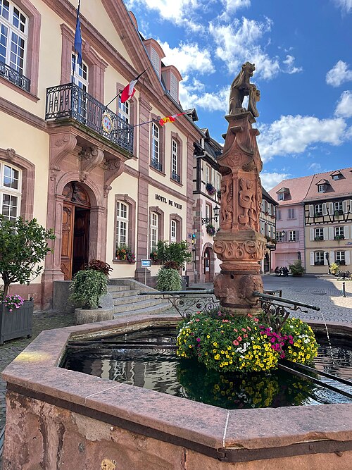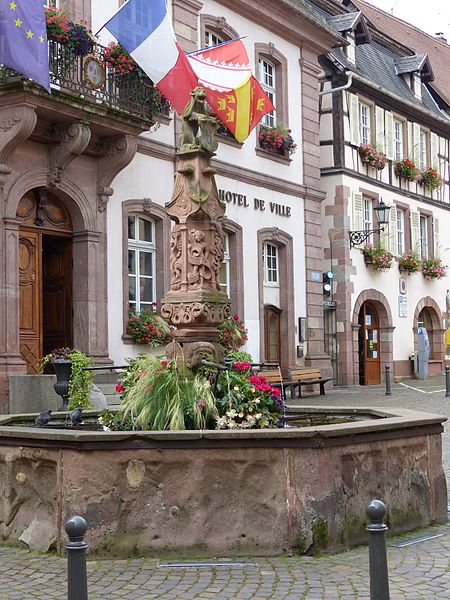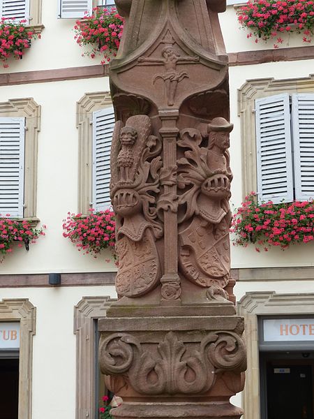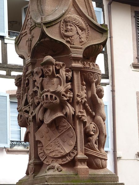 La fontaine de Ribeauvillé, située place de l'Hôtel-de-Ville dans le Haut-Rhin, porte la date 1536 inscrite sur un phylactère tenu par un personnage casqué. Elle arbore les armoiries de Guillaume II de Ribeaupierre accompagnées du collier de la Toison d'or et, sur un autre écu, celles de Geroldseck. La partie centrale du fût semble avoir été entièrement remplacée, le décor ayant été restitué à l'identique. L'édifice est inscrit au titre des monuments historiques depuis 1932. Il figure dans les listes des monuments historiques de Ribeauvillé et du Haut-Rhin, et des images ainsi que des notices sont consultables sur Wikimedia Commons et sur les portails consacrés aux bassins, aux fontaines et aux monuments historiques.