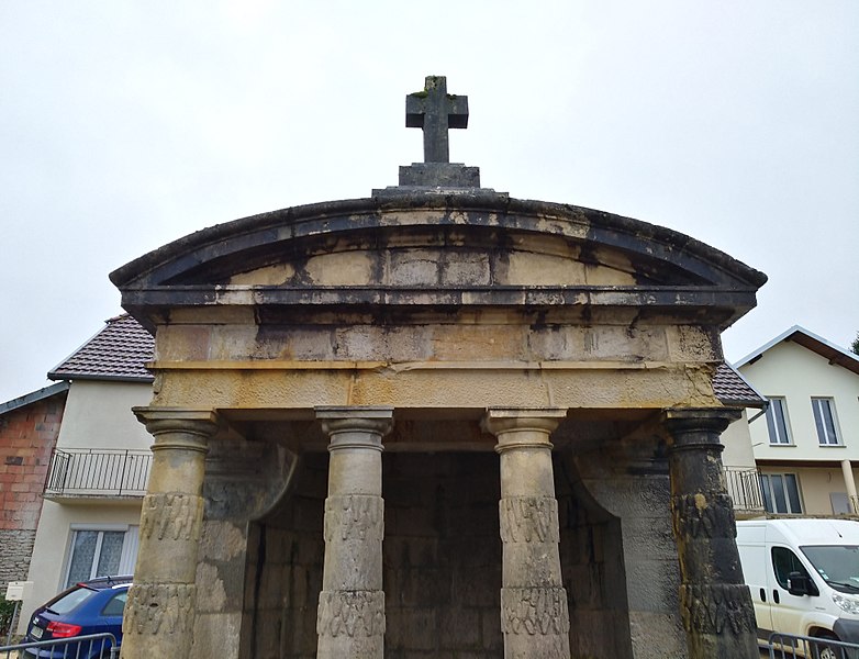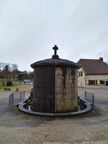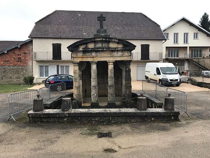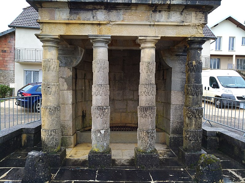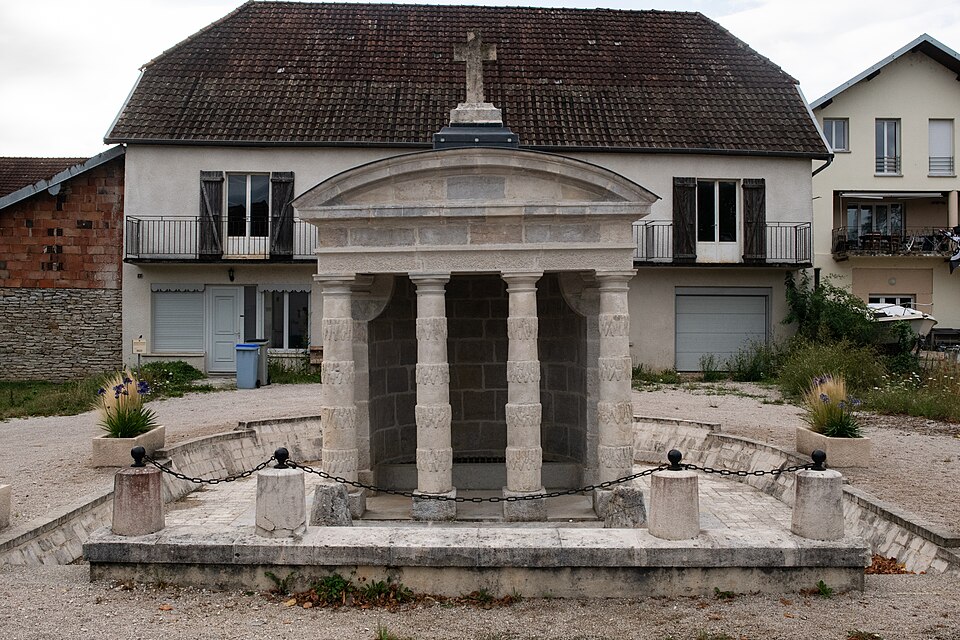 La grande fontaine de Sermange est une fontaine publique semi-circulaire à quatre colonnes de style néo‑classique, située dans la commune de Sermange (Jura), en Bourgogne‑Franche‑Comté. Classée au titre des monuments historiques, elle remonte au XVIIIe siècle et est attribuée à l’architecte Antoine‑Louis Attiret, assisté du sculpteur Claude‑François Attiret. À l’instar de la fontaine d’Arans à Dole, construite par le même architecte, ses colonnes baguées sont ornées de congélations imitant des glaçons. L’édifice comprenait à l’origine un puisard, un abreuvoir et un lavoir ; seul le pavillon de source subsiste. Il présente une entrée néo‑classique aux colonnes sculptées et est surmonté d’une croix. La fontaine a été classée en 1970 ; elle ne doit pas être confondue avec la fontaine du lavoir, située à l’extérieur du village et inscrite aux monuments historiques en 1941. Une restauration a été effectuée en 1982, mais le linteau du fronton, en pierres gélives, s’est dégradé à la fin des années 2000 et des désordres sont apparus dans les joints des pierres de toiture. Le risque de chutes de pierres a conduit la municipalité à prévoir des travaux de mise en sécurité, et le diagnostic a révélé la nécessité de renforcements importants en sous‑œuvre pour stabiliser l’édifice construit sur un terrain argileux soumis au phénomène de retrait‑gonflement. La Fondation du patrimoine a présenté le dossier à la Mission Patrimoine (Patrimoine en péril) en valorisant la partie historique du bâtiment ; en septembre 2020 la commune a été retenue, parmi cent autres, pour l’attribution d’une aide de 60 000 €. Les travaux de restauration ont été réalisés en 2021. La documentation comprend notamment un gros plan sur l’une des quatre colonnes et des références figurent dans la base Mérimée ainsi que sur les portails consacrés aux bassins, aux fontaines et aux monuments historiques.