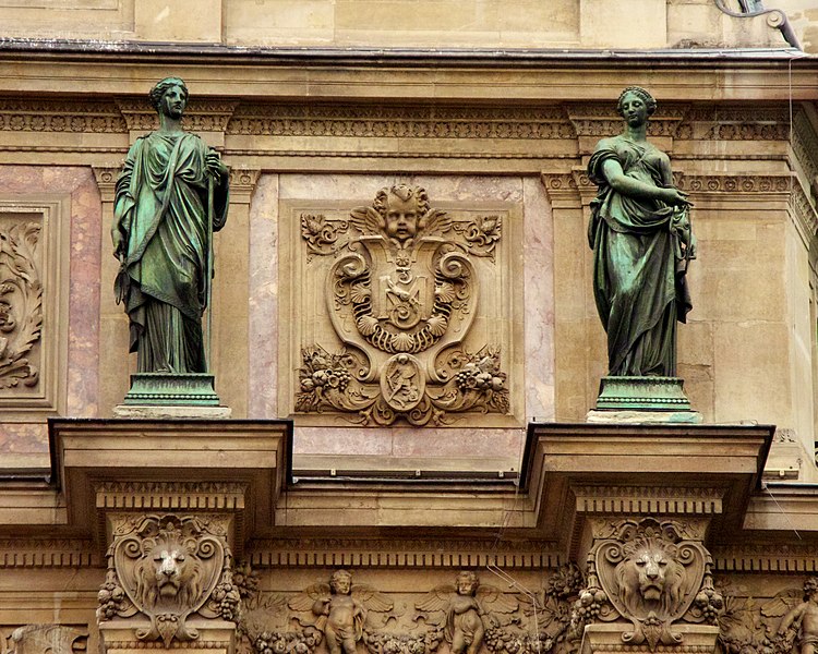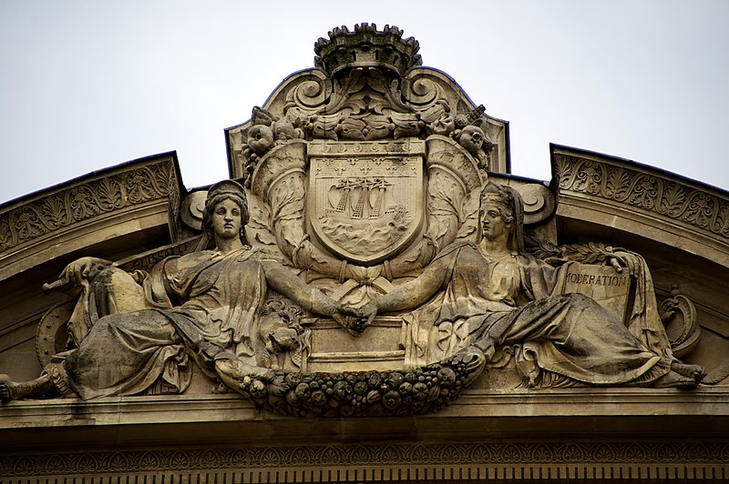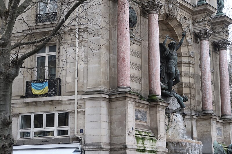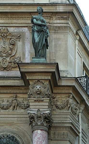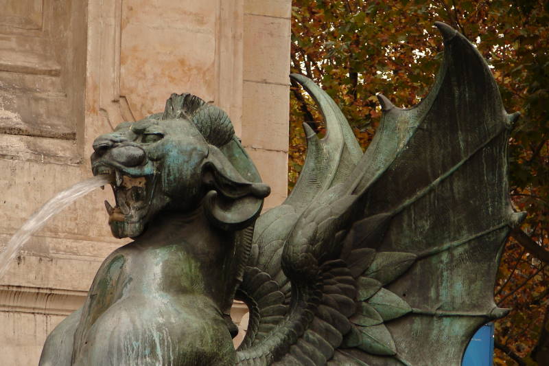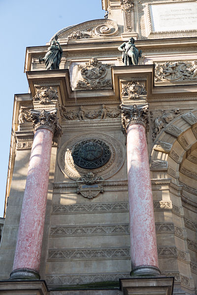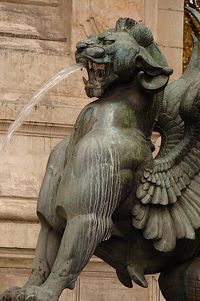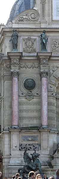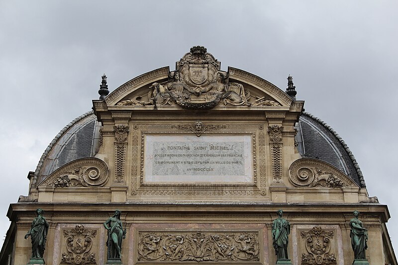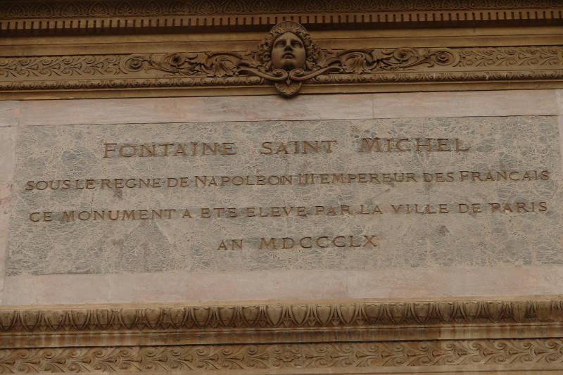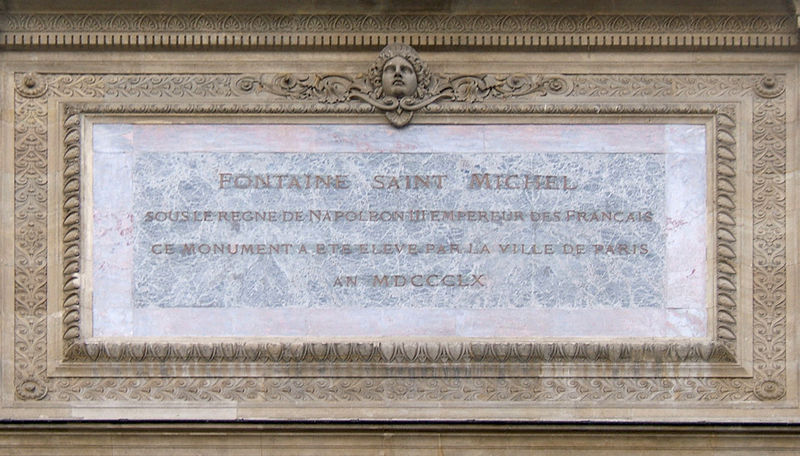 La table du fronton porte l'inscription rappelant que le monument fut élevé par la ville de Paris sous le règne de Napoléon III en 1860. Sur les piédestaux des chimères, des textes ajoutés après les combats de la Libération en août 1944 rendent hommage aux soldats des Forces françaises de l'intérieur et aux habitants des Ve et VIe arrondissements qui trouvèrent la mort en combattant.