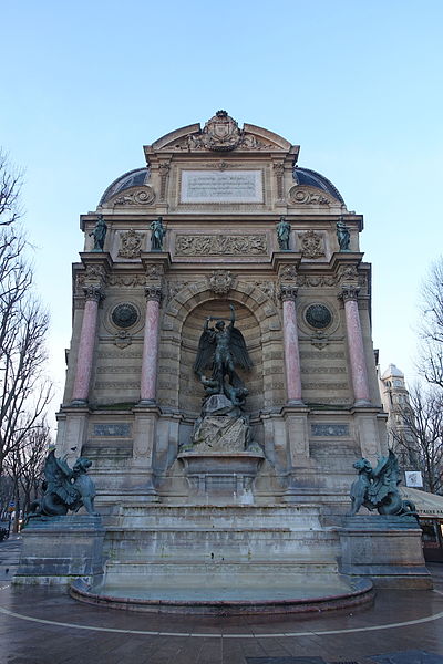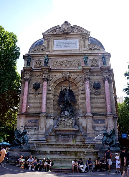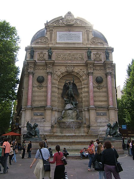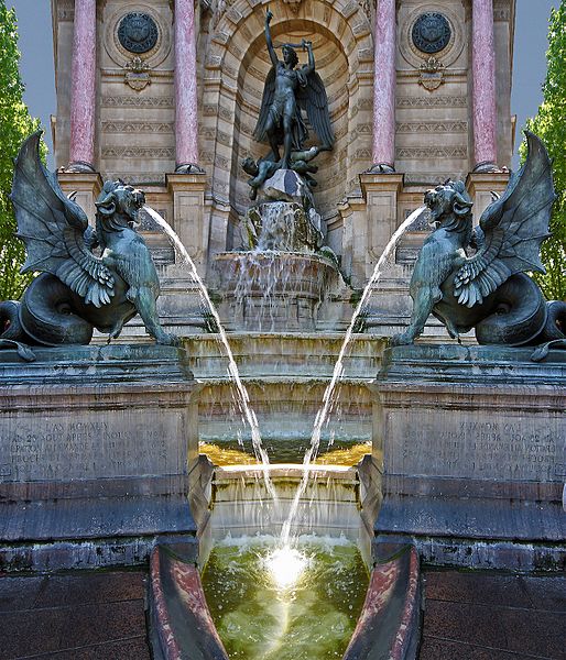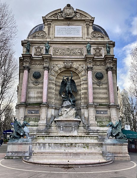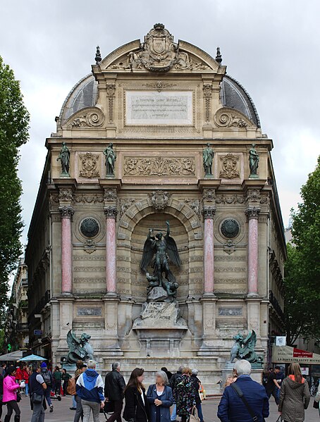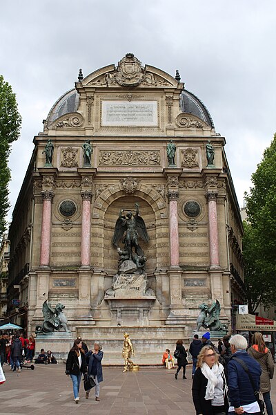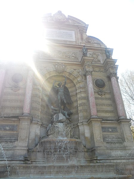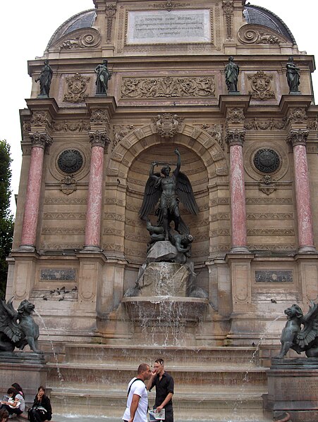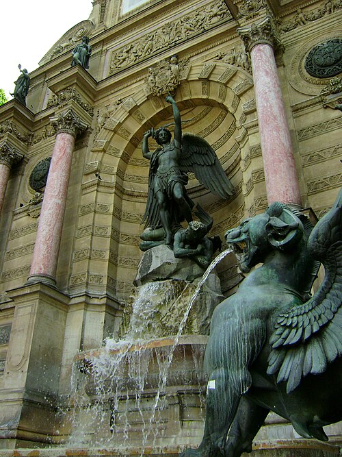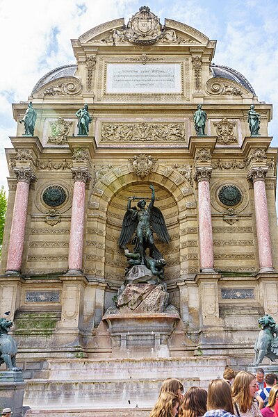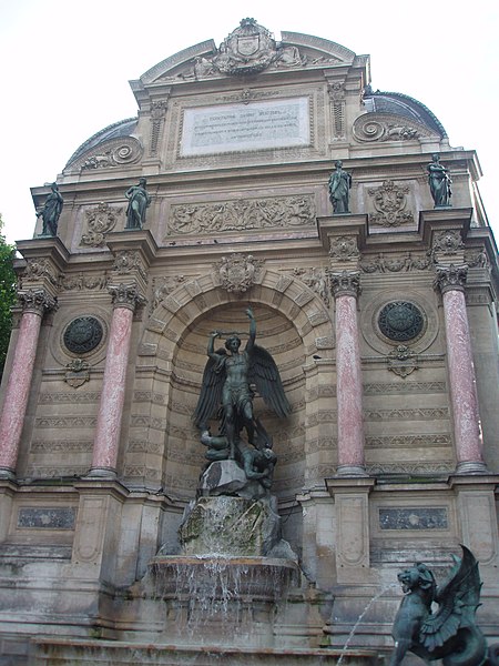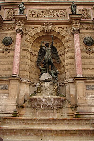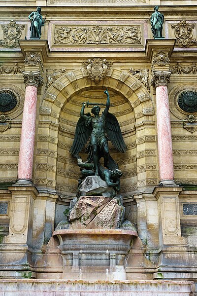 Huit sculpteurs participèrent à la décoration : Francisque Duret réalisa la statue de Saint‑Michel terrassant le démon dans la niche centrale ; Félix Saupin sculpta le rocher sur lequel se tient saint Michel ; Henri‑Alfred Jacquemart exécuta les deux chimères ailées crachant de l'eau en avant du bassin ; Claude Vignon signa les bas‑reliefs d'ornement et de rinceaux ; Auguste‑Hyacinthe Debay réalisa La Puissance et La Modération soutenant les armes de Paris sur le fronton supérieur ainsi que La Force parmi les vertus ; Jean‑Auguste Barre créa La Prudence, Élias Robert La Justice et Charles Gumery La Tempérance. Les chimères ailées et les rinceaux complètent l'ensemble sculpté.