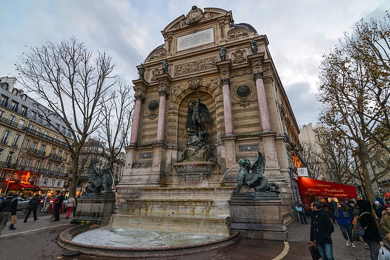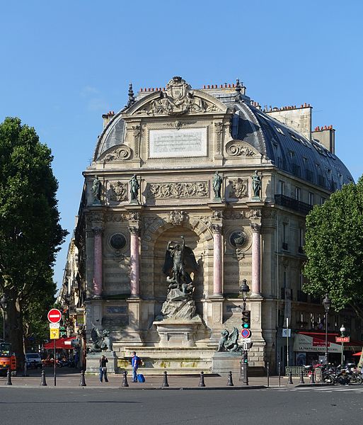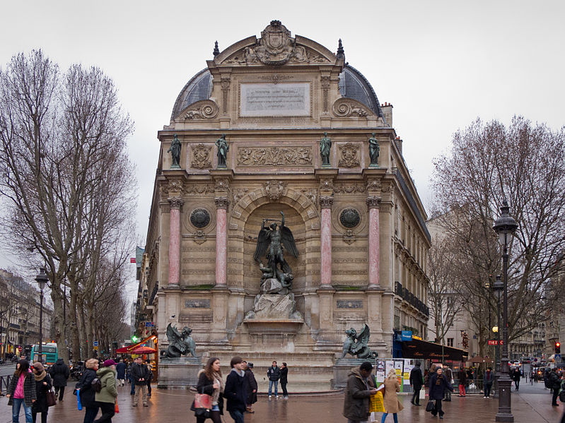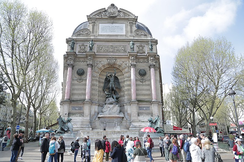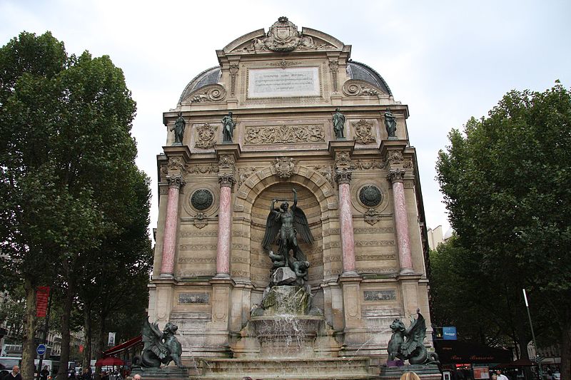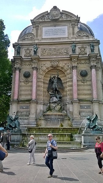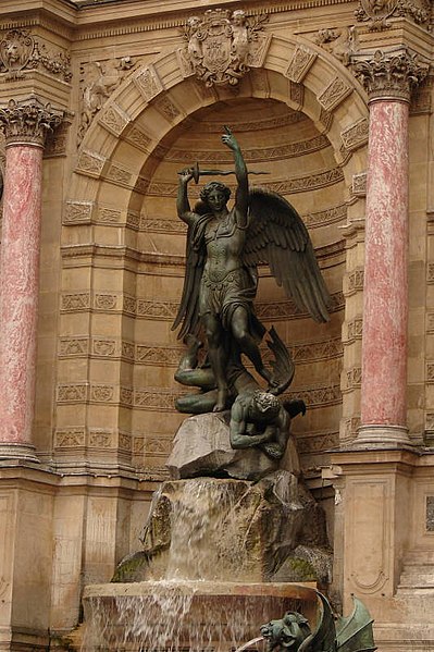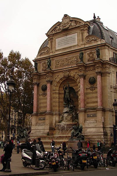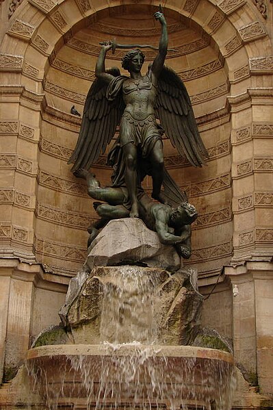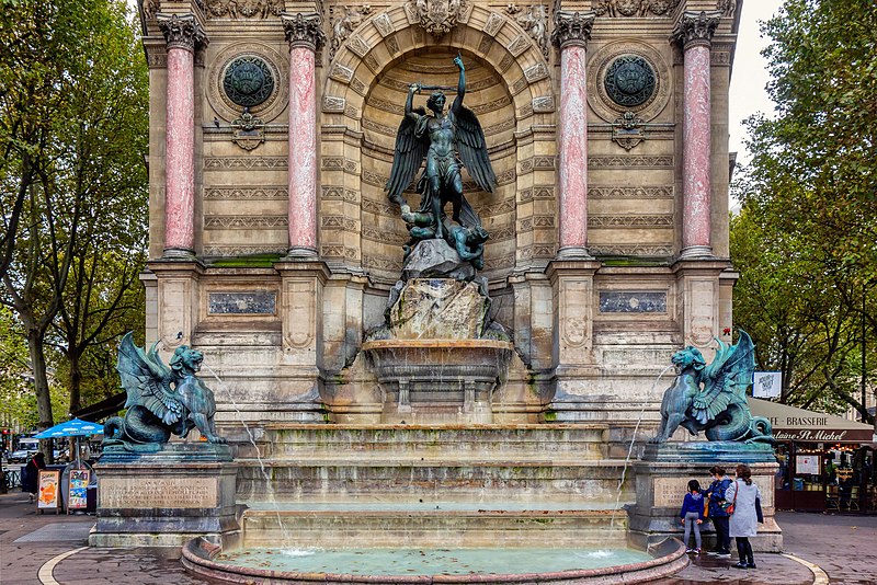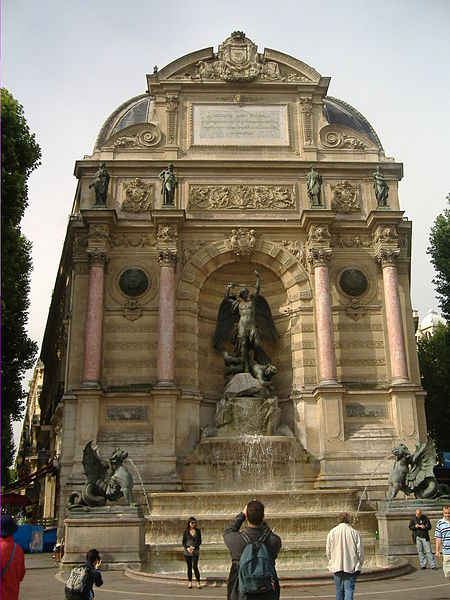Huit sculpteurs participèrent à la décoration : Francisque Duret réalisa la statue de Saint‑Michel terrassant le démon dans la niche centrale ; Félix Saupin sculpta le rocher sur lequel se tient saint Michel ; Henri‑Alfred Jacquemart exécuta les deux chimères ailées crachant de l'eau en avant du bassin ; Claude Vignon signa les bas‑reliefs d'ornement et de rinceaux ; Auguste‑Hyacinthe Debay réalisa La Puissance et La Modération soutenant les armes de Paris sur le fronton supérieur ainsi que La Force parmi les vertus ; Jean‑Auguste Barre créa La Prudence, Élias Robert La Justice et Charles Gumery La Tempérance. Les chimères ailées et les rinceaux complètent l'ensemble sculpté.
