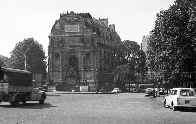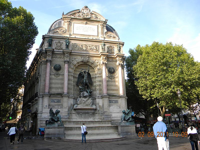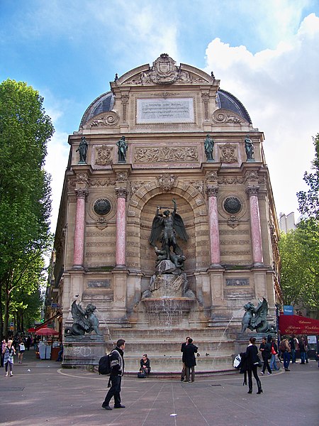 À son inauguration, la critique fut majoritairement négative : l'éclectisme et la polychromie furent jugés incohérents, la profusion d'intervenants sculpturaux affaiblissant la valeur individuelle des œuvres, et l'implantation contre un mur fut reprochée, certains regrettant qu'une statue ne fût pas placée au centre de la place. La fontaine Saint‑Michel représente la dernière grande fontaine‑mur réalisée à Paris dans la tradition renaissante, les fontaines monumentales postérieures étant davantage isolées au centre des places ou des squares. Un quatrain anonyme de l'époque refléta cette hostilité en tournant en dérision la qualité des sculptures.