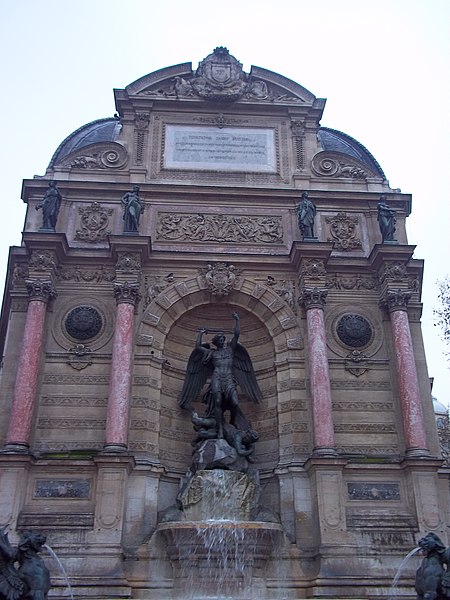 S'inspirant de la partie centrale de la fontaine dell'Acqua Felice à Rome et de la fontaine Médicis du jardin du Luxembourg, la composition évoque un arc de triomphe : une travée rythmée par des colonnes corinthiennes, une niche centrale encadrée de quatre colonnes et un fronton. L'assemblage, haut de 26 mètres et large de 15 mètres, comprend quatre statues de bronze représentant les vertus cardinales au‑dessus des colonnes. Sa polychromie vise à compenser le manque d'éclairement : marbre rouge du Languedoc pour les colonnes, marbre vert de mer pour la table du fronton, pierre bleue de Soignies pour le rocher soutenant saint Michel et calcaire jaune de Saint‑Ylie.