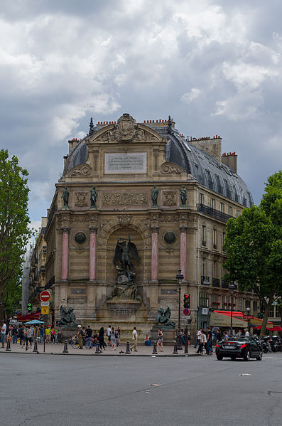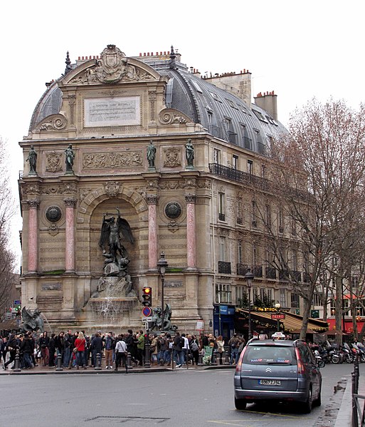 La fontaine Saint‑Michel, anciennement dite fontaine de Sébastopol, occupe la place Saint‑Michel dans le 6e arrondissement de Paris et s'étend sur tout un mur pignon au croisement du boulevard Saint‑Michel, de la place Saint‑André‑des‑Arts et de la rue Danton, face à la rive gauche de la Seine. Elle se situe au débouché du pont Saint‑Michel, dans un axe qui se prolonge vers le nord par le boulevard du Palais et le pont au Change, puis rejoint la rive droite par la place du Châtelet et le boulevard de Sébastopol ; lors de sa construction, ce boulevard englobait l'actuel boulevard Saint‑Michel, ce qui explique son ancien nom. Le site est desservi par la station de métro Saint‑Michel et la gare RER Saint‑Michel – Notre‑Dame.