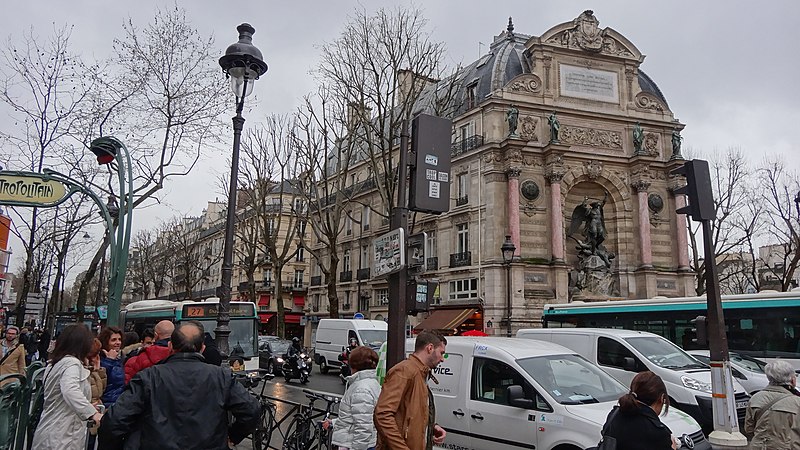Inscrite dans le plan d'aération d'Haussmann sous Napoléon III, la fontaine fut commandée pour marquer la nouvelle place créée au débouché du pont et pour offrir un débouché visuel à la perspective du boulevard du Palais. Une première proposition prévoyait une statue colossale de Napoléon Ier, abandonnée au profit d'un programme allégorique destiné à rappeler la chapelle Saint‑Michel en la Cité : l'archange Michel terrassant le démon, entouré de chimères ailées. Le site présentait des contraintes importantes : il se trouvait en contrebas du pont, adossé à un pignon très élevé, peu éclairé et orienté au nord. L'architecte Gabriel Davioud, assisté des inspecteurs Flament et Simonet, conçut la fontaine ; les travaux de fontainerie furent exécutés par Halo sous la direction de l'ingénieur Belgrand et la statue de Saint‑Michel fut fondue par la fonderie Thiébaut Frères. Le chantier commença en juin 1858, la fontaine fut inaugurée en 1860 et elle est inscrite au titre des monuments historiques depuis 1926.