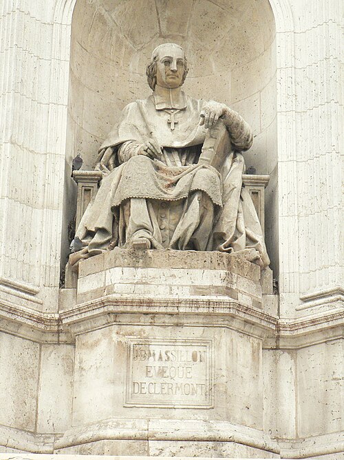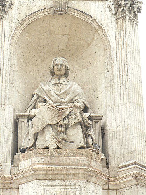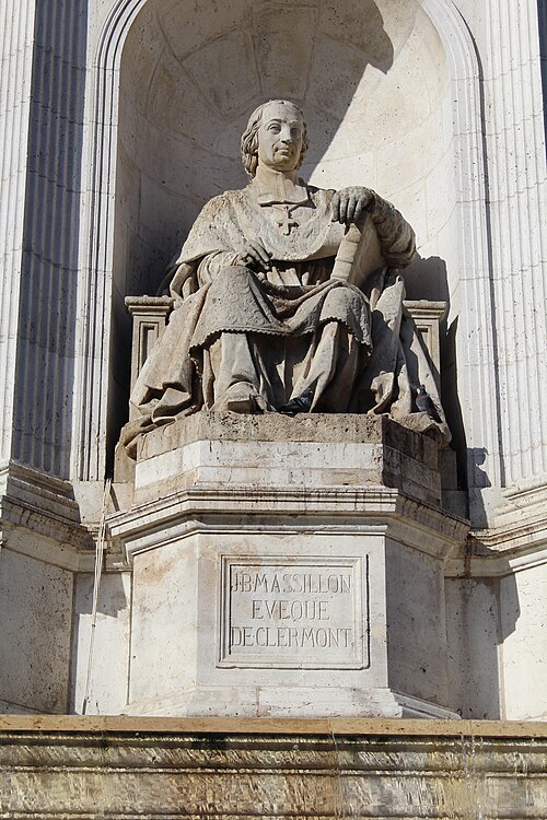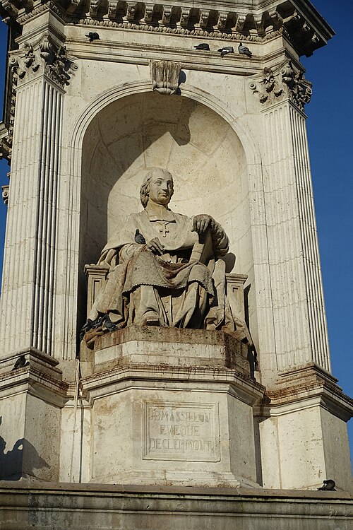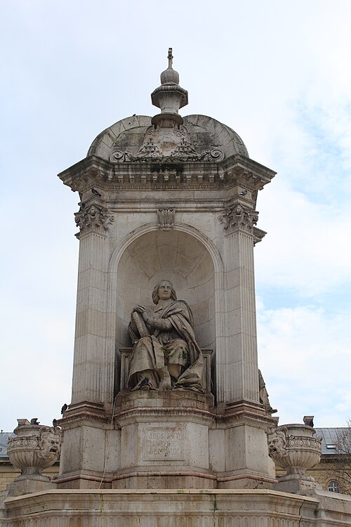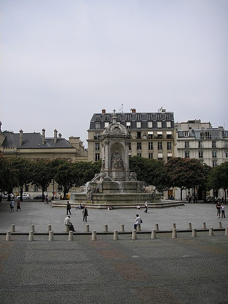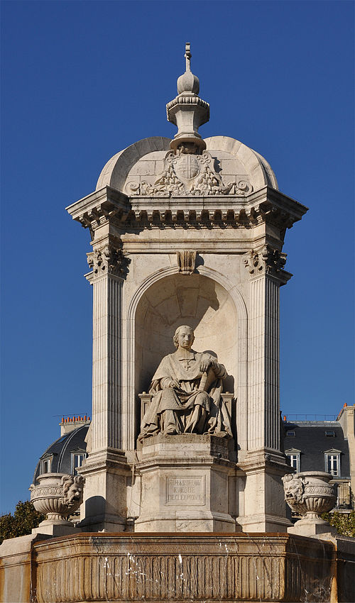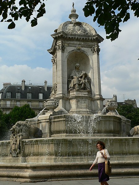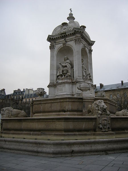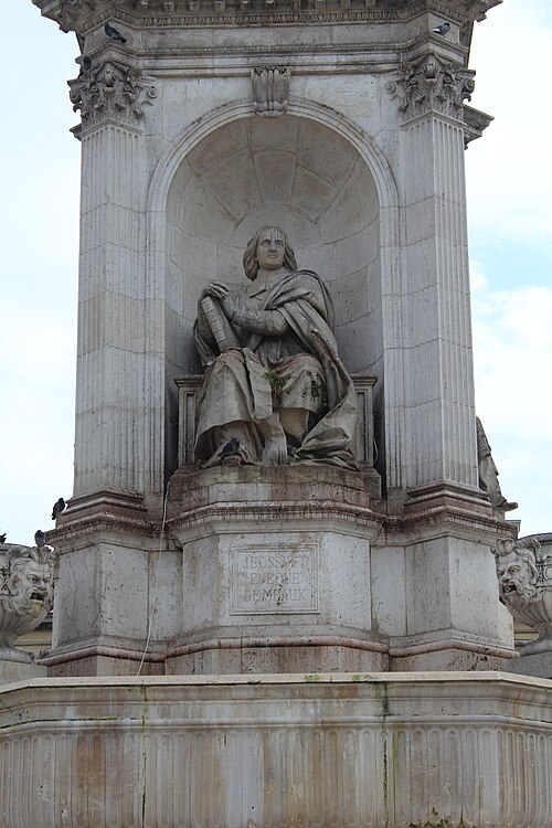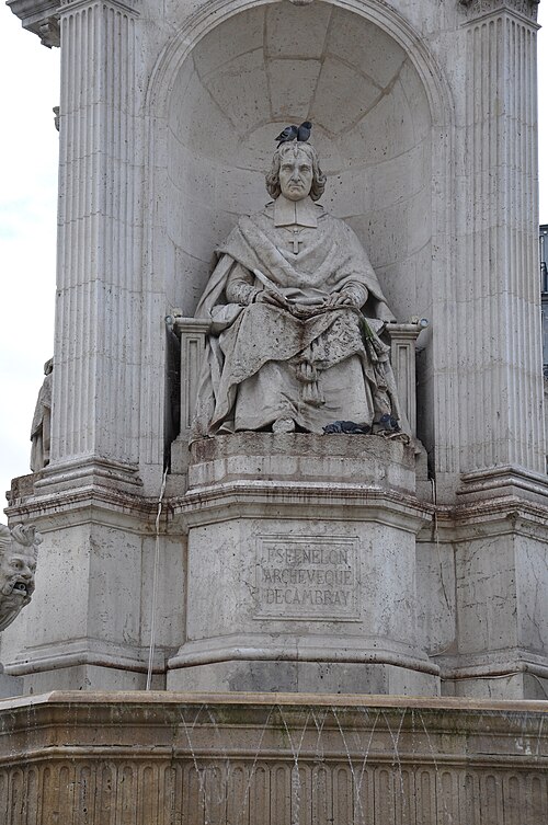 La fontaine Saint-Sulpice se situe sur le parvis de l'église Saint-Sulpice, place Saint-Sulpice, dans le 6e arrondissement de Paris. Surnommée fontaine des orateurs sacrés et, par plaisanterie, fontaine des quatre points cardinaux, elle est ornée de quatre statues d'évêques célèbres pour leurs talents d'orateurs à l'époque de Louis XIV ; ces faces sont à peu près alignées sur les points cardinaux, bien que les évêques n'aient jamais été nommés cardinaux. Érigée de 1843 à 1848 par l'architecte Louis Visconti et l'entrepreneur Antoine Vivenel, elle occupe le centre de la place dont le projet urbain initial, conçu par Giovanni Niccolo Servandoni, ne fut pas mené à terme. À l'extrémité de la place se trouvait autrefois la fontaine de la Paix, édifiée en 1807 et déplacée en 1824 en raison de ce projet. Monumentale, la fontaine repose sur un soubassement formé de trois bassins octogonaux disposés en pyramide ; le premier bassin a environ dix mètres de largeur. Sur ce socle s'élève un édicule massif à base carrée, couronné d'un toit en baldaquin portant un épi de faîtage cruciforme ; l'ensemble atteint environ douze mètres de hauteur. Chaque face de l'édicule, surmontée d'un fronton aux armes épiscopales et encadrée de pilastres, abrite une niche contenant une statue d'évêque assis, réalisées plus grandes que nature. Le second bassin est orné de quatre lions tenant les armoiries de Paris, et les angles du troisième bassin portent quatre vasques d'où s'écoule l'eau ; les deux bassins supérieurs débordent pour former des cascades. Traité dans un style renaissance, cet ensemble offre un équilibre harmonieux et un fort attrait visuel. Les quatre évêques représentés sont Jacques-Bénigne Bossuet (1627-1704), évêque de Meaux, sculpté par Jean-Jacques Feuchère (face nord) ; François de Salignac de La Mothe-Fénelon (1651-1715), archevêque de Cambrai, par François Lanno (face est) ; Esprit Fléchier (1632-1710), évêque de Lavaur et de Nîmes, par Louis Desprez (face ouest) ; et Jean-Baptiste Massillon (1663-1742), évêque de Clermont-Ferrand, par Jacques-Auguste Fauginet (face sud).