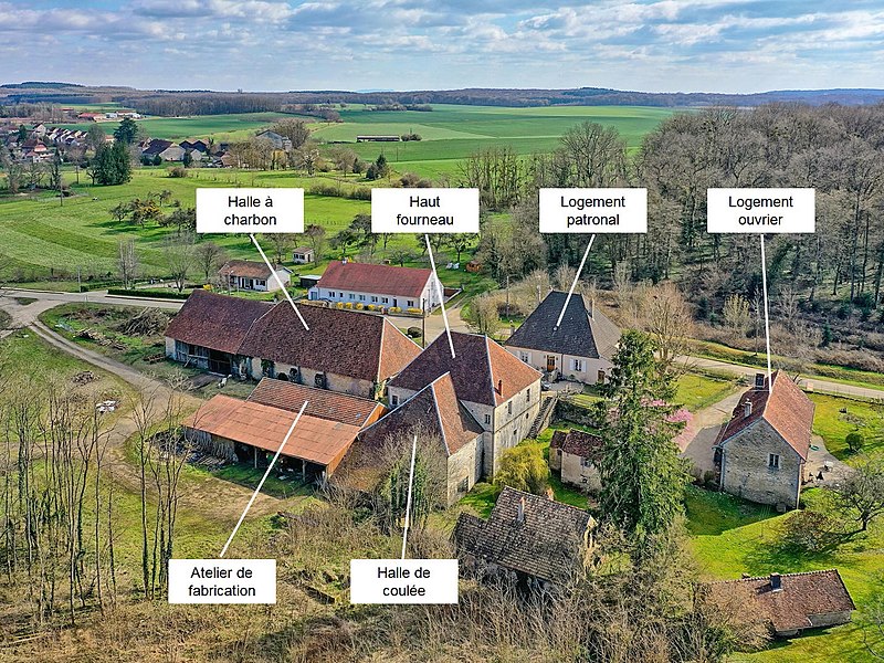 Le site conserve une configuration architecturale lisible : le bâtiment du haut fourneau, construit contre un talus avec son mur sud semi-enterré, est couvert d'un toit à croupes, la halle de coulée se situe en contrebas près du ruisseau, et la halle à charbon, elle aussi construite à flanc de talus, présente un toit à longs pans avec demi-croupe et un mur nord épaulé de contreforts. Les logements ouvriers, en moellon de calcaire et couverts en tuile plate, comprennent une maison ouest à un étage carré avec deux logements encadrant une grange et une maison nord en rez-de-chaussée abritant trois logements. Le logement patronal, vraisemblablement édifié au milieu du XVIIIe siècle, est construit en moellon de calcaire enduit, en rez-de-chaussée, et couvert d'une haute toiture à croupes en tuile mécanique.
