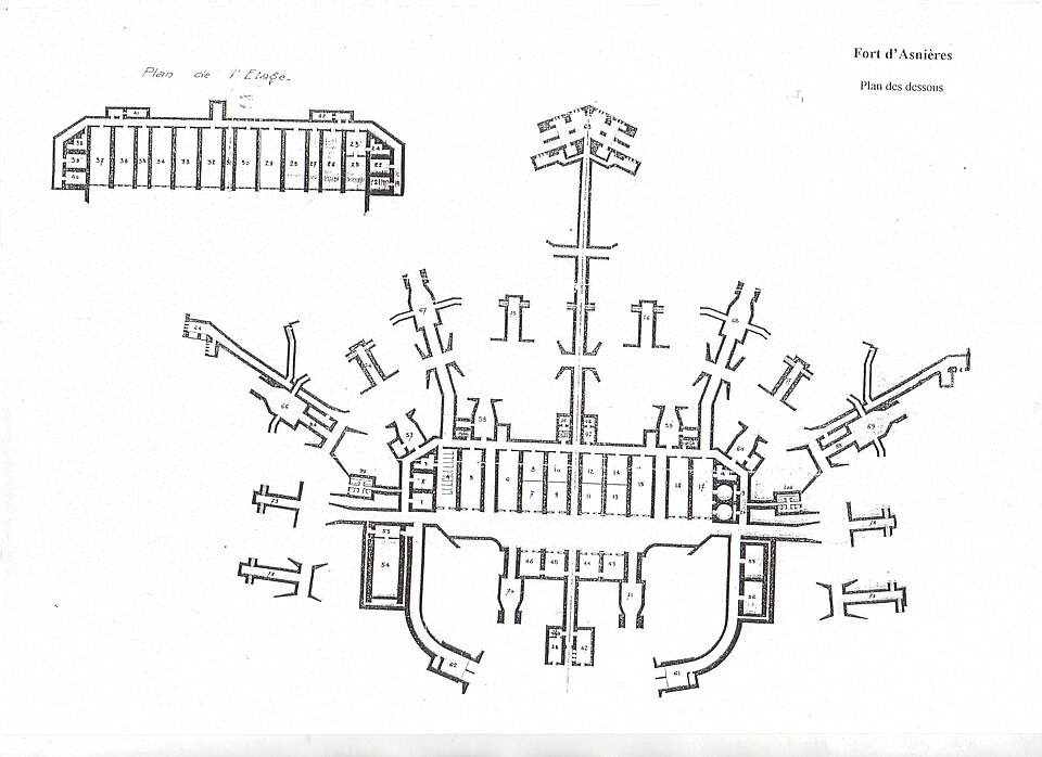 Implanté au nord de l'agglomération dijonnaise, à la limite des deux communes, son altitude moyenne est de 362 mètres. Après la défaite de 1870‑1871, Dijon fut intégré à la « deuxième ligne » du système de défense, aux côtés de villes comme Langres, Besançon, Reims, Laon et La Fère, tandis que la première ligne comprenait Verdun, Toul, Épinal et Belfort. Entre 1875 et 1883, une série d'ouvrages — dont la redoute de Saint‑Apollinaire, les forts de Varois, Sennecey, Beauregard, la Motte‑Giron, d'Hauteville et le réduit du Mont‑Afrique — ceintura l'agglomération ; le fort d'Asnières y occupe une place parmi ces éléments. Sa construction a eu lieu entre 1876 et 1877.