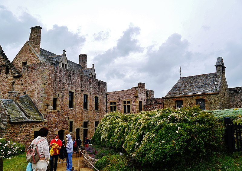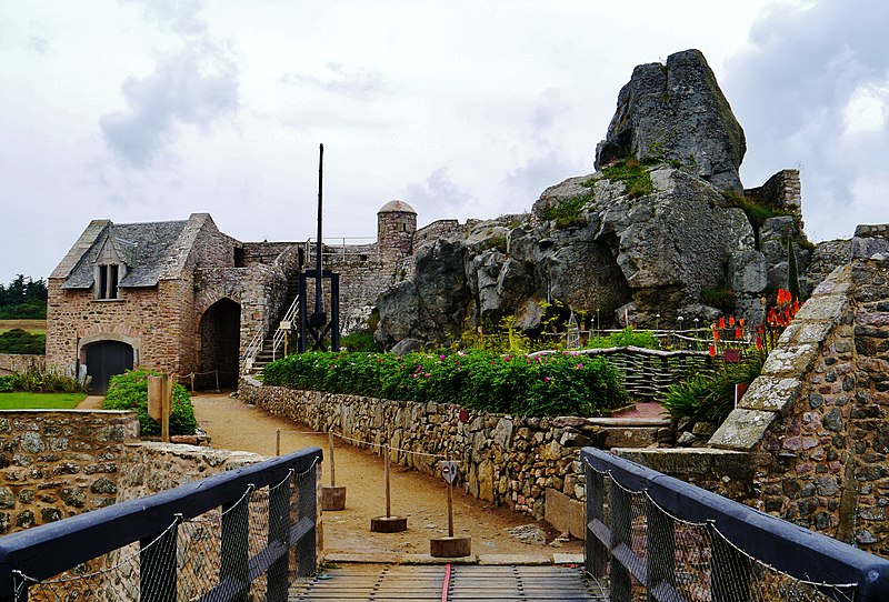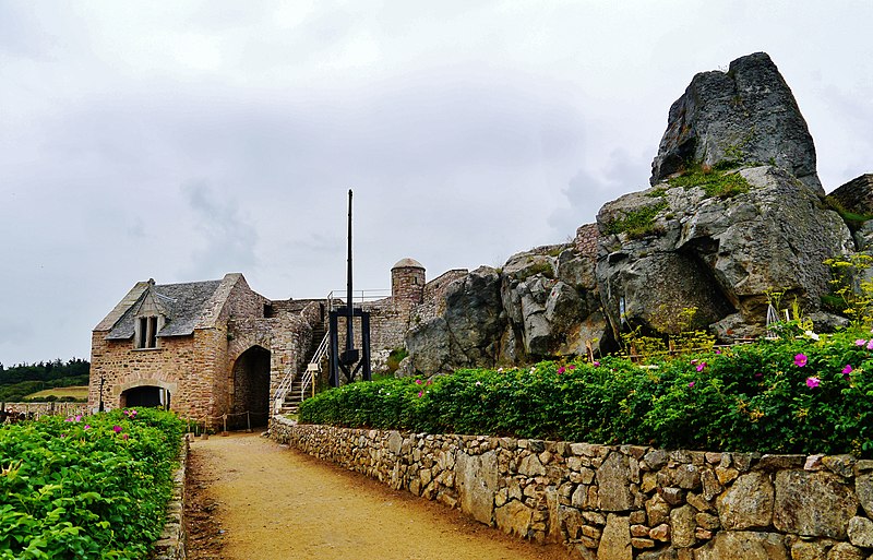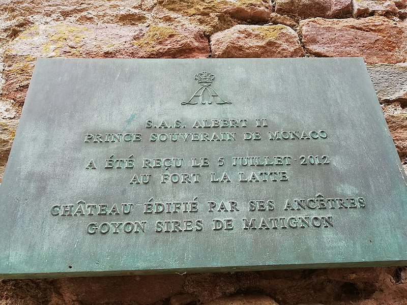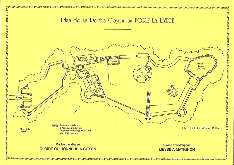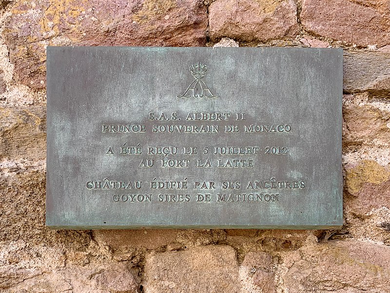 Le fort de la Latte, aussi appelé château de la Roche-Goyon, se dresse sur la pointe de la Latte, près du cap Fréhel, sur la commune de Plévenon en baie de Saint-Malo, dans les Côtes-d'Armor. Le site, naturellement peu accessible, offre une vue dégagée sur la Manche et la Côte d'Émeraude, raison essentielle de son implantation. La construction est essentiellement en granite ; le grès a pu être prélevé sur les falaises voisines et des traces d'anciennes carrières subsistent sur le littoral. Le fort occupait un emplacement stratégique, proche des voies commerciales reliant Saint-Malo, la Normandie et les îles Anglo-Normandes. Il renferme des éléments datés des XIIIe et XIVe siècles et la tradition rapporte qu'une tour aurait occupé ce point dès 937, bâtie par Goyon, seigneur de Matignon. La forteresse telle qu'on la connaît fut édifiée au XIVe siècle par Étienne III Goüyon ; son donjon est daté des années 1365-1370. En 1379, à la suite du retour d'exil du duc de Bretagne Jean IV, le château fut assiégé par Bertrand Du Guesclin. Il fut repris en 1597 lors des guerres de Religion et partiellement incendié, avant d'être bastionné sous le règne de Louis XIV, qui acheta le domaine en 1689 et le fit transformer en respectant les constructions antérieures. Colbert de Croissy, en 1665, le décrit alors en ruine et habité par un concierge ; il appartenait à cette époque à François Gouyon de Matignon. Le fort fut utilisé jusqu'à la fin du Premier Empire, puis vendu à divers propriétaires à partir de 1892 avant d'être acquis en 1931 par Frédéric Joüon des Longrais, qui entreprit d'importants travaux de restauration. Il est classé au titre des monuments historiques depuis le 11 août 1925 et le 28 février 1934. L'électricité n'y fut installée qu'en 2001. Le prince Albert II de Monaco a effectué une visite privée en 2012 et une nouvelle visite en 2025, en compagnie de sa famille, à l'occasion du tricentenaire de la mort de Jacques III de Matignon, et a partagé un déjeuner avec des représentants des institutions locales et la famille propriétaire. Le fort est séparé de la terre par deux crevasses franchies par des ponts : le premier pont, prolongé par une barbacane, est défendu par un châtelet, et le second, dit Grand pont, donne accès à la porte principale. La fortification comprend des murailles, un corps de garde et une enceinte flanquée de tours anciennes ; à l'intérieur se trouvent un bâtiment servant de caserne et une tour ovalisée pouvant dater du XIVe siècle. Les deux châtelets possèdent chacun un pont-levis ; la barbacane, séparée du château par un gouffre, était équipée d'une herse et d'une porte à double battant, et le premier châtelet, détruit par la canonnade lors d'une attaque, a été reconstruit. La cour abrite une citerne, une chapelle édifiée sous Louis XIV, le logis du gouverneur et un corps de garde ; elle fut remblayée au XVIIe siècle pour l'usage des canons, recouvrant jusqu'à huit mètres du niveau médiéval, et des fouilles ont mis au jour une tour carrée enfouie. La citerne, alimentée par les eaux pluviales, a une capacité de 20 000 litres pour approvisionner la garnison, et l'impossibilité de creuser un puits tient au massif granitique sur lequel le fort est établi ; à proximité se trouvait également un pont-levis factice destiné à détourner les attaquants vers des courants dangereux, dispositif qui se révéla peu efficace. La basse-cour, située entre la cour sud et la batterie basse au nord, entoure le promontoire rocheux supportant le donjon et abrite un four à boulets destiné à chauffer les projectiles, dispositif rarement utilisé en raison de sa consommation de bois, de la durée de chauffe nécessaire et des risques liés au chargement des pièces. Le donjon présente des mâchicoulis et différents types de meurtrières : arbalétrières en forme de croix, archères allongées pour l'arc, trous latéraux pour l'arquebuse et grands trous pour la bombarde ; une ligne de bombardement visible correspond à la prise du château au XVIe siècle. Quatre sculptures représentant le tétramorphe entourent le cercle de granite jaune qui entoure le donjon : l'ange de saint Matthieu face au châtelet, le lion de saint Marc, l'aigle de saint Jean (très abîmé) et le bœuf de saint Luc à droite de l'entrée ; l'emblème des Goyon-Matignon, une sirène, couronne le passage d'entrée, où le troisième pont-levis a été remplacé par un escalier et où l'on trouvait une herse et un assommoir dans la souricière. Une exposition sur les travaux de restauration occupe une partie du donjon et la dernière salle est couverte d'une voûte à croisée d'ogive datée de 1340. La batterie basse, à la pointe de la presqu'île face à la mer, était équipée de canons ; sous Louis XIV on comptait huit pièces dont les plus grandes avaient un fût de huit mètres, et des exemplaires « moyens » présents sur le site pouvaient envoyer un boulet jusqu'à un kilomètre, leur réglage étant facilité par un chemin de roulage en granite ; selon les archives militaires, un coup pouvait être tiré toutes les trois minutes. Sur le chemin menant au château se dresse un petit menhir que la tradition identifie comme « la dent » ou « le doigt » de Gargantua. Le fort a servi de décor pour de nombreuses productions cinématographiques et télévisuelles, de 1931 à 2023, dont parmi les plus connus Les Vikings (1958) et des adaptations récentes des Trois Mousquetaires. Depuis son ouverture au public, la famille Joüon des Longrais organise des manifestations sur le domaine, comme les Nuits celtiques en 2006 et 2007 et les Grandes Médiévales, organisées chaque mois d'août depuis 2008, ainsi que des petites médiévales tous les deux ans.