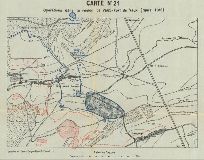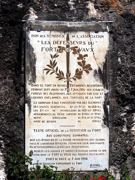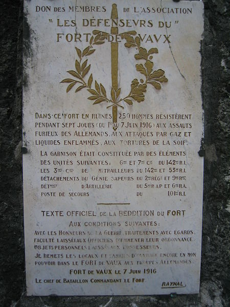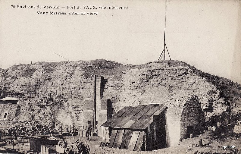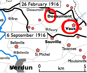 À la fin mai 1916, après la prise par les Allemands de la cote 304 et du Mort-Homme, l’offensive allemande chercha à s’emparer des positions qui permettraient d’atteindre Verdun, parmi lesquelles figuraient les forts de Souville et de Vaux. L’attaque sur Vaux, programmée au quatrième jour de l’offensive, fut avancée au 2 juin après des succès allemands précoces. Plus petit que le fort de Douaumont, Vaux avait été préparé à une éventuelle évacuation : des charges de démolition posées depuis 1915 furent mises en alerte, mais un obus de 420 mm détruisit la chambre contenant les détonateurs et un autre fit exploser la tourelle de 75 mm, privant l’ouvrage de ses derniers canons ; les quatre autres pièces de 75 mm, retirées en 1915, avaient été remplacées par des mitrailleuses.