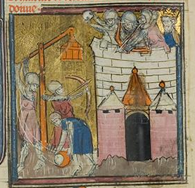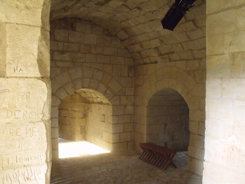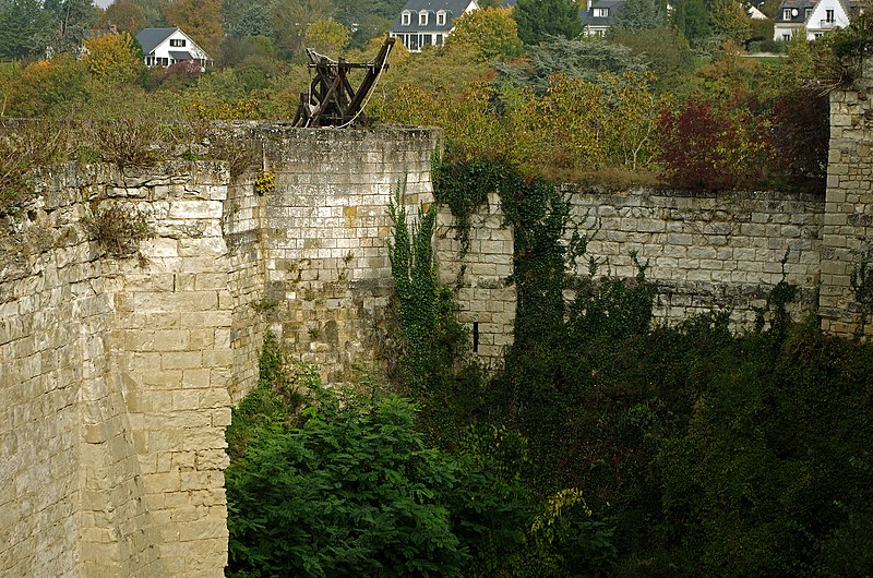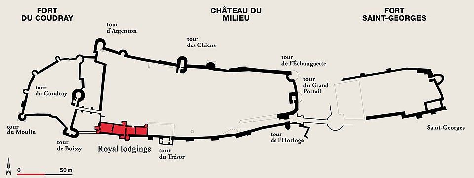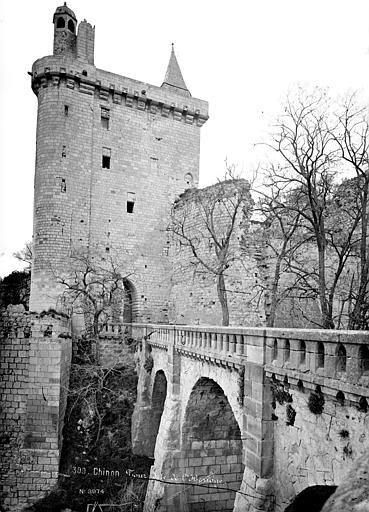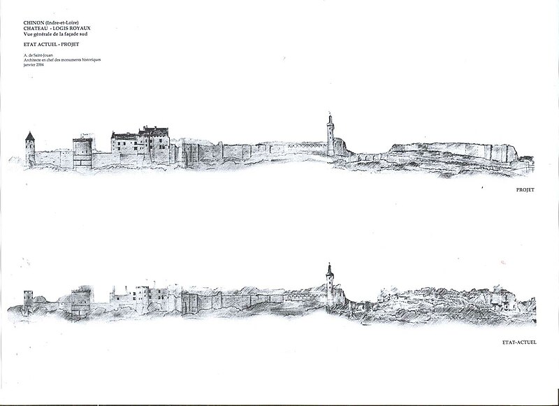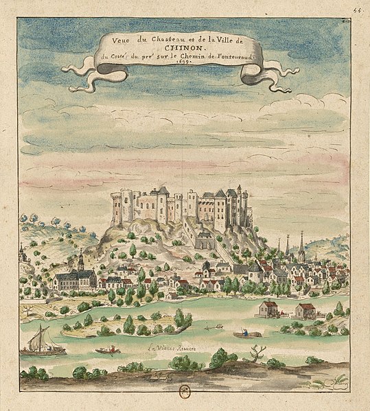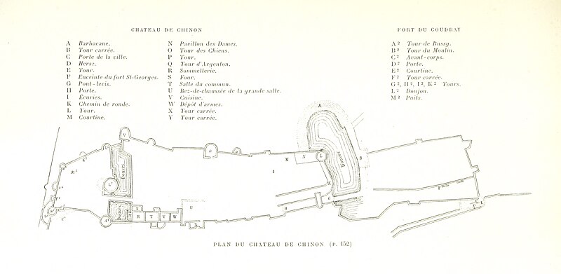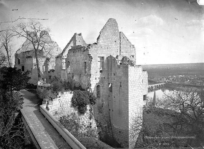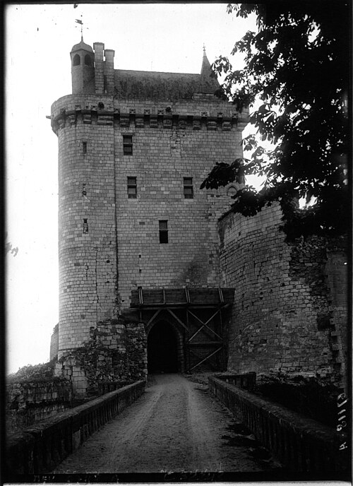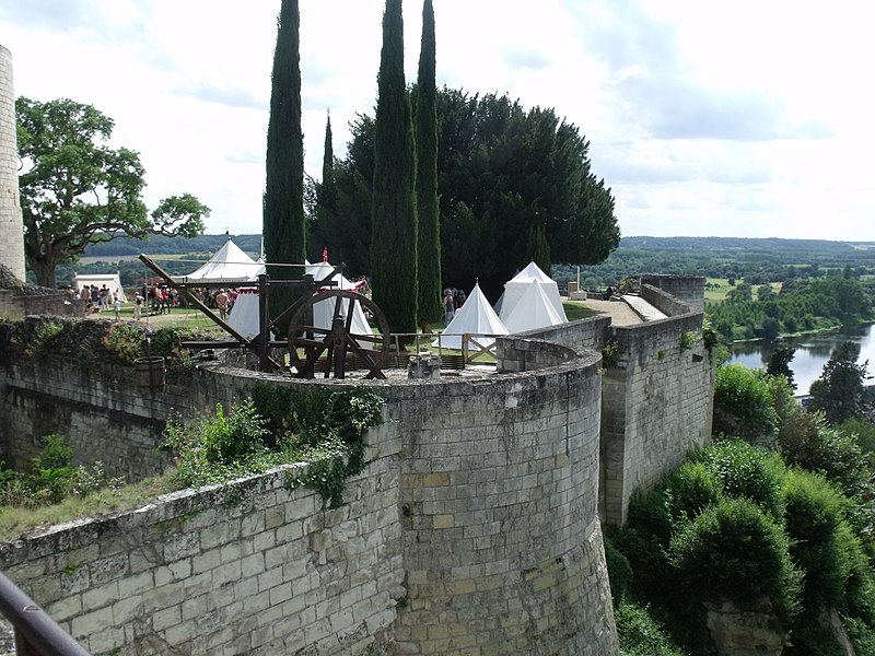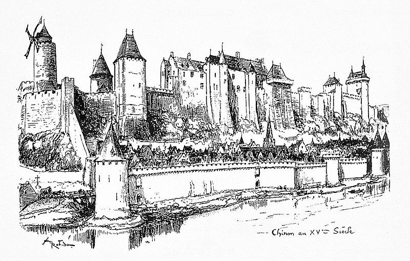 Entre le 18 et le 20 août 1308, Chinon est le lieu d'un épisode lié à l'ordre du Temple : quatre dignitaires, dont Jacques de Molay, y sont retenus et interrogés par des cardinaux, et le parchemin de Chinon, compte rendu de cette entrevue, a été rendu public en 2001. Vers 1370 le duc Louis Ier d'Anjou reconstruit des logis en U autour d'une cour ; au XVe siècle Charles VII donne au complexe sa configuration définitive de trois ailes autour d'une cour et aménage des appartements et salles de réception. C'est à Chinon que Jeanne d'Arc arrive en février 1429 : elle est reçue par le roi lors de deux entrevues, remet une couronne en or et confirme sa mission, épisode décisif pour la reconquête du royaume.