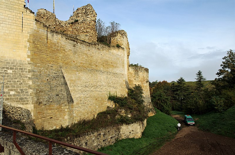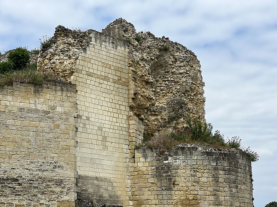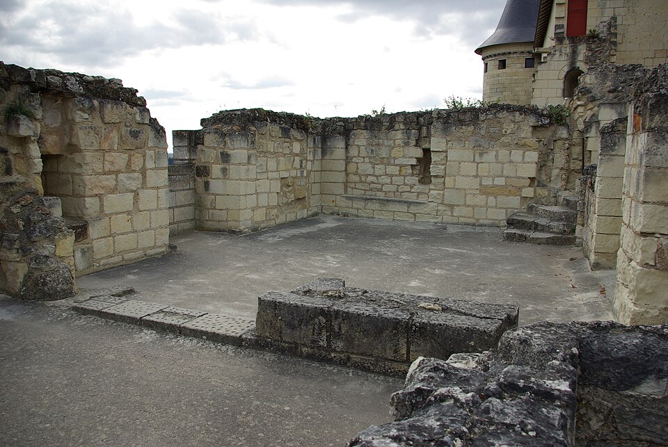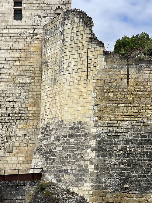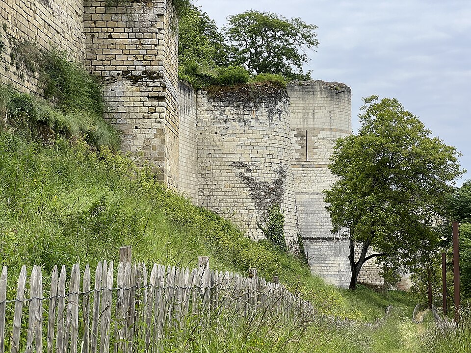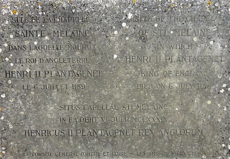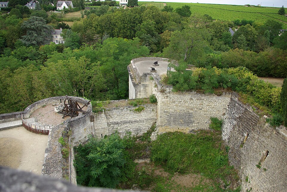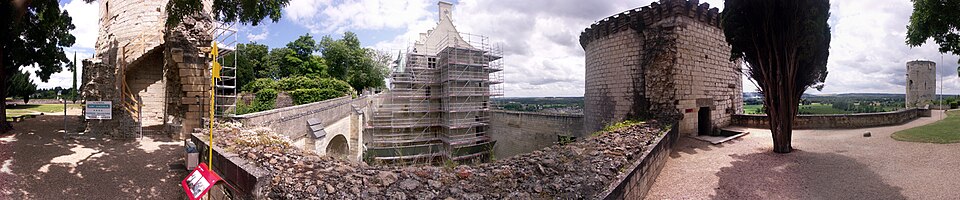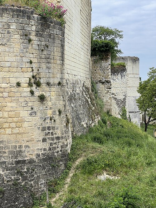 Henri II Plantagenêt fait de Chinon sa capitale continentale ; il y séjourne fréquemment et y installe la « tour du trésor » pour les archives. Il fait édifier le fort Saint‑Georges et un palais comportant une chapelle dédiée à saint Georges. Henri II tient sa dernière cour de Noël à Chinon et meurt dans la chapelle Saint‑Melaine, dont une plaque au sol marque l'emplacement ; son corps est ensuite transporté à Fontevraud. Après des rivalités entre Plantagenêt et Capétiens, Philippe Auguste prend la forteresse en 1205 et renforce ses défenses : l'extrémité orientale est dissociée par un profond fossé, le donjon philippien du Coudray est élevé, des tours de flanquement et des châtelets d'entrée sont ajoutés, dont la porte des Champs. Au début du XIIIe siècle, Jean sans Terre renforce aussi la fortification, en particulier le fort Saint‑Georges, et célèbre à Chinon son mariage avec Isabelle d'Angoulême.