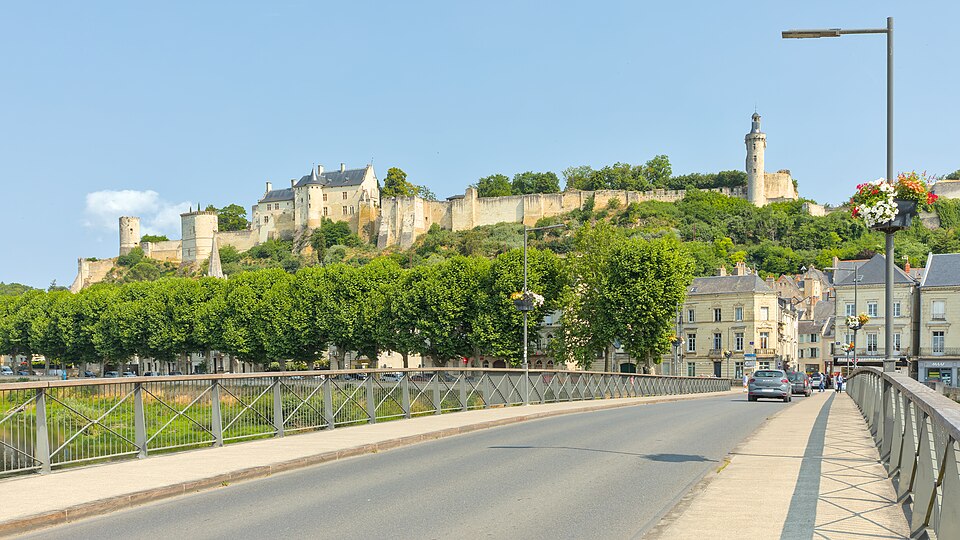 La forteresse royale de Chinon, formée de trois châteaux — le fort du Coudray, le château du Milieu et le fort Saint‑Georges — s'étend sur un éperon rocheux dominant la Vienne, sur la commune de Chinon (Indre‑et‑Loire). Elle commande le passage sur la Vienne, à une quinzaine de kilomètres de son confluent avec la Loire, et s'étire sur environ 300 mètres ; la ville s'est développée au pied de la falaise. L'éperon est compartimenté, d'ouest en est, par des douves sèches instaurées sous Philippe Auguste, qui séparent les trois ouvrages et sont aujourd'hui franchies par des ponts ; chaque château possède une enceinte indépendante. Le château du Milieu, principal ensemble, accueille les logis royaux et le prieuré Saint‑Melaine.