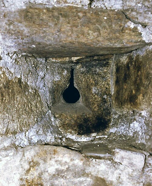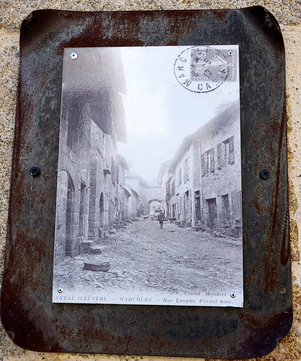 Les fortifications de Marcolès entouraient la ville médiévale et en conservent aujourd’hui le tracé ainsi que deux portes. Le portail haut, côté ouest, a été reconstruit au XIXe siècle, tandis que le portail bas, côté est, a gardé l’essentiel de ses dispositions médiévales : un passage en voûte en berceau, une rainure pour la herse, une façade percée d’archères cruciformes et ornée d’un blason aux armes de la famille Boisset daté du XVe siècle. La porte basse, inscrite au titre des monuments historiques par arrêté du 19 mai 2003, présente encore des traces d’un accès défensif comprenant meurtrières, un escalier menant à une salle au‑dessus de la voûte, une herse et une lourde porte à deux vantaux dont les gonds sont visibles. On note aussi, sous le niveau actuel et dans la cave au pied du portail bas, une arbalétrière‑canonnière latérale combinant une fente d’archère et une bouche de feu pour armes à feu de faible calibre. Le plus ancien élément connu est semble‑t‑il une tour seigneuriale datée de 1203, complétée au XIIIe siècle par une première enceinte circulaire d’environ 430 mètres de périmètre, désignée en 1277 comme le castrum de Marcolès. Des vestiges de cette phase subsistent à la base des murs de soutènement des maisons du secteur sud‑est. L’extension intra‑muros dite « balat vieil » témoigne d’un agrandissement au XVe siècle ; l’ensemble fortifié fut alors porté à environ 720 mètres de périmètre, nécessitant l’élargissement du fossé. L’enceinte, principalement composée d’habitations, présentait des façades aveugles du côté exposé aux attaques et comportait au moins une tour près du portail haut. La mémoire collective associe au lieu‑dit de la « Fausse Porte », près de l’église, un épisode de prise du bourg durant la guerre de Cent Ans, sans que cette hypothèse soit entièrement confirmée ; une campagne de fouilles de sauvegarde menée en 1989 a mis au jour un rempart long de 12 mètres et large d’environ 1,2 mètre, précédé d’un fossé implanté à quelque quatre mètres du mur d’enceinte. L’éperon, promontoire qui constitue le site originel des fortifications, domine le faubourg Saint‑Martin sur son flanc est d’environ vingt mètres et a été utilisé dès le XIIIe siècle pour suivre la configuration naturelle du relief. L’ensemble fortifié a été agrandi et renforcé à la première moitié du XVe siècle, consolidant les défenses à la fin de la guerre de Cent Ans.