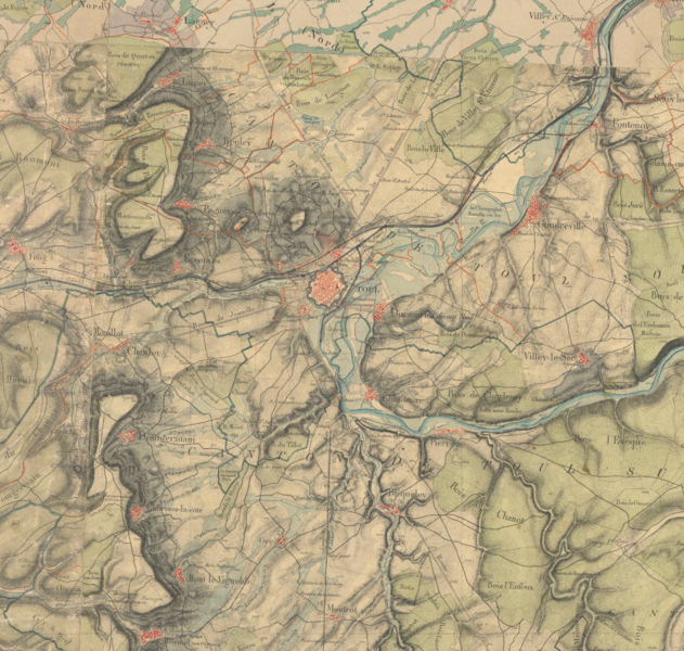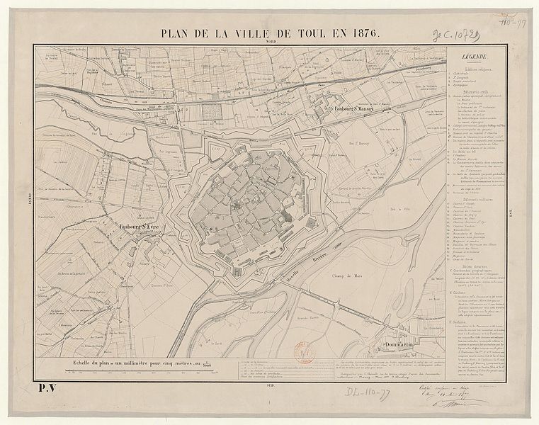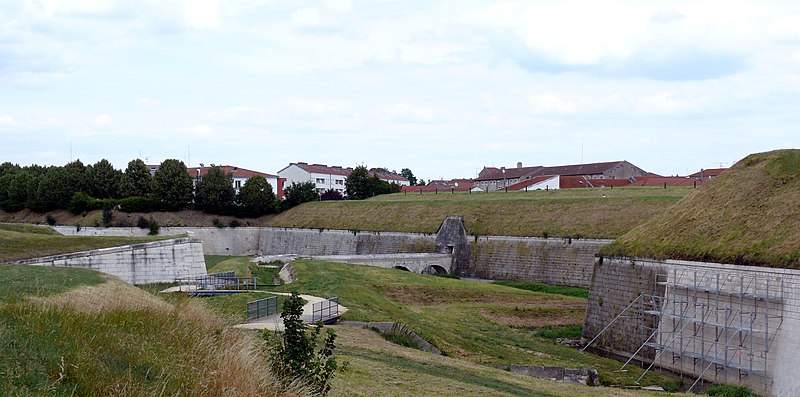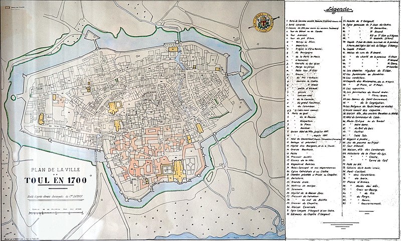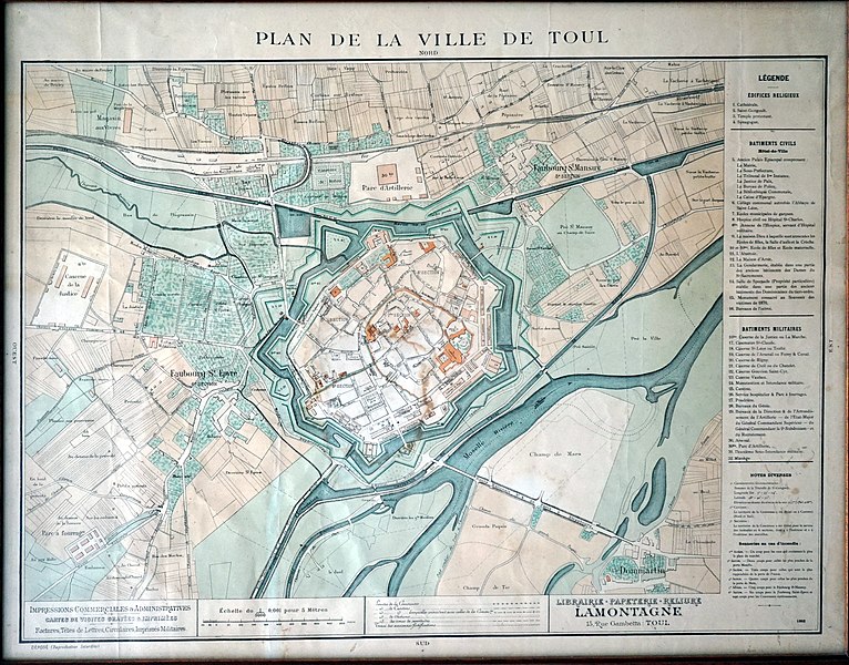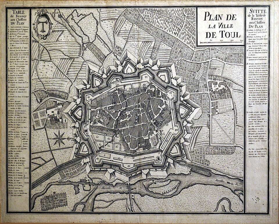 Les fortifications de Toul sont classées au titre des monuments historiques depuis 1941 ; la porte de Metz est inscrite depuis 1929. Après le traité de Ryswick en 1697, Toul retrouve une valeur stratégique : le roi de France lui donne le statut de place de troisième ligne et Vauban conçoit en 1698 une nouvelle enceinte. Cette enceinte, percée de trois portes et accompagnée d’un développement vers le sud‑est, voit ses travaux commencer en 1699-1700 ; en 1712 les escarpes sont revêtues. Les ouvrages ne seront toutefois jamais achevés : contrescarpes et demi‑lunes sont ajournées pour des raisons budgétaires, sauf une demi‑lune construite en 1725 pour protéger l’entrée de l’Ingressin. Le siège de 1814 met en évidence le manque d’entretien ; des travaux de confortement sont exécutés de 1822 à 1844 et deux casernes de siège sont élevées dans les bastions 38 et 45, en 1832 et 1842. En 1846, le canal est intégré à l’appareil défensif et l’on construit un corps de garde surmontant, la canonnière. Les sièges de 1870 confirment l’obsolescence des enceintes face à la puissance de l’artillerie, qui impose la création de défenses en avant du centre urbain. Après le traité de Francfort et l’annexion de l’Alsace‑Moselle, Toul acquiert une importance stratégique majeure ; c’est le général Séré de Rivières qui dote la ville d’une nouvelle enceinte constituée de forts situés à cinq à sept kilomètres. Entre 1874 et 1914, une infrastructure reposant sur seize ouvrages fait de Toul l’une des plus grandes places fortes. L’enceinte de Vauban est conservée comme enveloppe du noyau central et renforcée : de nouvelles casemates sont construites et les portes Moselle et de France sont élargies et reconstruites en 1882‑1883. La construction en 1886 de la première caserne à l’extérieur de l’enceinte permet ensuite à la ville de se développer au‑delà de cette enceinte ; au sud‑est, le faubourg Saint‑Evre s’étend et sera relié au centre par la porte Jeanne d’Arc percée en 1901. Déclassées en 1922, les fortifications sont néanmoins conservées en raison de la présence de nombreux établissements militaires ; à l’est, les fossés sont remblayés avec les gravats du bombardement de 1940. Après la guerre, les abords de la porte de Metz sont nivelés et une percée est réalisée pour le passage de la route nationale 4 entre les portes Moselle et de France. Parmi les éléments signalés figurent l’enceinte de Toul, la cathédrale Saint‑Étienne et la porte Moselle.
