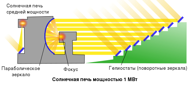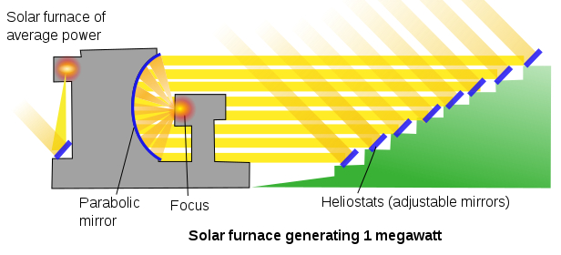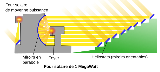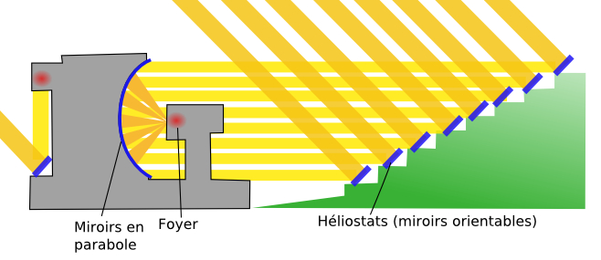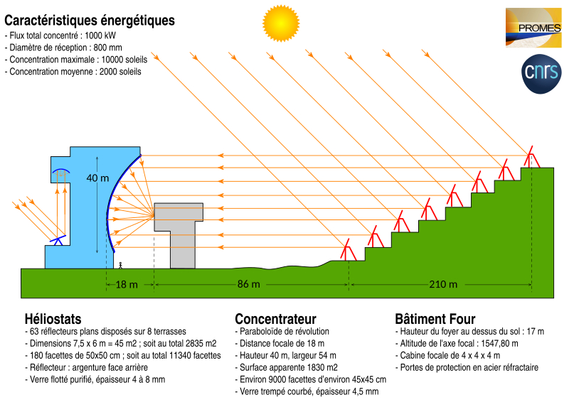 Le principe de fonctionnement repose sur la concentration des rayons solaires par des miroirs réfléchissants. Les rayons sont d'abord renvoyés par 63 héliostats orientables, puis dirigés vers un concentrateur en parabole qui les fait converger vers une cible quasi circulaire au sommet d'une tour. La tache solaire concentrée mesure environ un mètre de diamètre et atteint jusqu'à 10 000 "soleils", soit 1 × 10^7 W/m2 au centre. Le taux de concentration et la température obtenue peuvent être modulés en agissant sur le nombre et le choix des héliostats utilisés, sur l'ouverture des portes de protection du foyer et selon les conditions météorologiques locales, dont l'énergie directe normale varie environ de 0 à 1 100 W/m2 à Odeillo. La contribution des héliostats diffère selon leur position : les héliostats dits centraux, proches de l'axe optique, concentrent davantage que les plus éloignés, et ceux situés en bas du flanc de montagne, plus proches de la parabole (à partir de 104 m), produisent un faisceau moins étalé que ceux plus distants (jusqu'à 314 m).